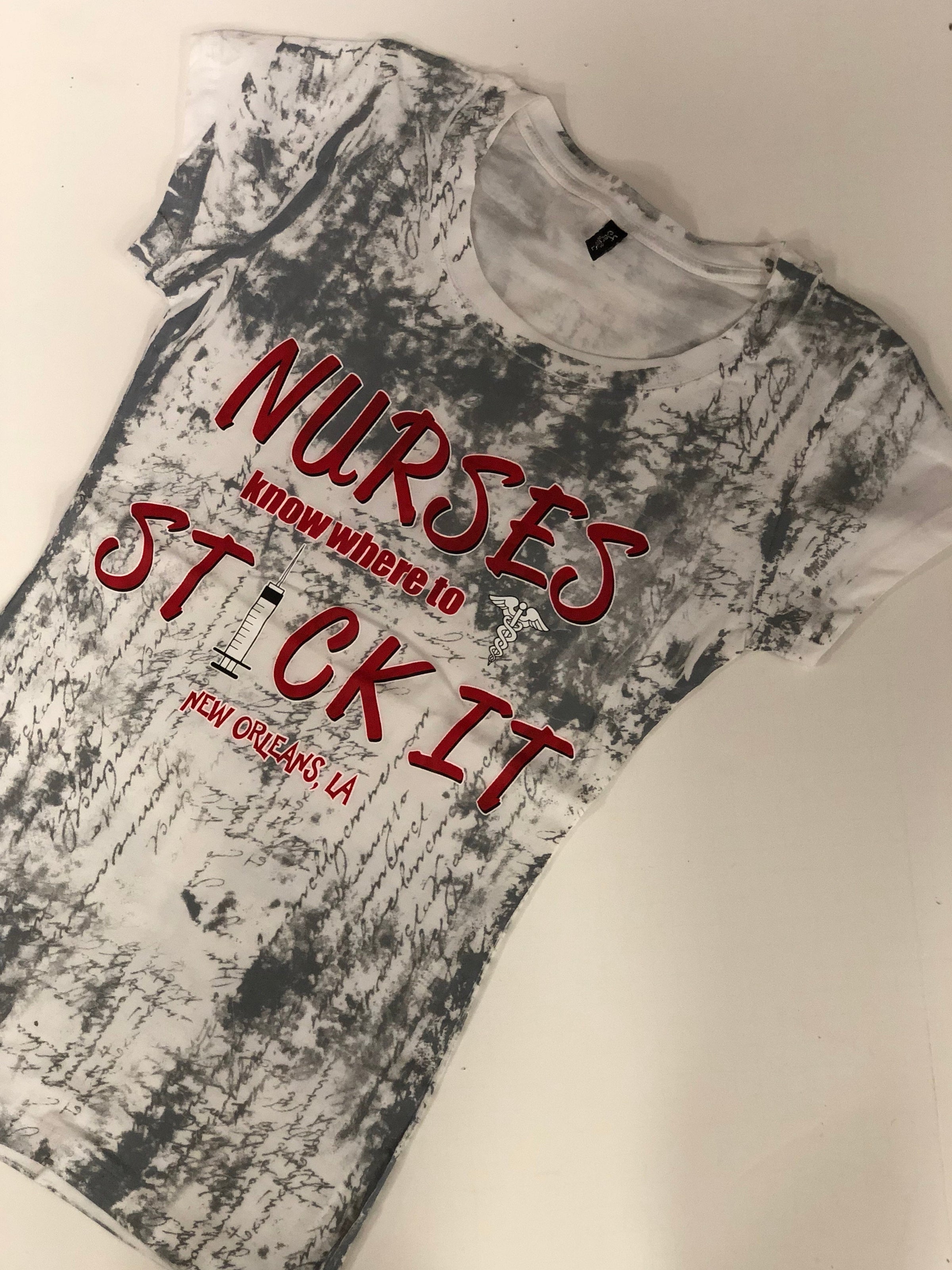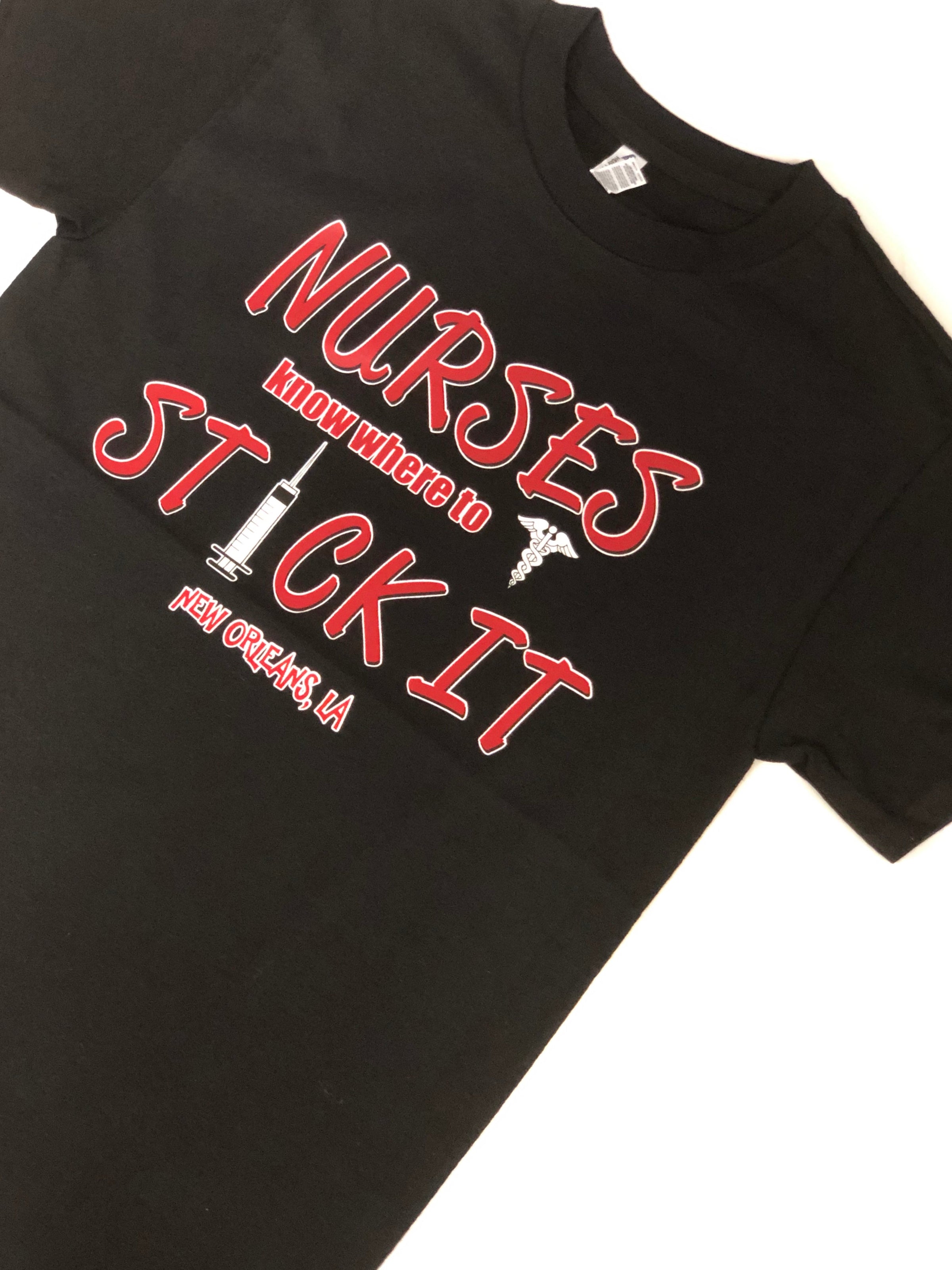 This t-shirt is perfect for any nurse! It reads "Nurses Know Where to Stick It" with a syringe