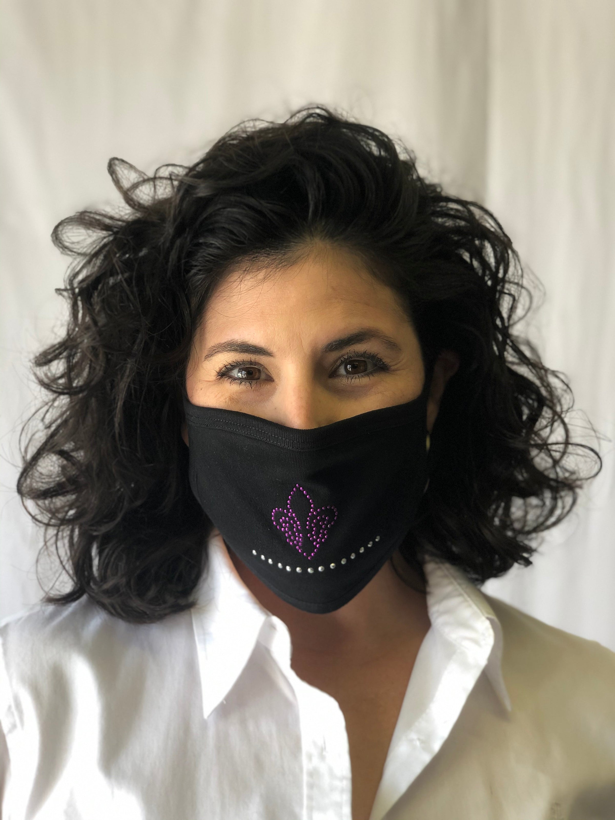 Mask Up in style! This black reusable face mask features a pink rhinestone fleur de lis and ear loops. One size fits most.