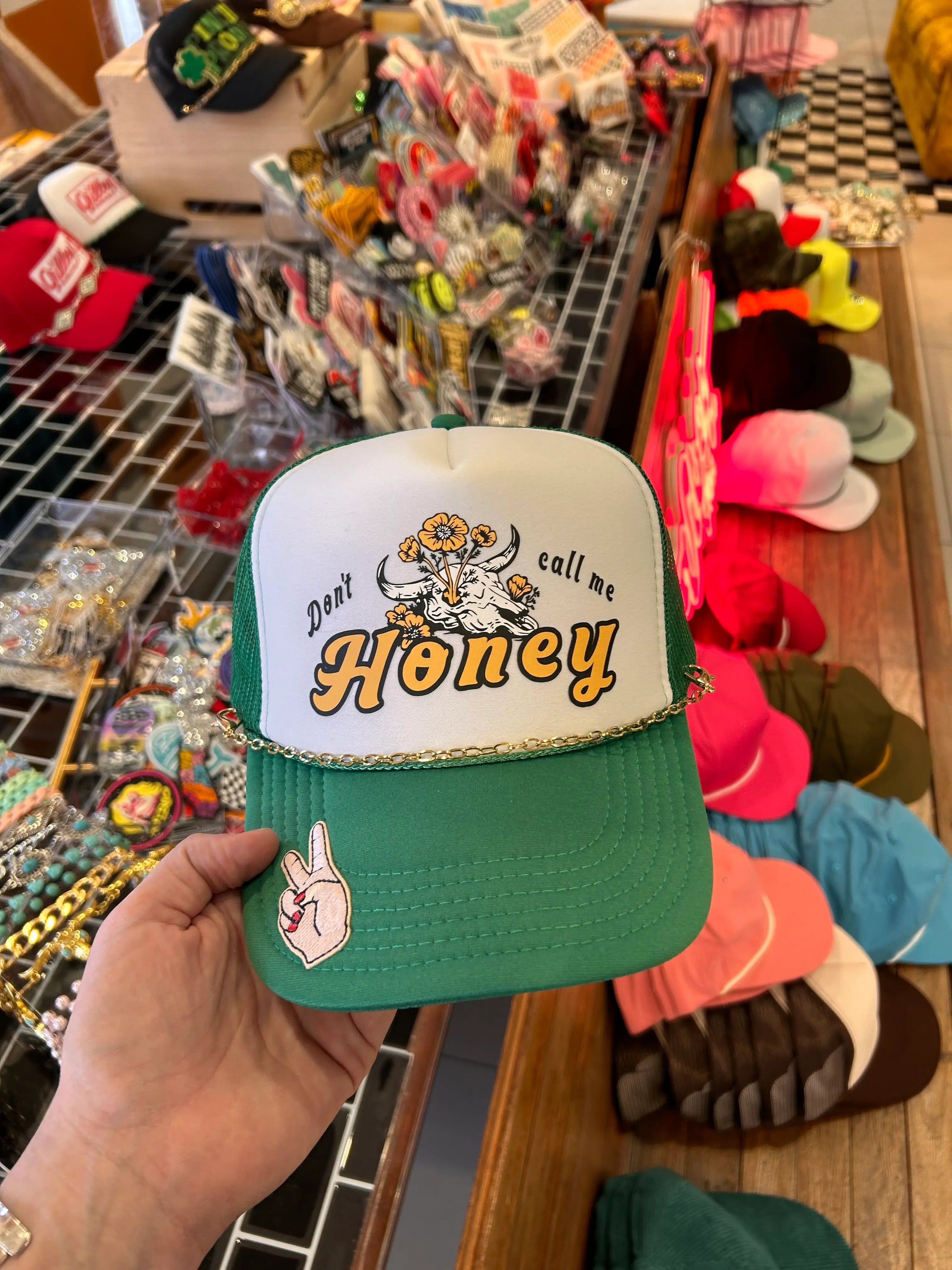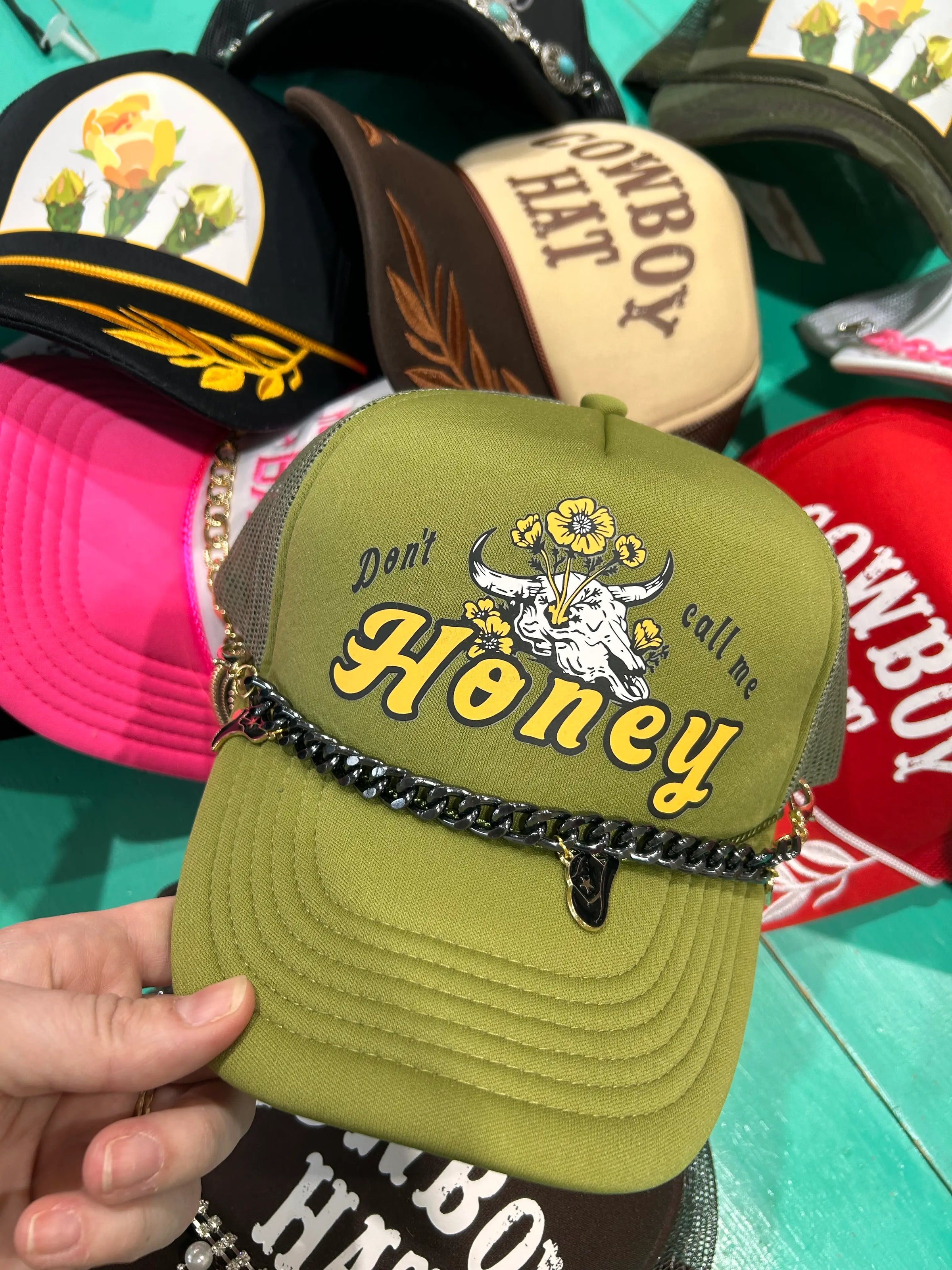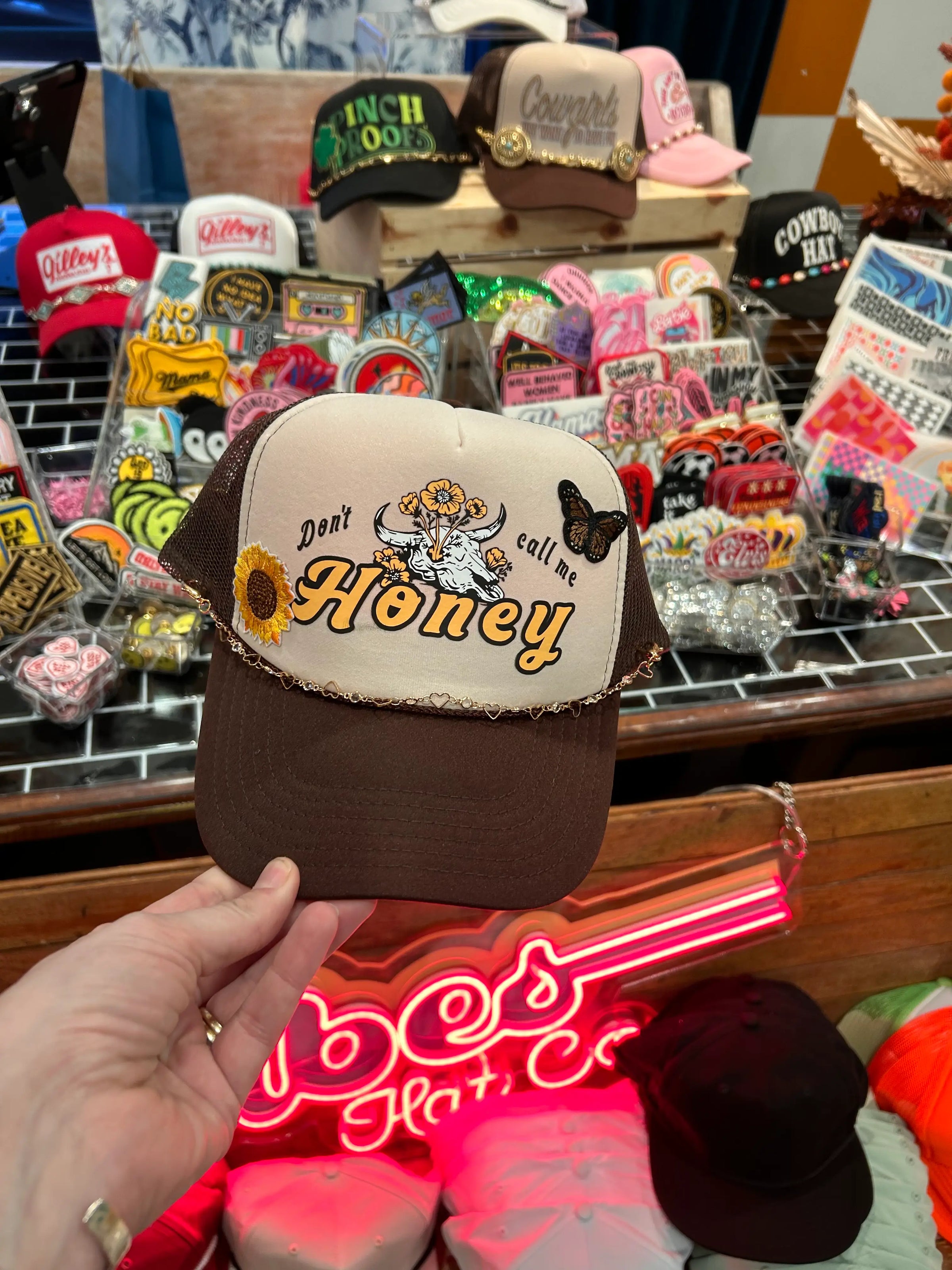 Don't Call Me Honey is a retro western inspired cap design. This design is printed onto either a foam trucker or one of Vibes Retro Rope hats! Foam truckers have a foam front, mesh back, and adjustable snapback enclosure. The Vibes Retro Rope Hats are nylon caps with an adjustable snapback enclosure.