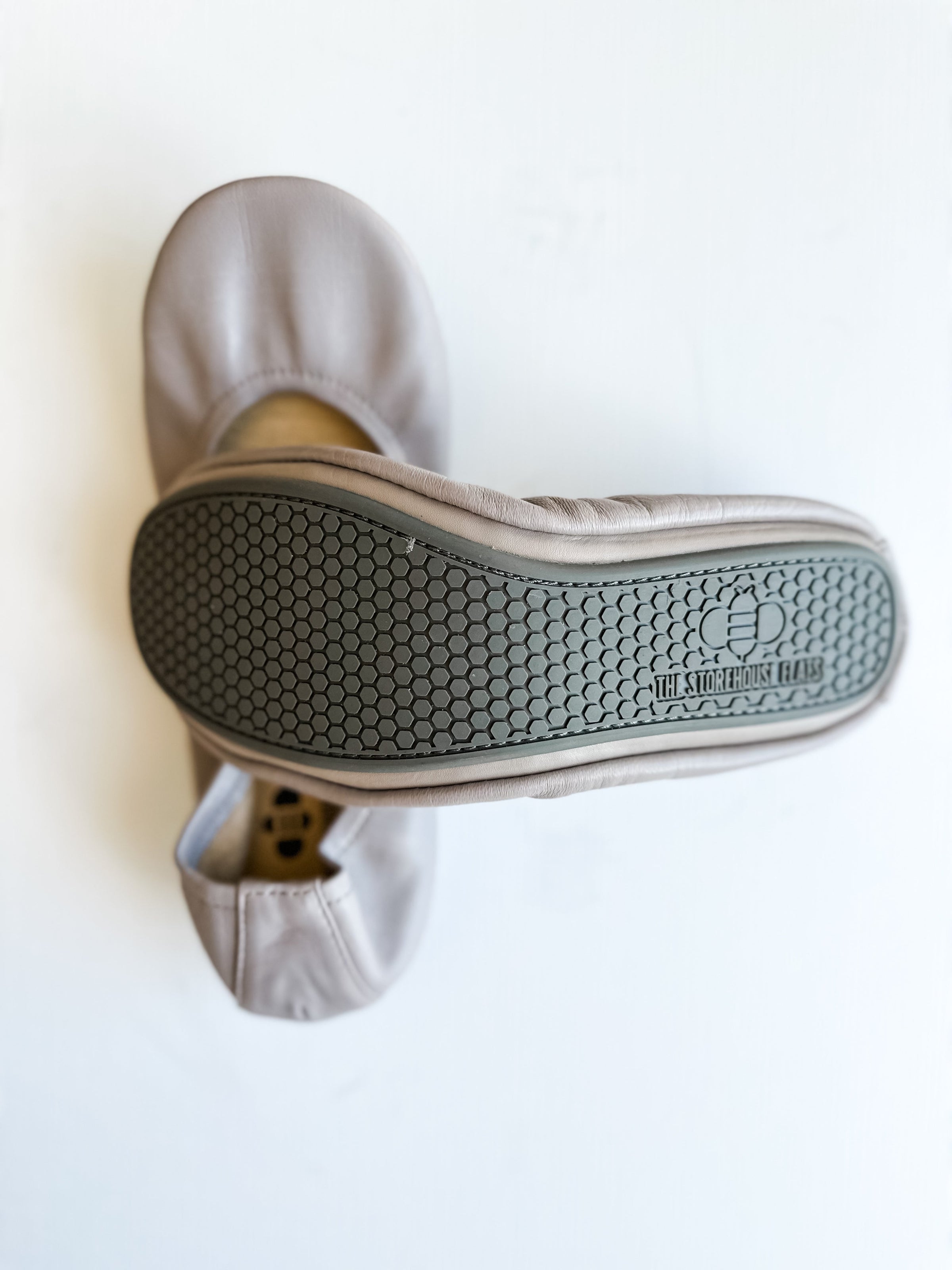 All of our The Storehouse Flats ballet flats feature a full coverage flexible sole! Comfort is our number one priority and this new sole checks that box. Not only is it comfy but the flats are foldable for easy travel and storage. The Storehouse Signature Collection is the softest leather we could find, with a slightly embossed texture.