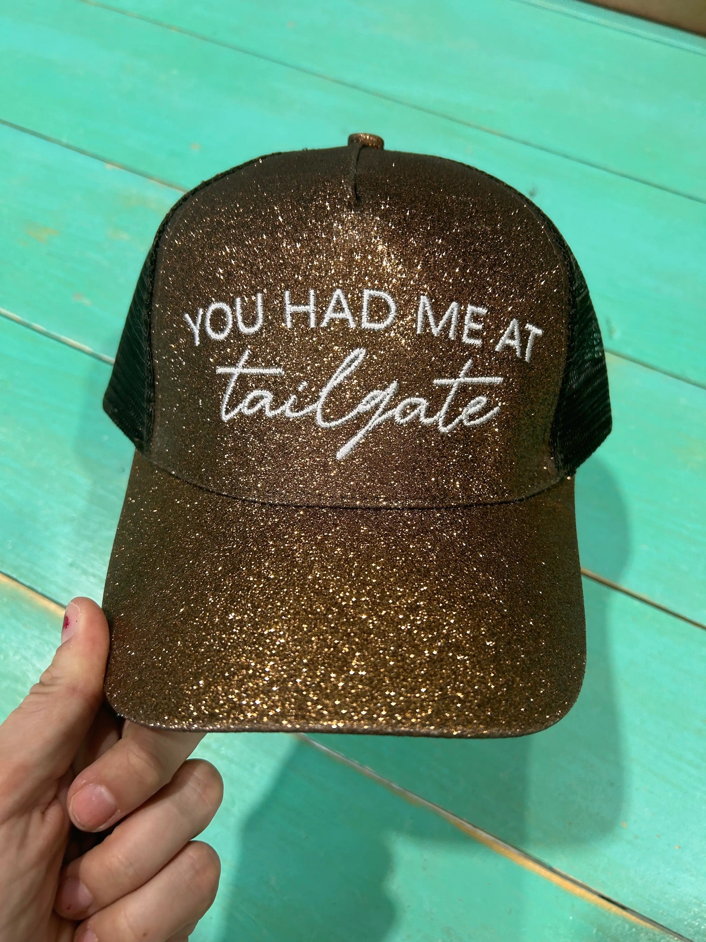 You Had Me At Tailgate design embroidered on our Vibes Brown Glitter ponytail cap. Adjustable enclosure. Ponytail opening.