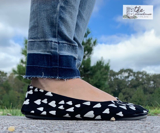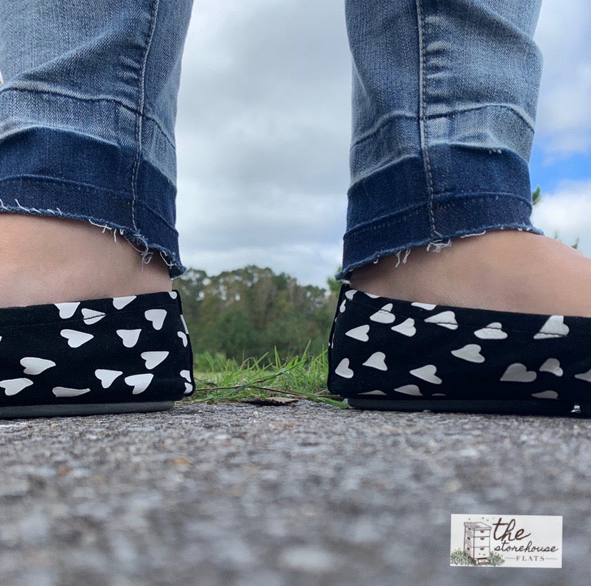 Our Heart to Heart Storehouse Flats are a gorgeous black suede with printed white hearts. This suede is at the top of our customer favorites!