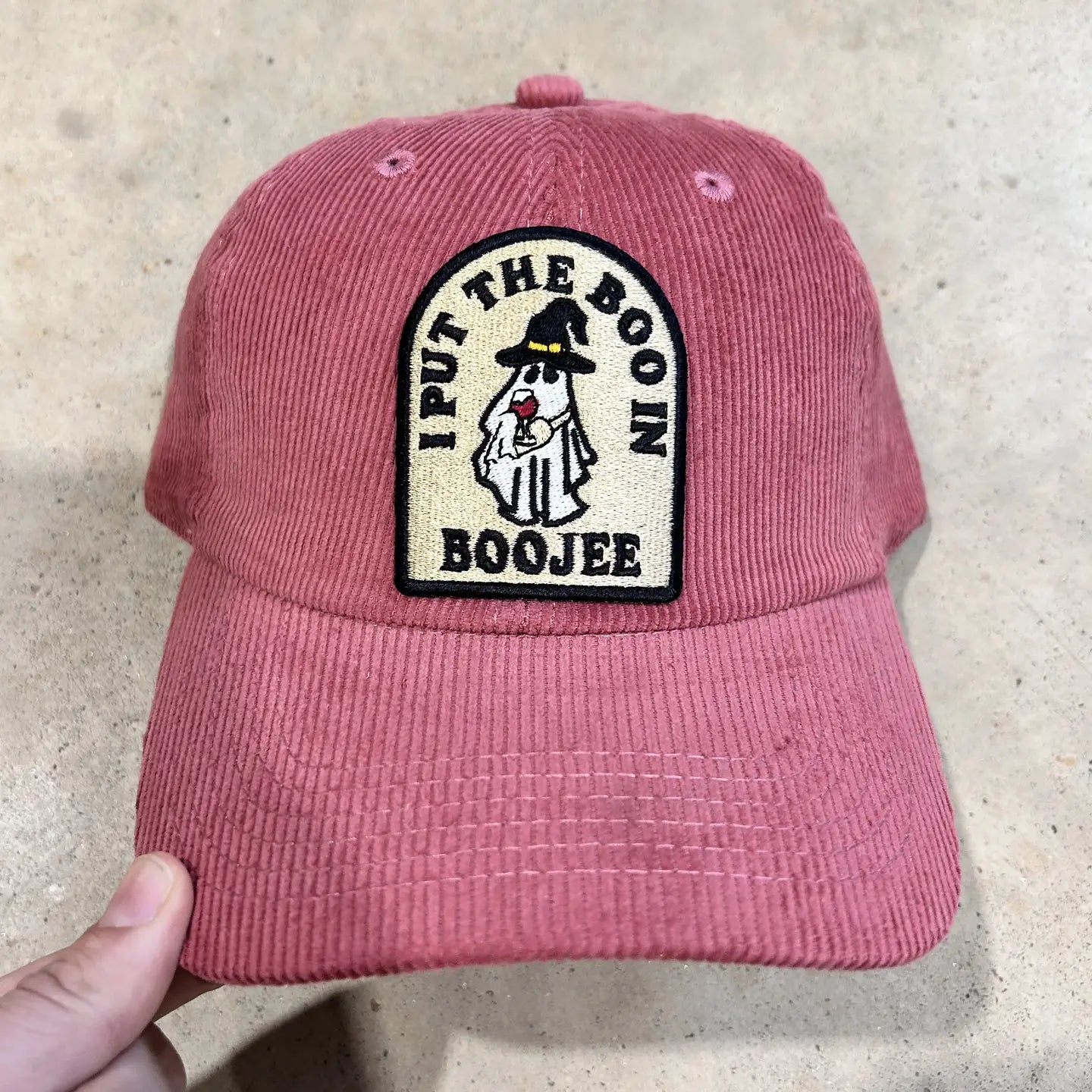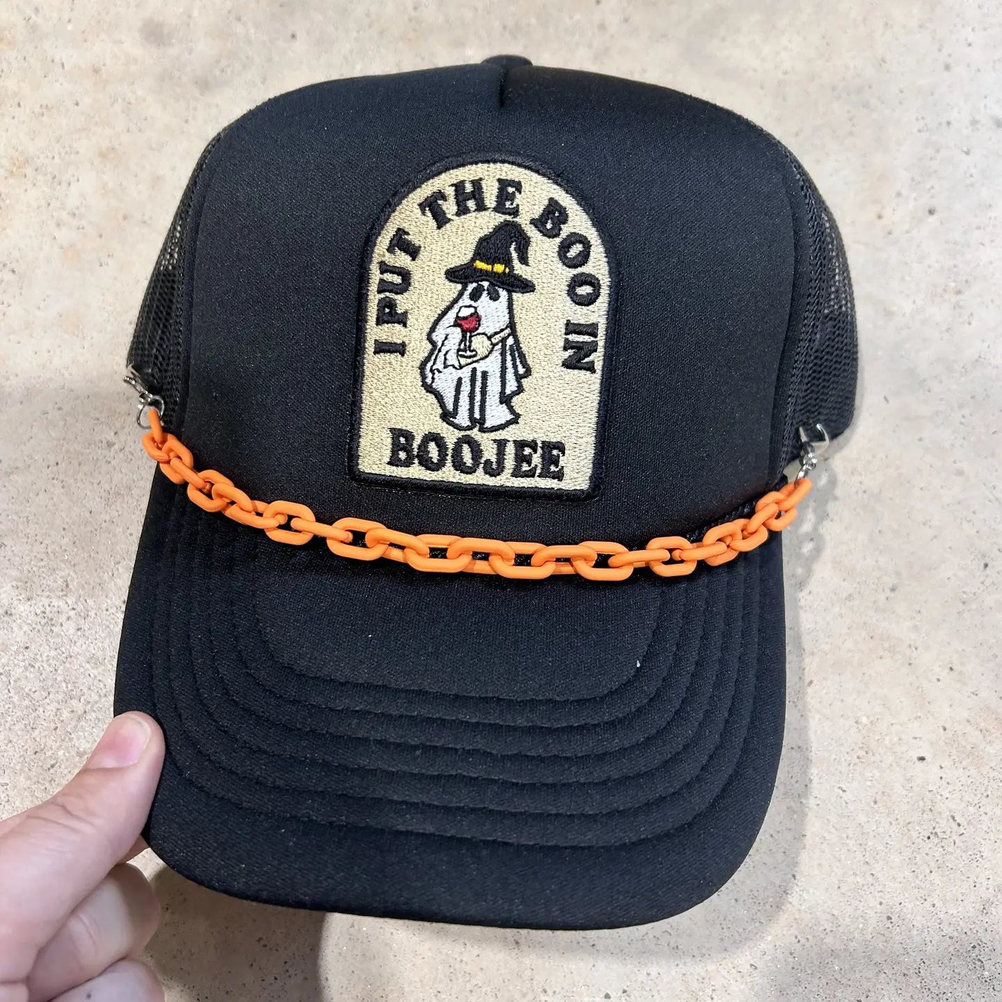 How stinkin' cute is this "I put the BOO in BOOJEE" ghost trucker hat! Our patch is embroidered & on your favorite style cap. Foam truckers have a foam front, mesh back, and adjustable snapback enclosure. Our maroon corduroy dad hat is lightweight, unstructured, and has an adjustable Velcro enclosure. Don't forget to pair with one of our trucker hat chains for the perfectly BOOJEE hat.