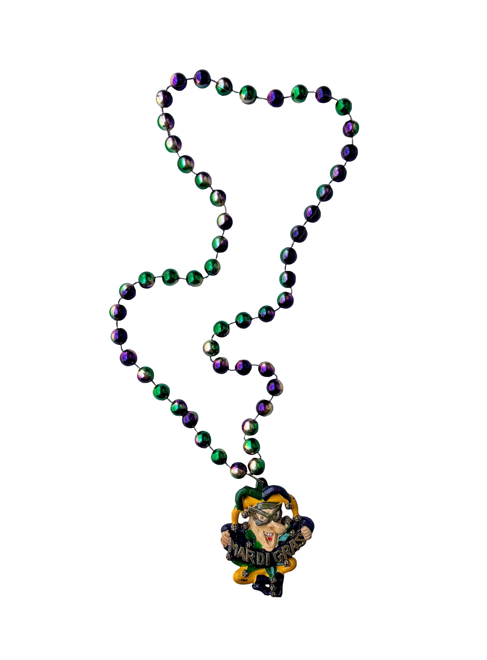 Catch the carnival spirit with our whimsical Jester with Mask Specialty Bead! This parade-worthy treasure features a playful jester holding a Mardi Gras sign, dangling from a vibrant multicolor bead strand. Perfect for tossing from floats, collecting as a keepsake, or adding festive flair to your celebration. Let this mischievous masked character bring the magic of Mardi Gras to your next parade or party!