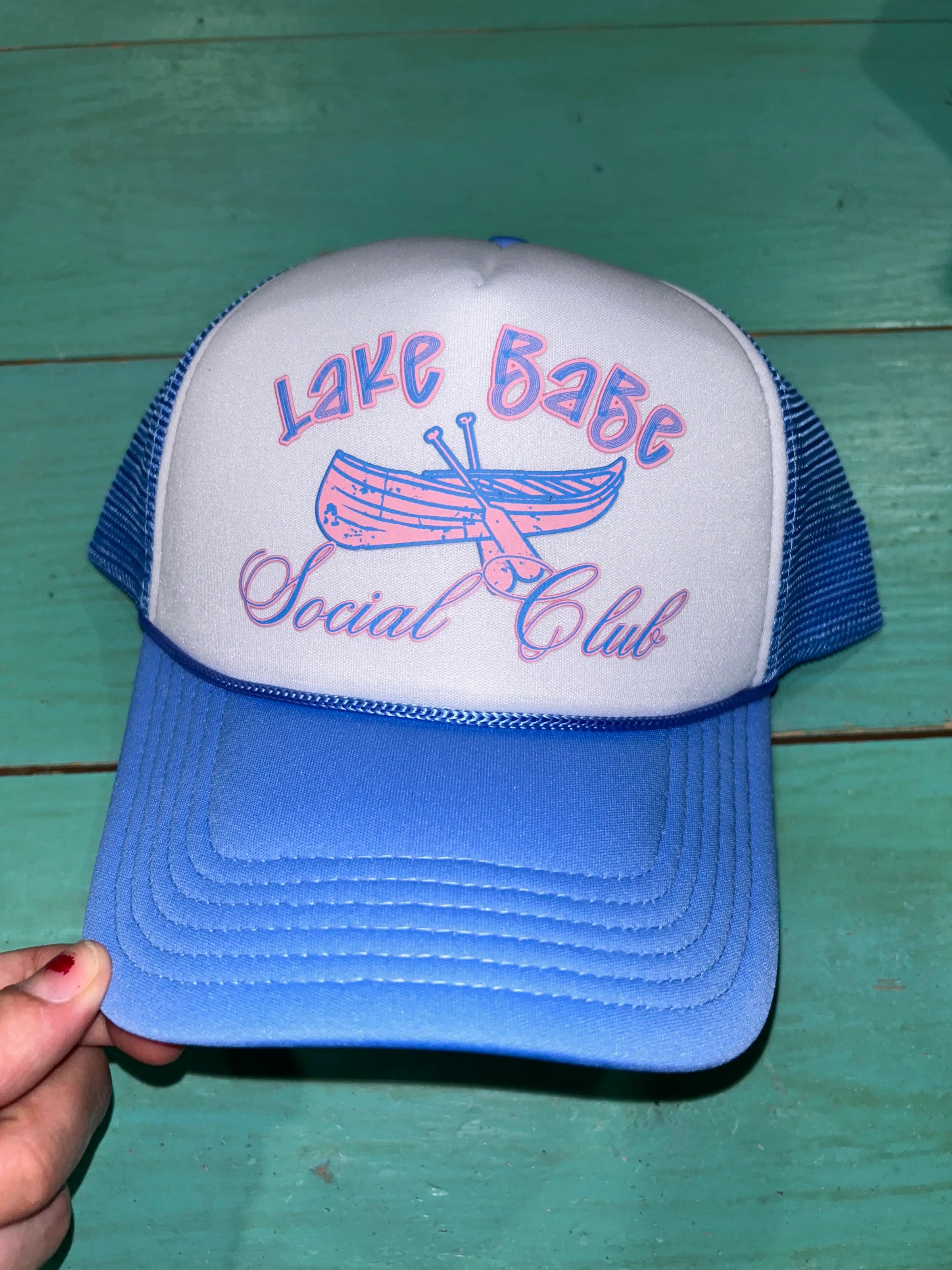 Lake Babe Social Club design printed on your favorite color foam trucker hat. Foam truckers have a foam front, mesh back, and an adjustable snapback enclosure. Add one of our trucker hat chains and you are lake day ready!