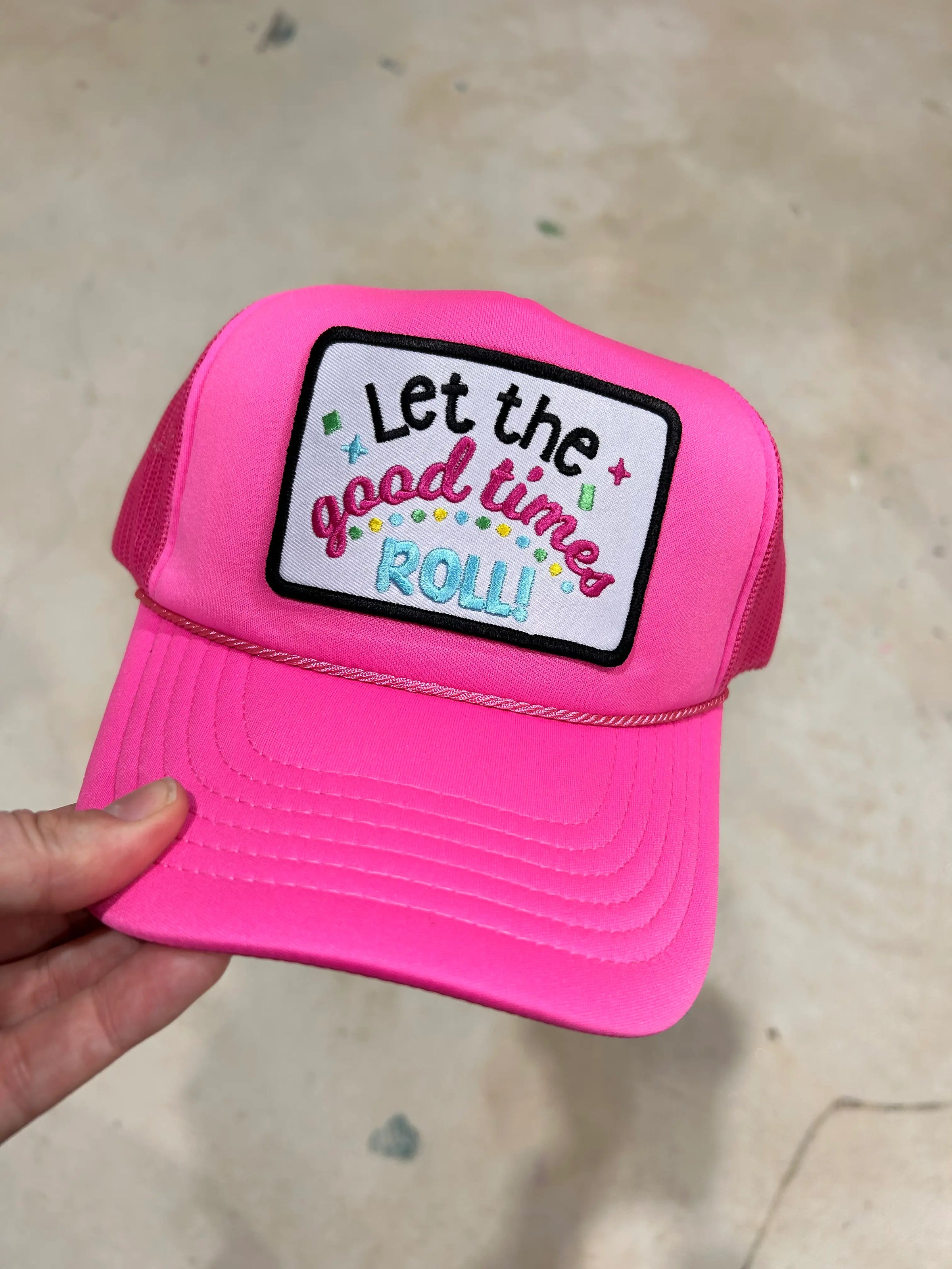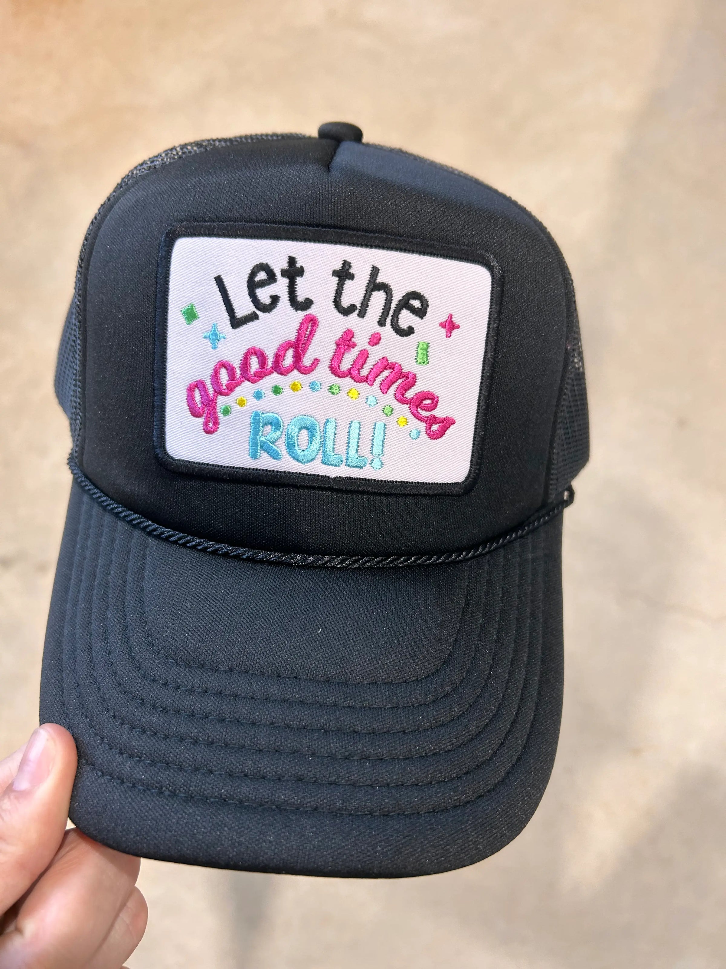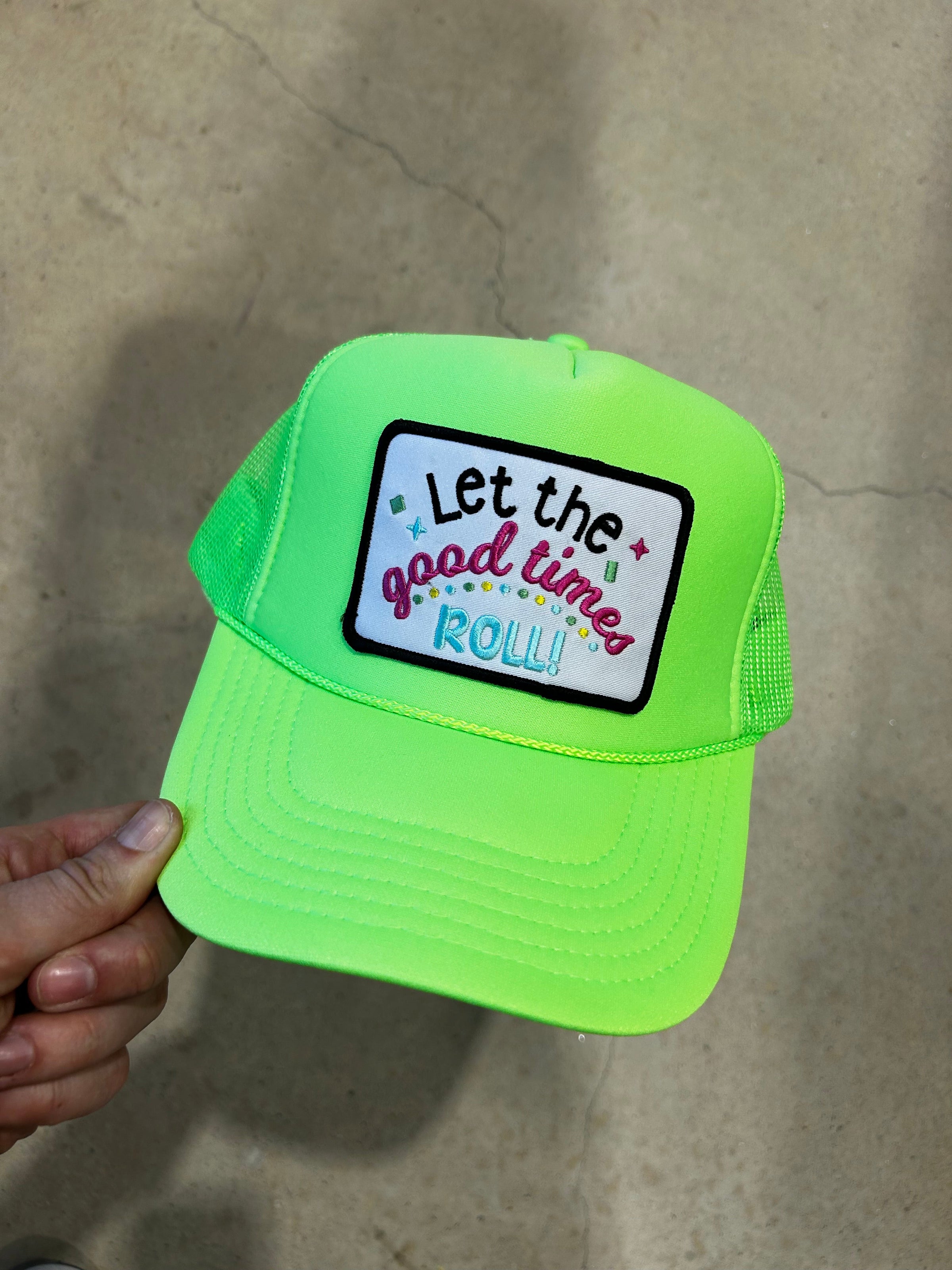 Let The Good Times Roll embroidered patch on your favorite trucker hat. Foam trucker hats have a foam front with a mesh back and an adjustable snapback enclosure.