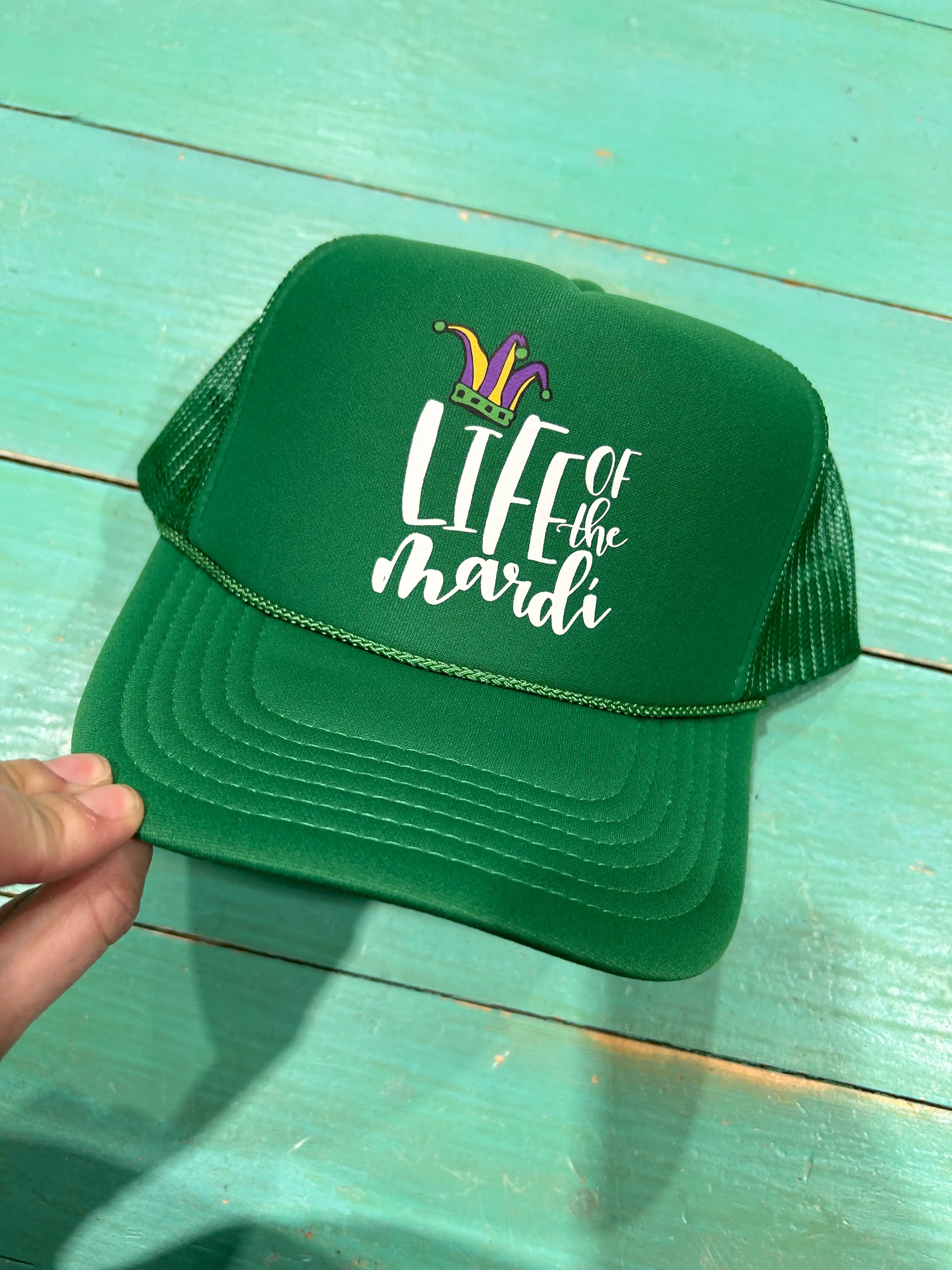 Life of the Mardi design screen printed onto a kelly green foam trucker hat. Hat has a foam front with a mesh back and adjustable snapback enclousre. Pair it with one of our trucker hat chains & you are ready to geaux!