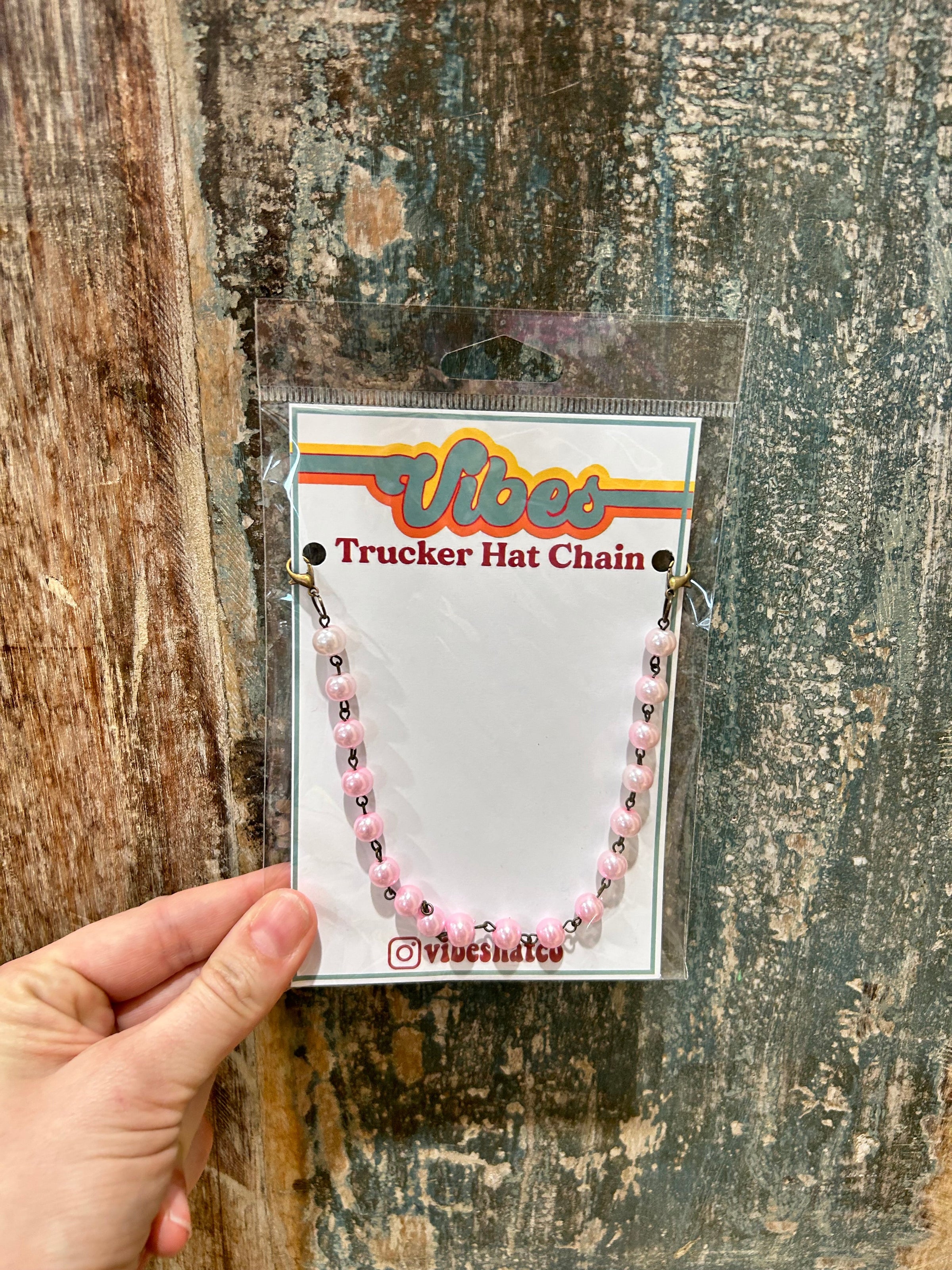 If you love our pearl trucker hat chains you are going to love it in PINK! Now available in limited quantities is the light pink pearl trucker hat chain. Each trucker hat chain comes individually wrapped for retail purposes. All Vibes Hat Co trucker chains have lobster claw clasps on each end so they can be moved from cap to cap.