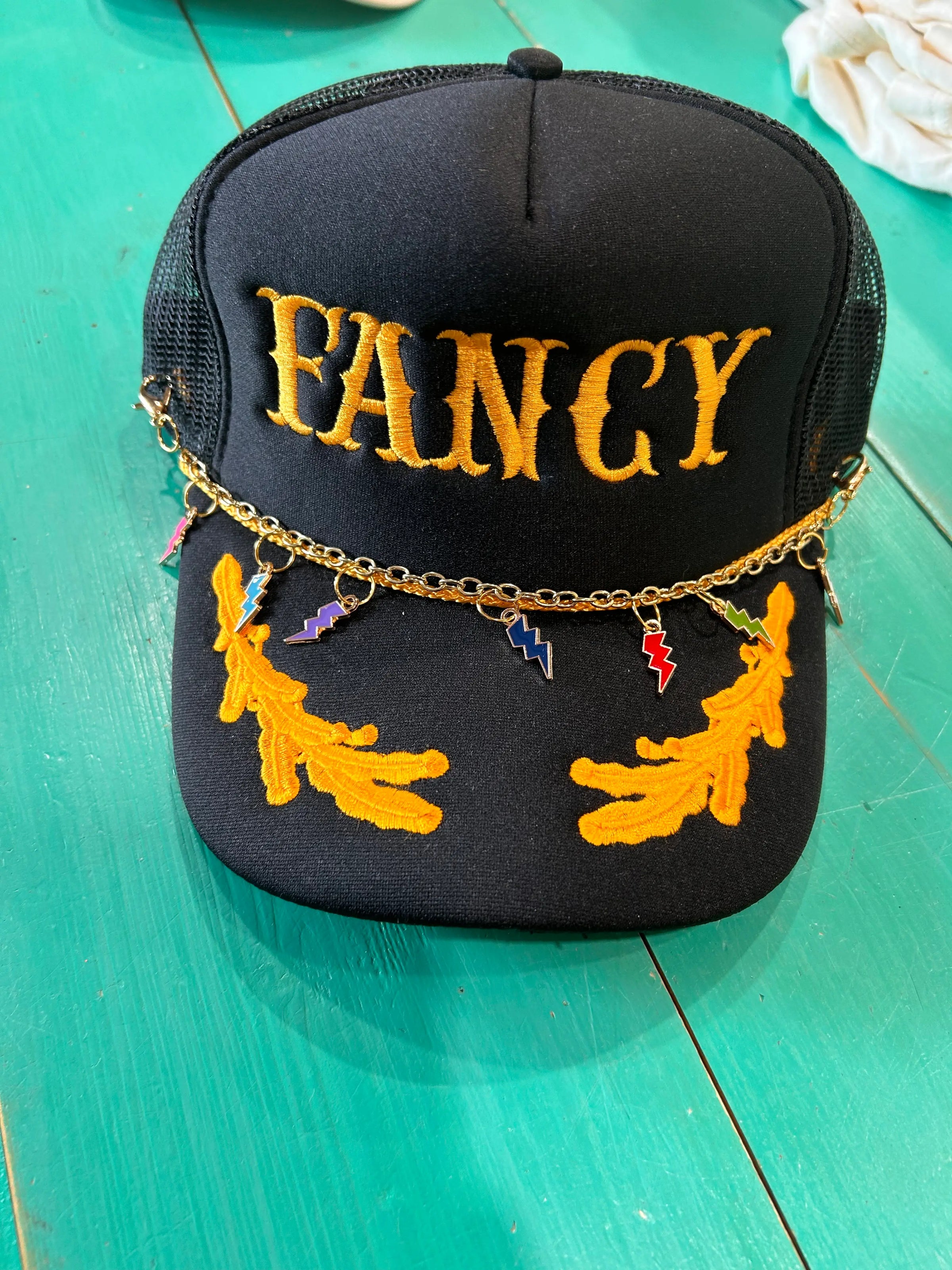 Vibes Hat Company gold trucker hat chain with lightning bolt charms. Each chain has lobster claws so you can add extra flair to your favorite trucker hats!