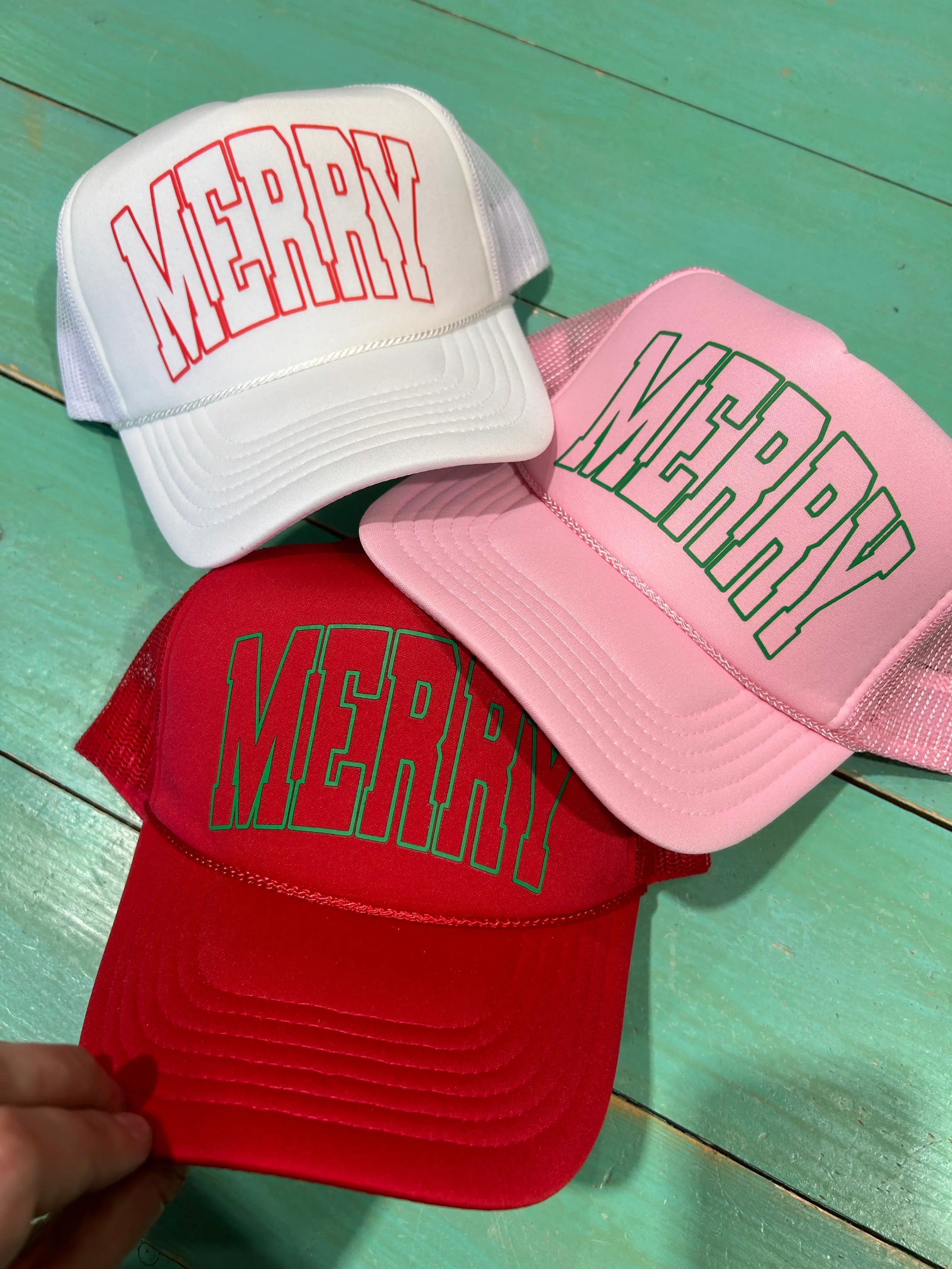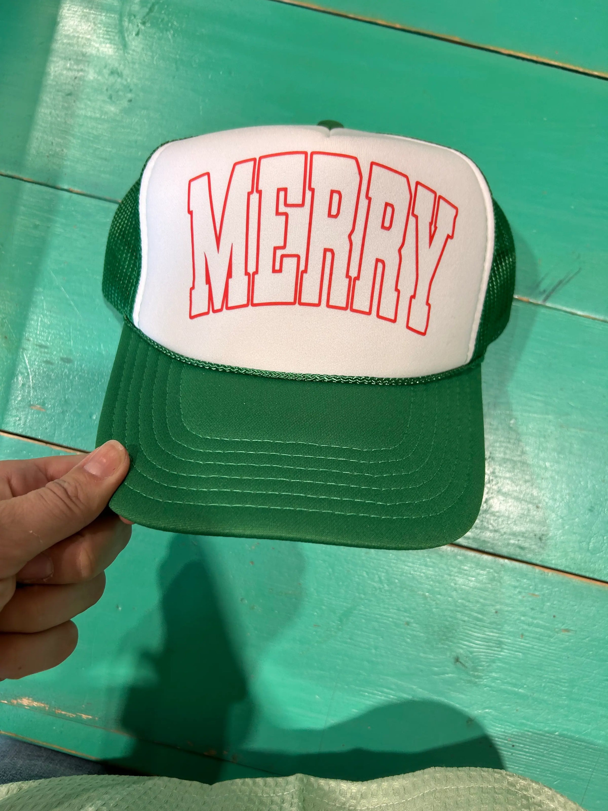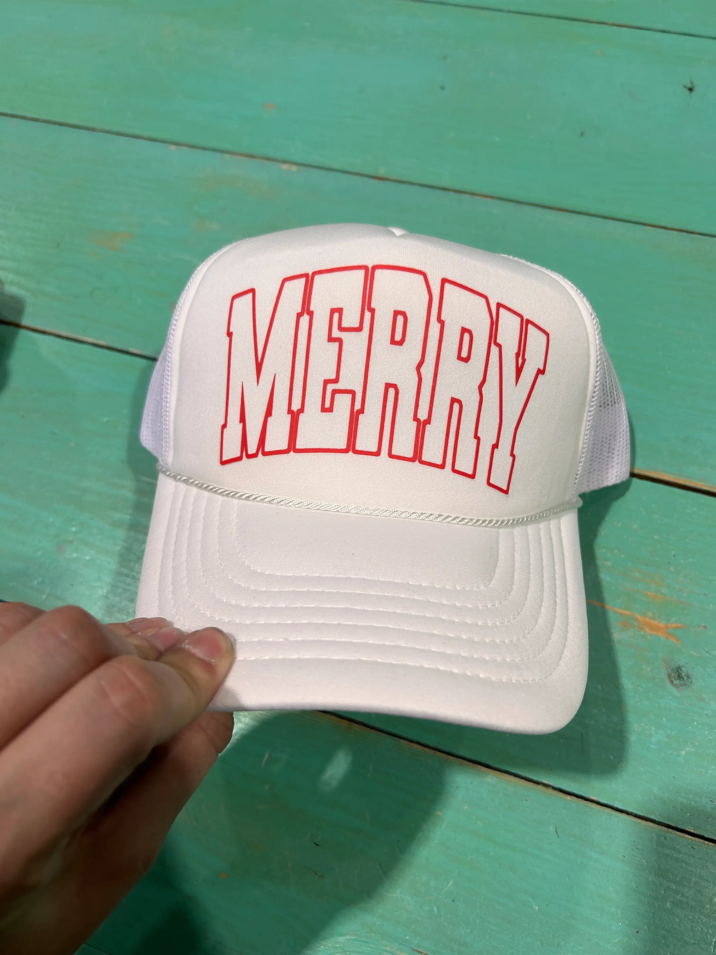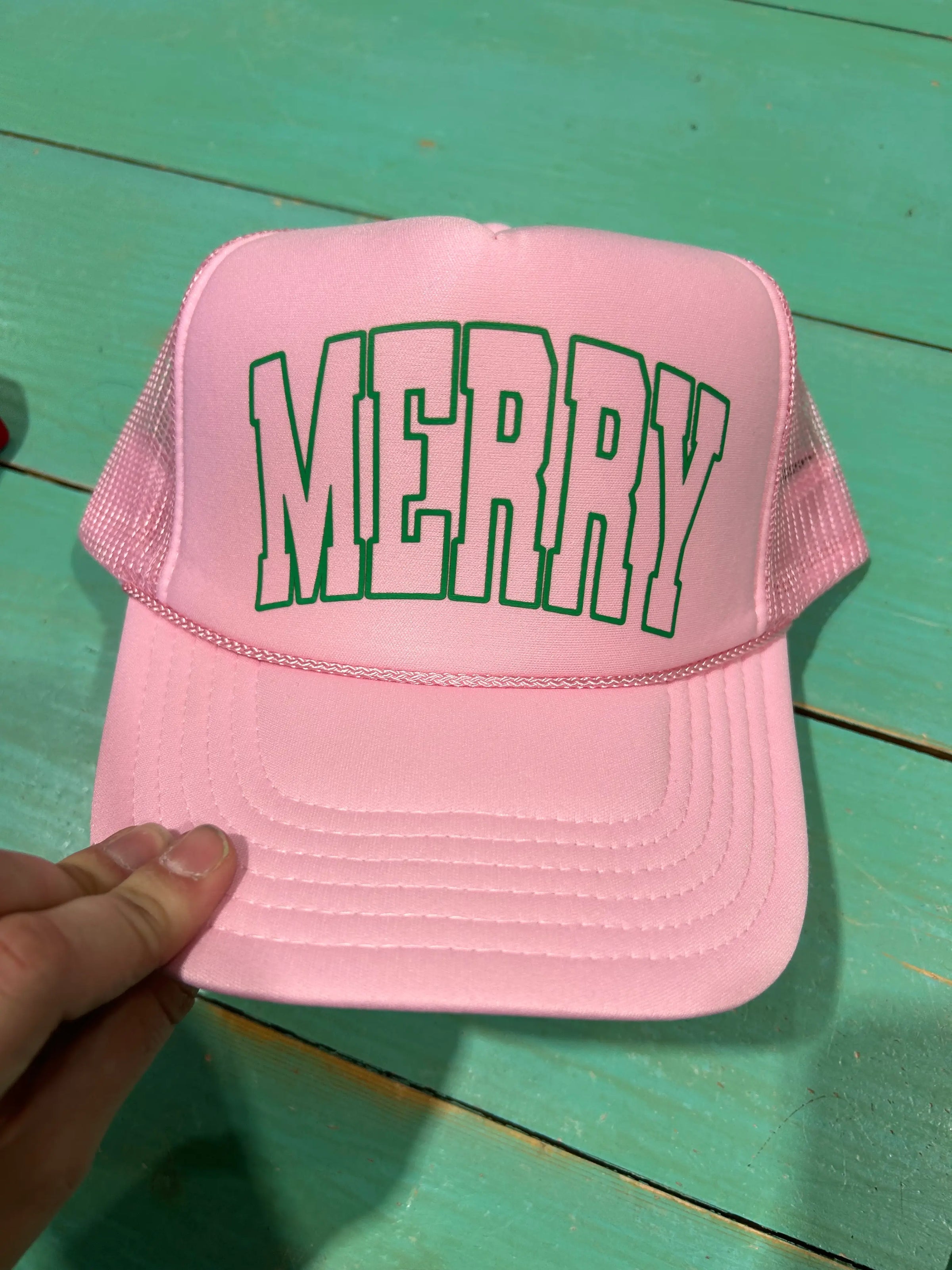Merry screen printed trucker hat. Foam trucker with adjustable snapback enclosure. The perfect Holiday Trucker hat to encompass your Merry spirit. Great holiday accessory or stocking stuffer!