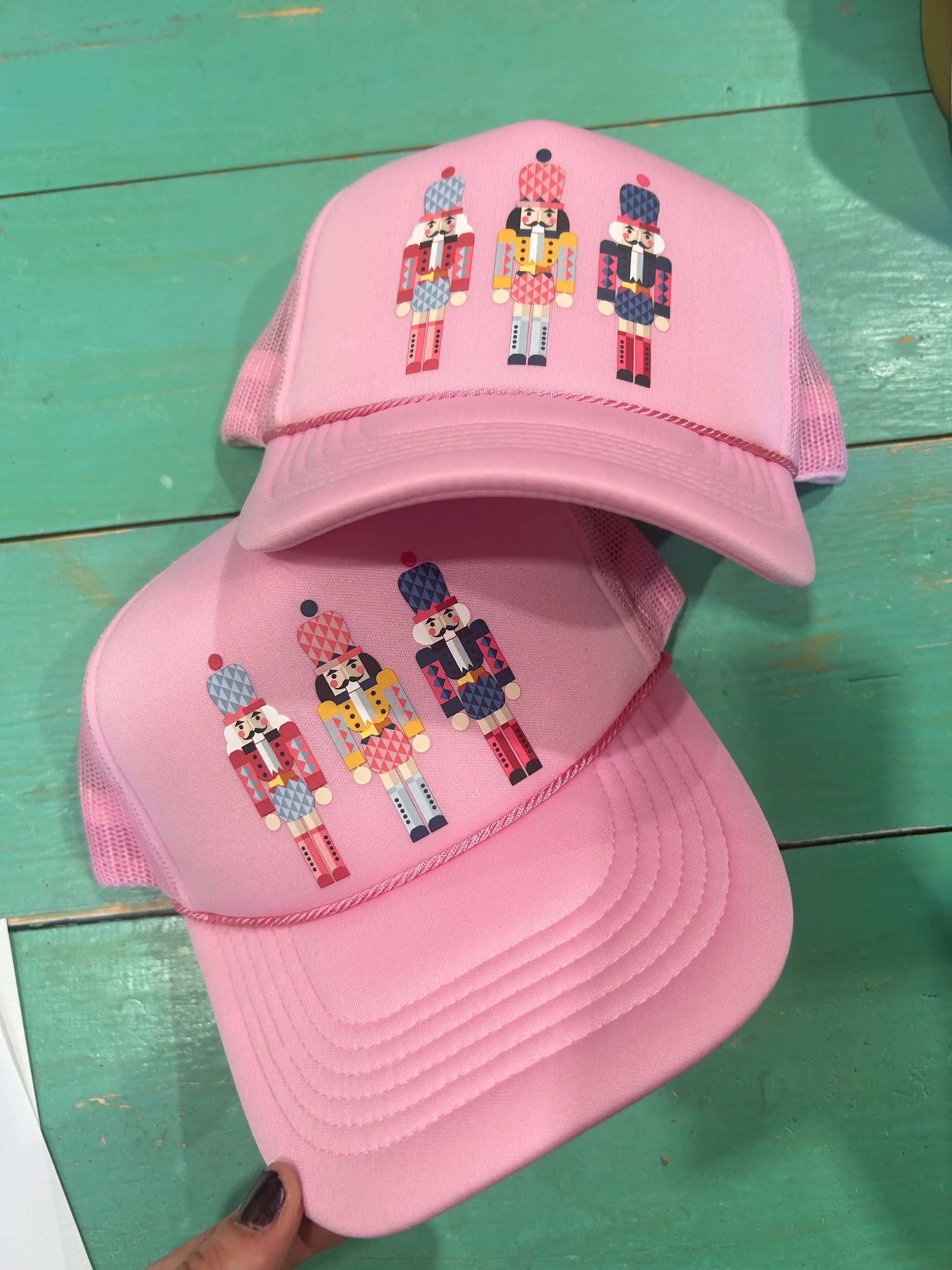 These nutcracker trucker hats are oh so sweet! This design is printed on your favorite foam trucker or corduroy dad hat. Foam truckers have a foam front, mesh back, and adjustable snapback enclosure. Corduroy dad hats are a lightweight corded material, unstructured, and have a velcro adjustable enclosure.