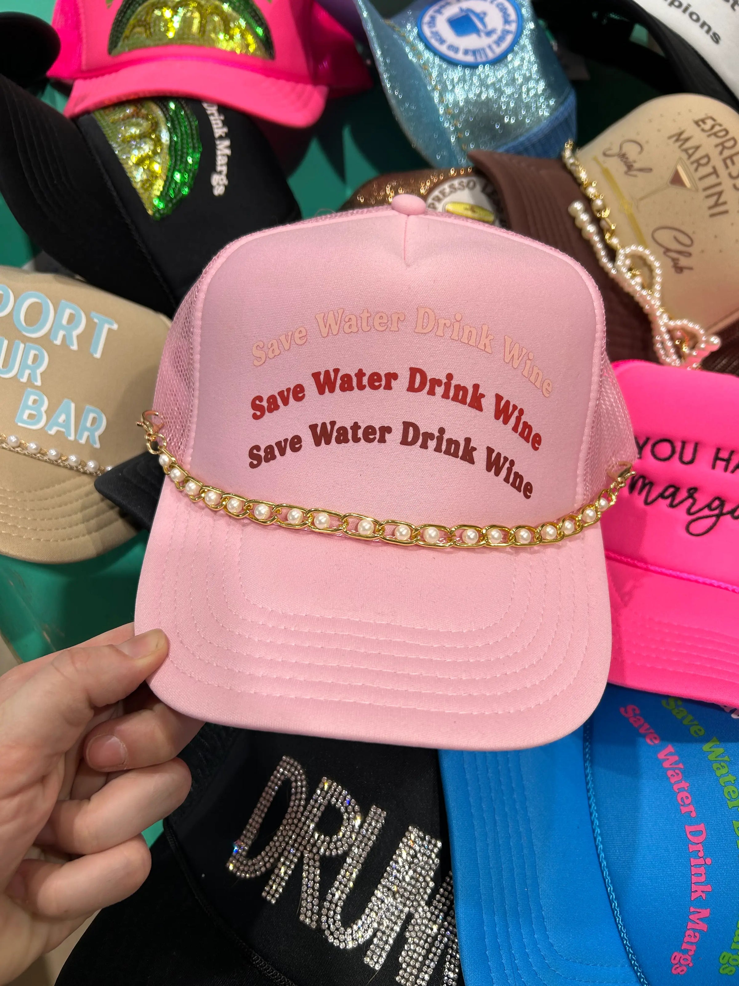 Chains not included but sold separately. Pictured here with our chunky gold & pearl and light pink link acrylic trucker hat chains.