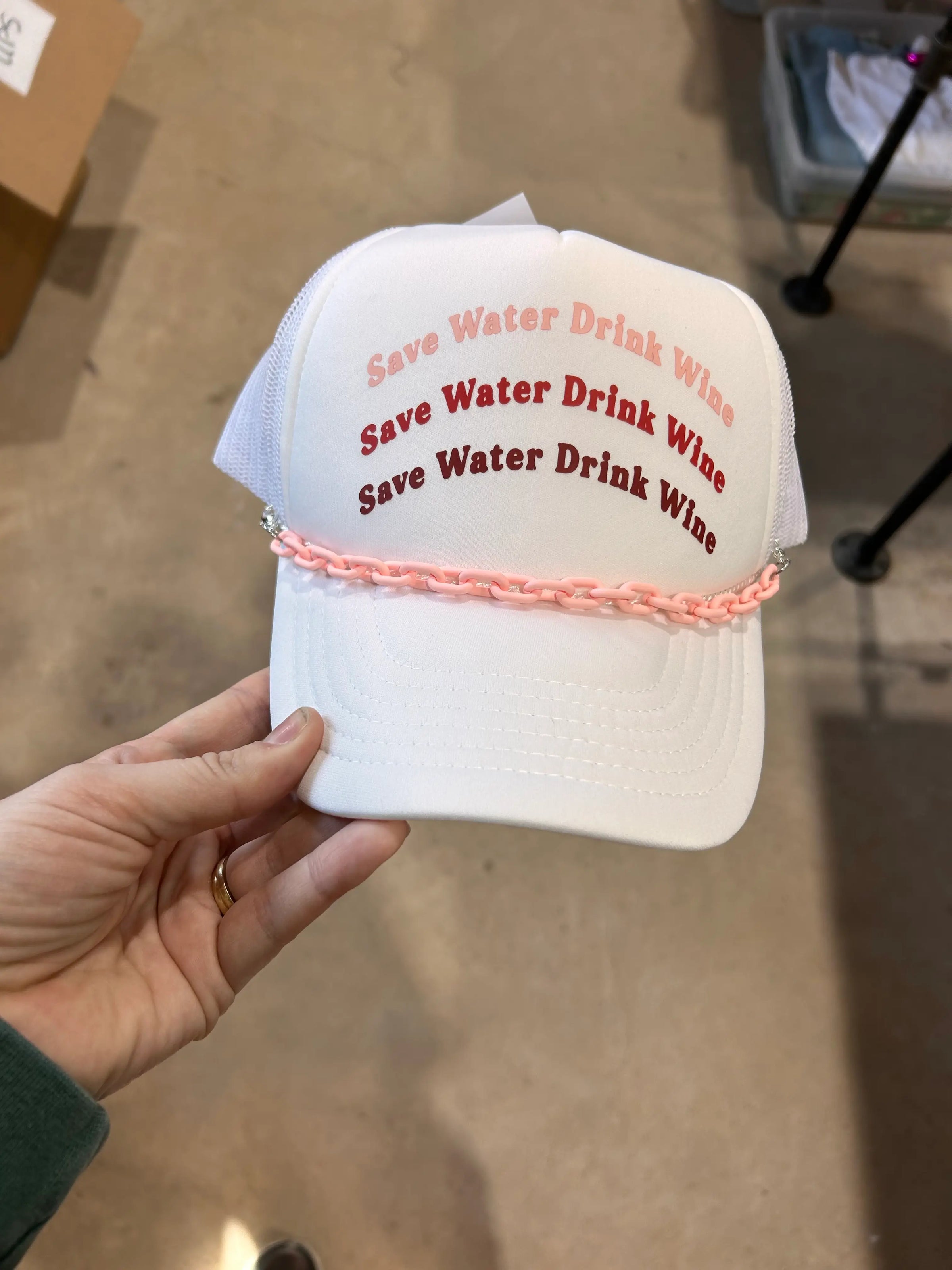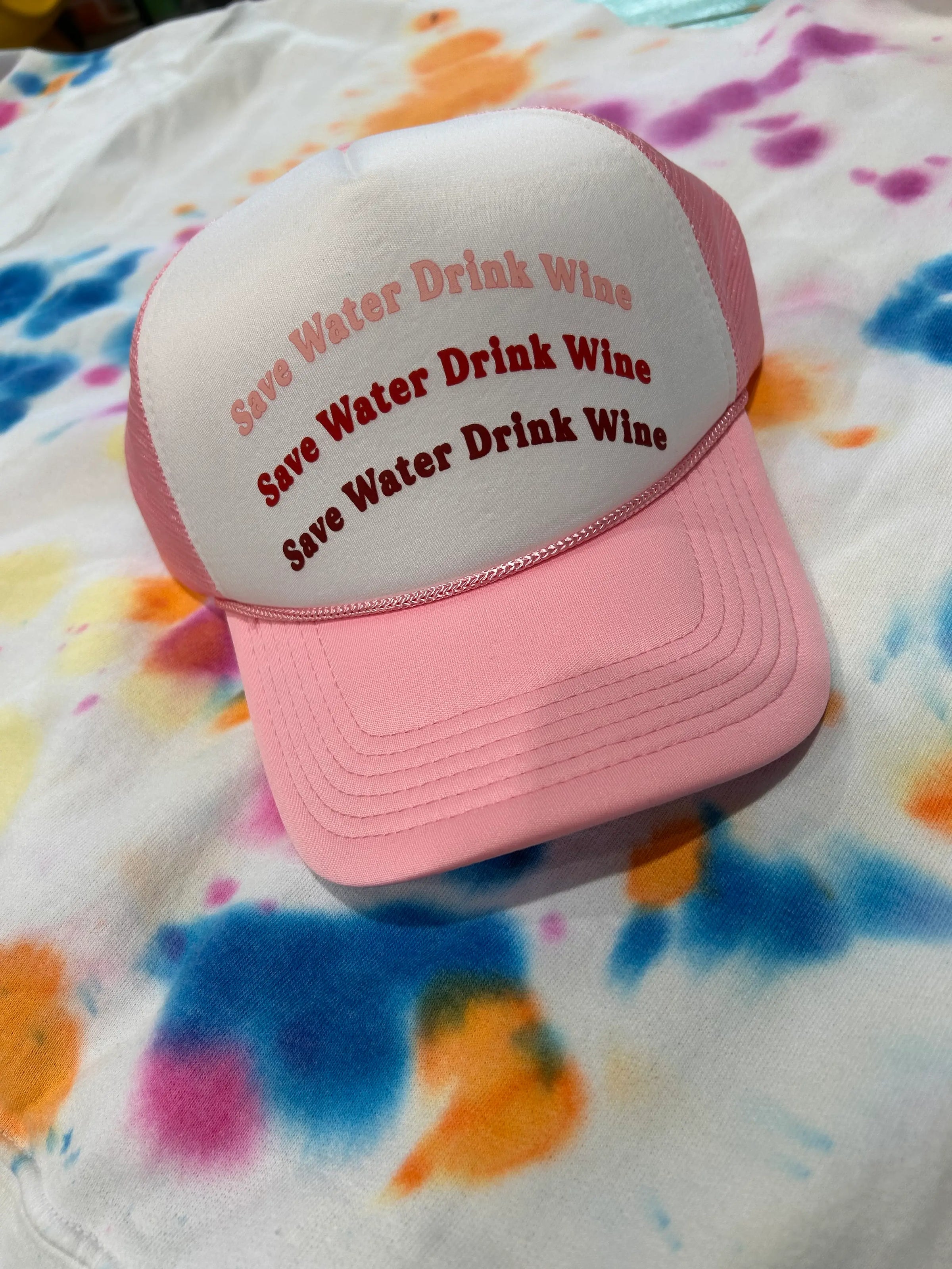 Save Water Drink Wine printed on your favorite color trucker hats. All foam truckers have a foam front, mesh back, and adjustable snapback enclosure. This is the perfect trucker for all the Wino's like me. Don't forget to pair with one of our trucker hat chains for the perfect wine-y trucker hat.