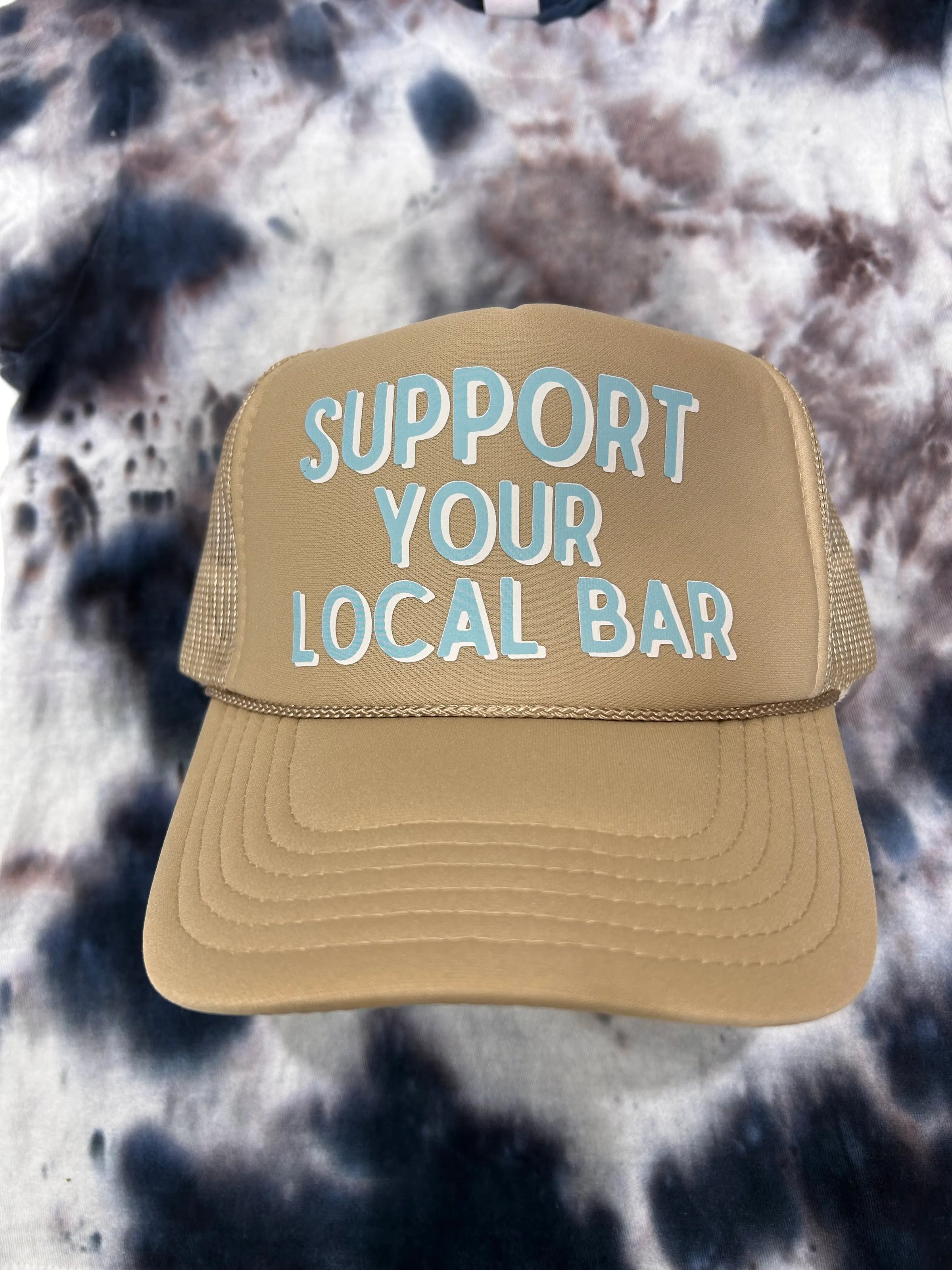 White and light blue printed Support Your Local Bar on your favorite trucker hat. Foam truckers have a foam front, mesh back, and adjustable snapback enclosure. Don't forget to add one of our trucker hat chains for the perfect day drinking trucker.