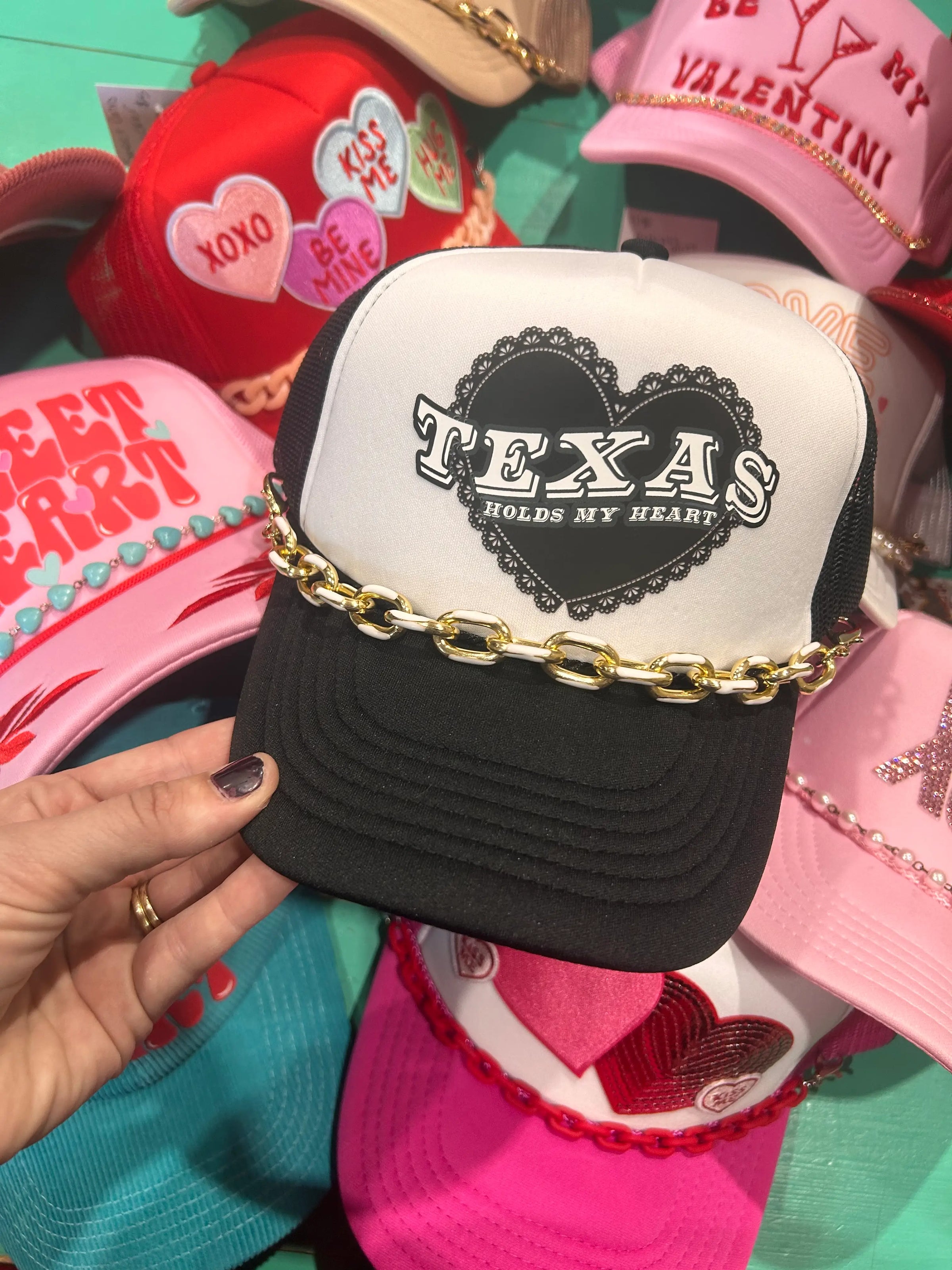 Doiley inspired Texas Holds My Heart design printed on your favorite color foam trucker hats! Foam truckers have a foam front, mesh back, and adjustable snapback enclousre.