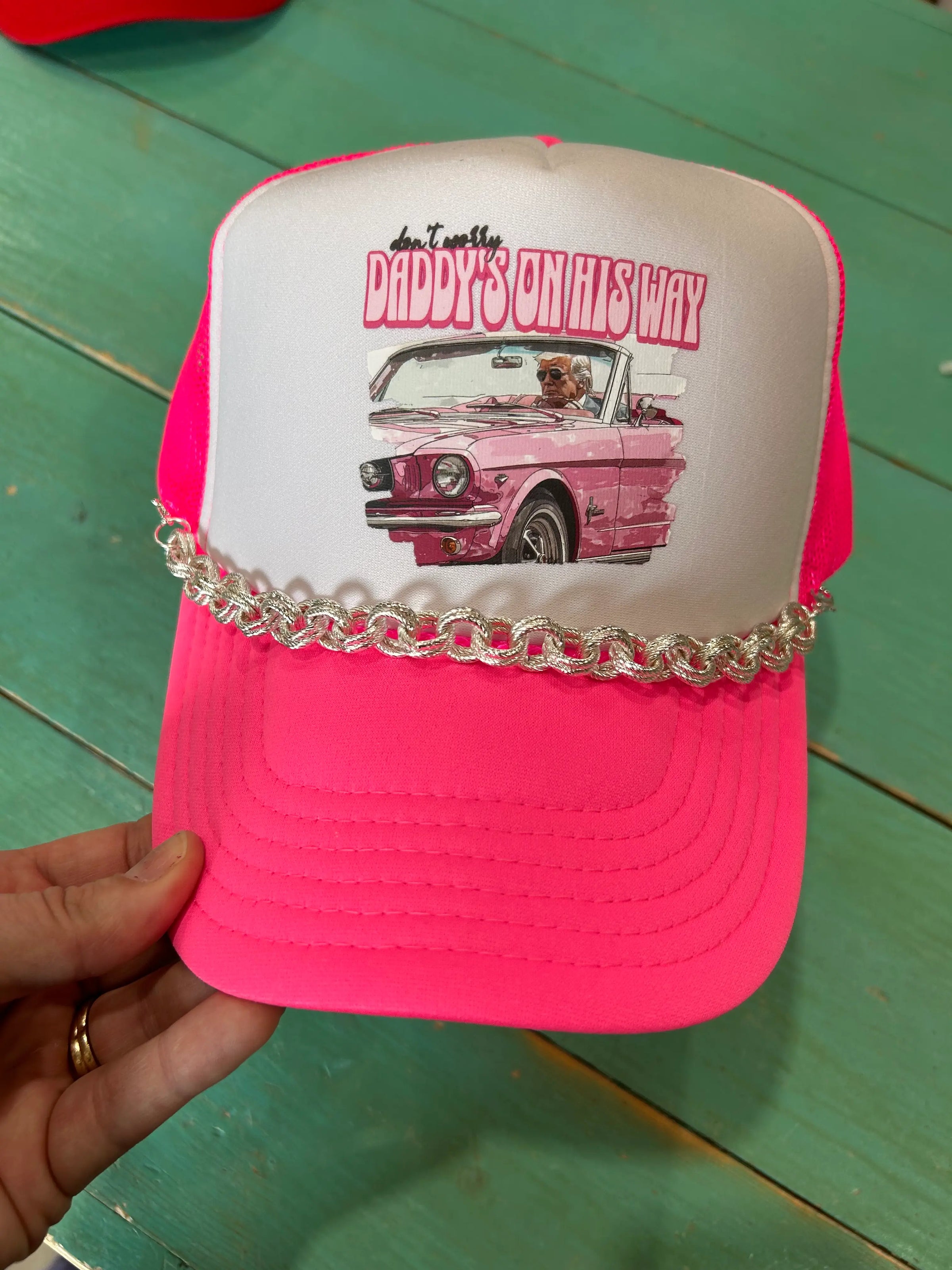 Trucker hat chains are not included but sold separately. Pictured here with our rhinestone & pearl and dainty black beaded trucker chains.