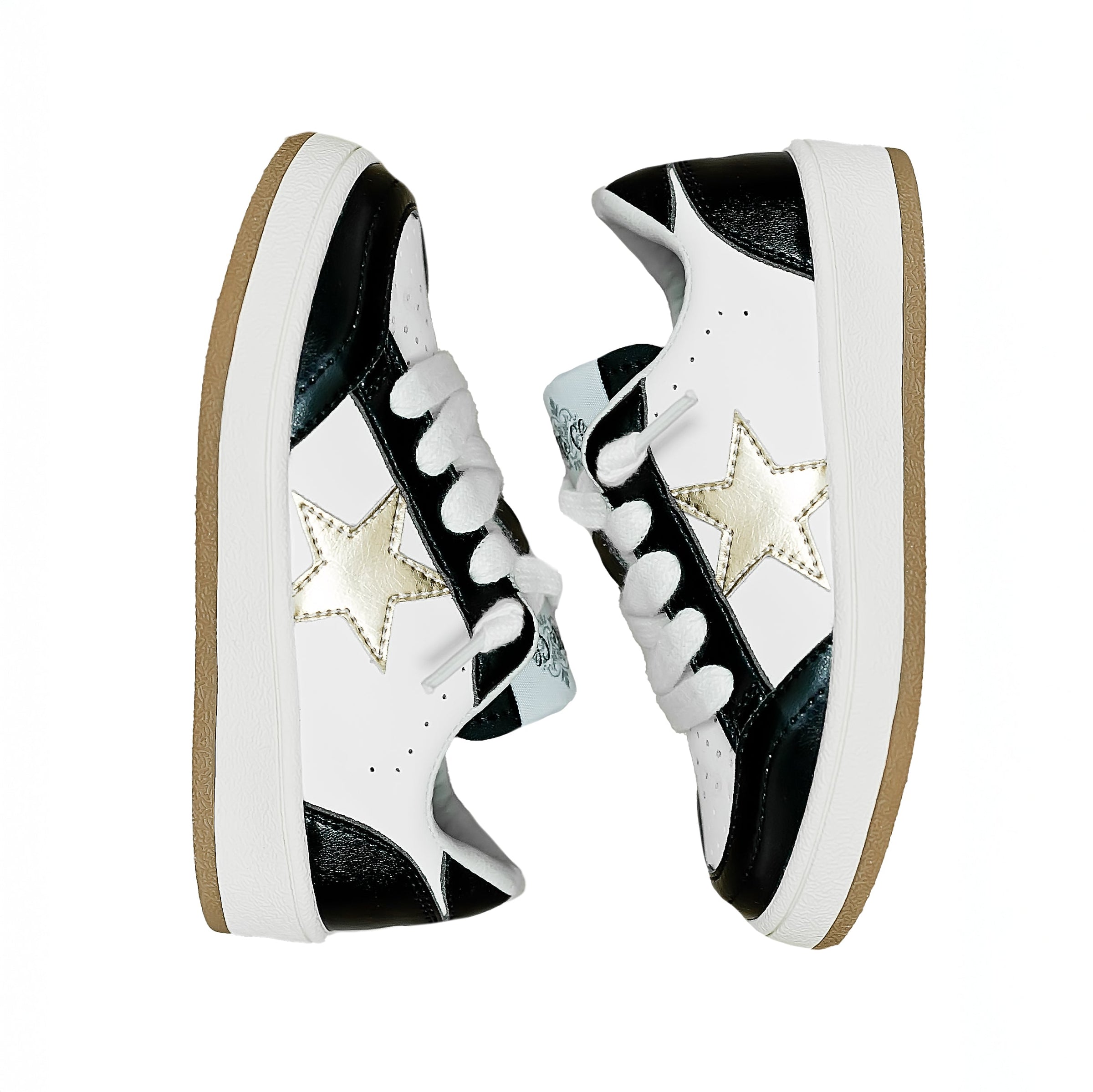 Step up your game day style with these Black and Gold Star Sneakers. Designed to keep little feet comfy and cool, their bold star pattern adds a fun, playful touch to any outfit. Perfect for kicking it on the playground or cheering from the sidelines, these sneakers bring energy and shine to every step.