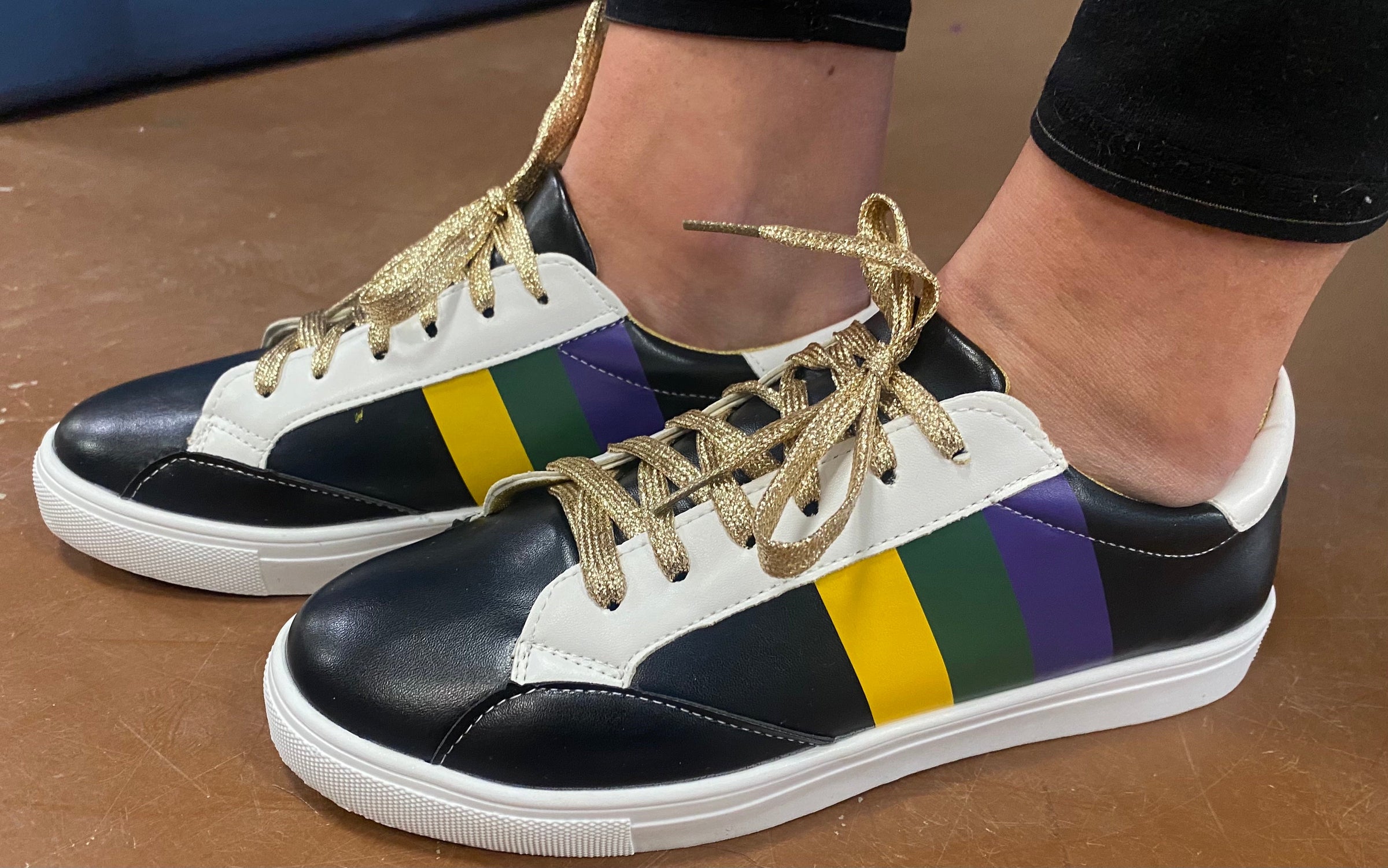 Celebrate Mardi Gras in style! These black Mardi Gras Stripe Lace-Up Sneakers are the perfect shoe for parade routes and Mardi Gras celebrations. Shoes feature a Purple Green and Gold rugby stripe and gold glitter laces.