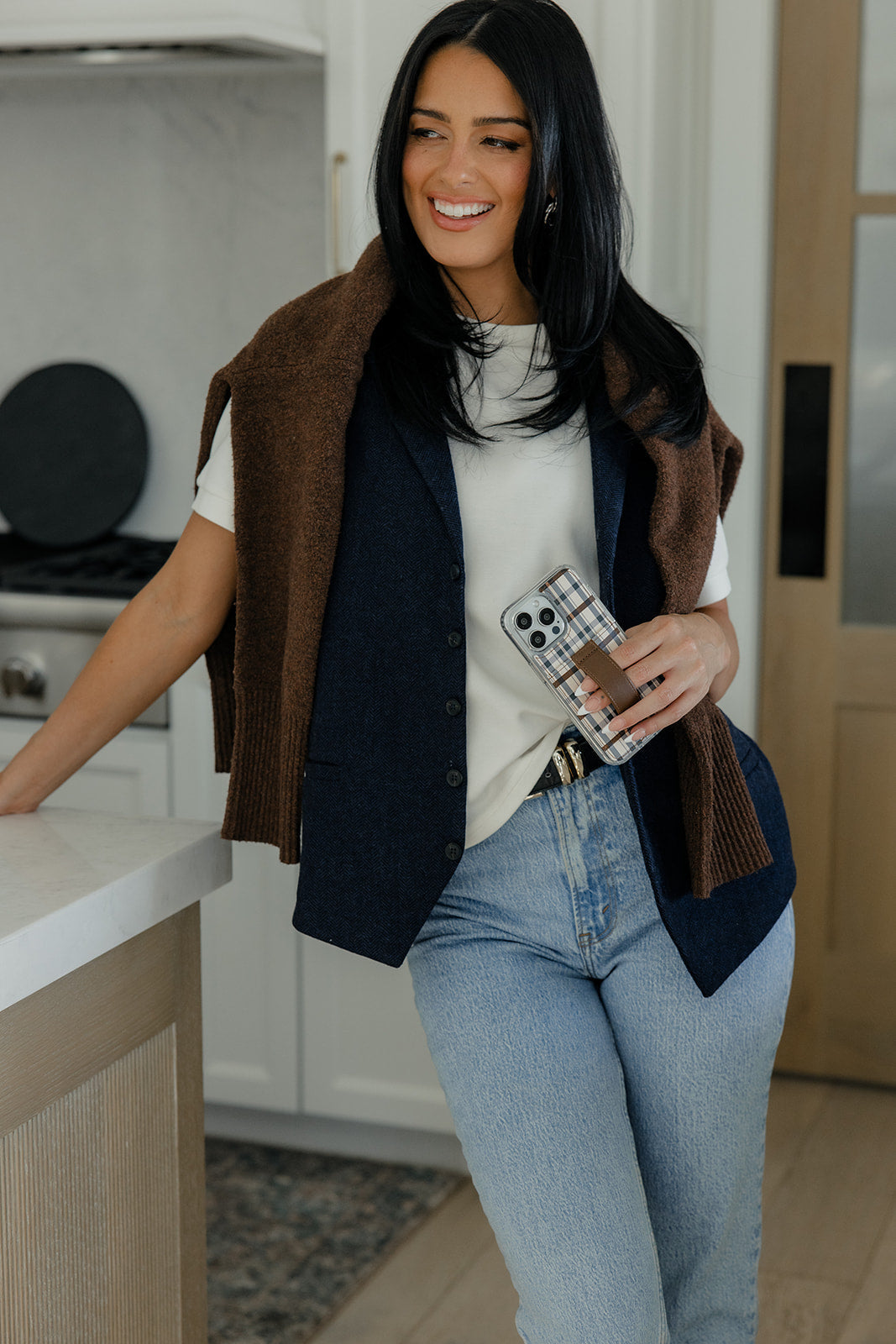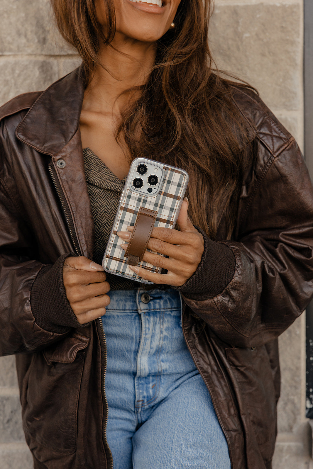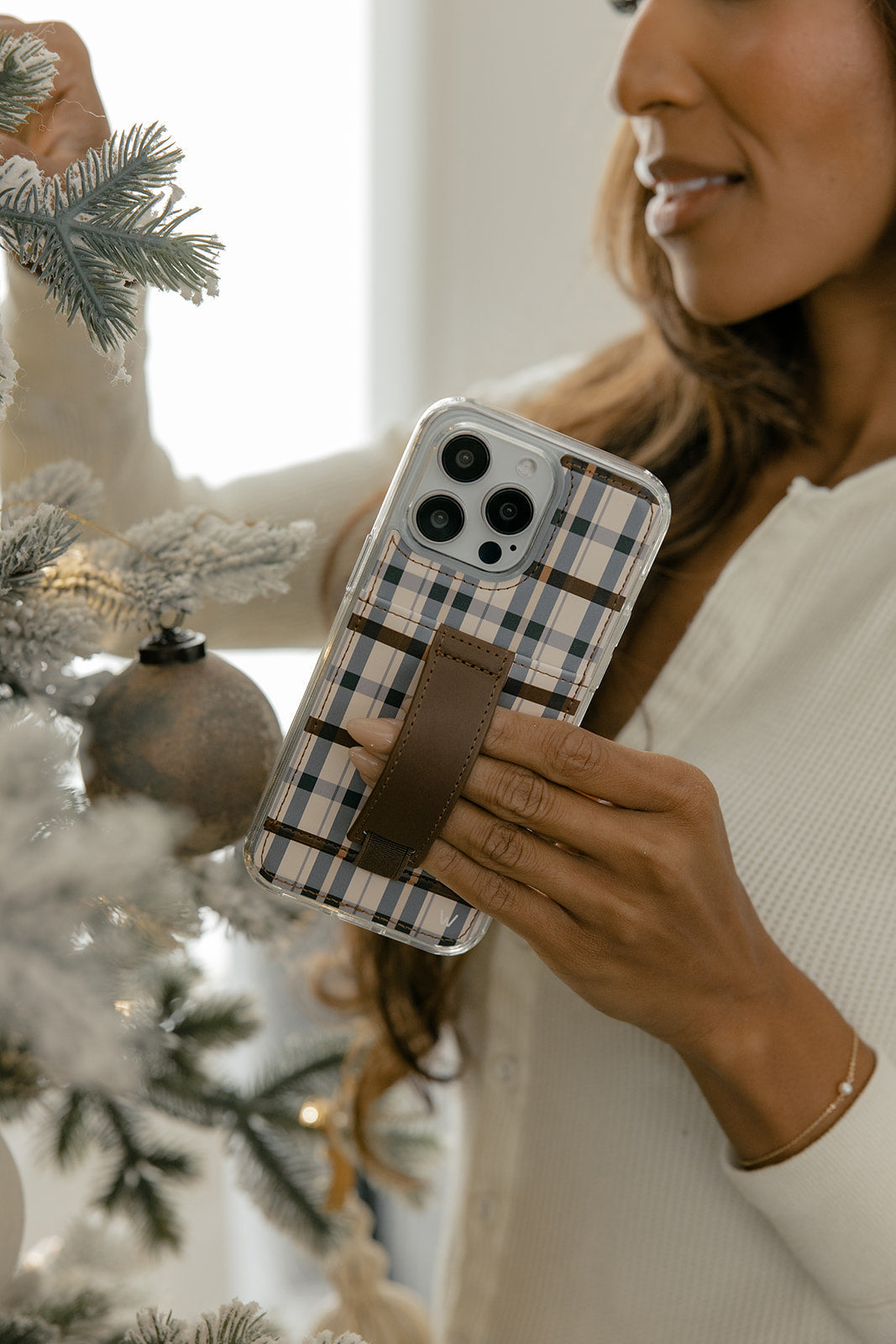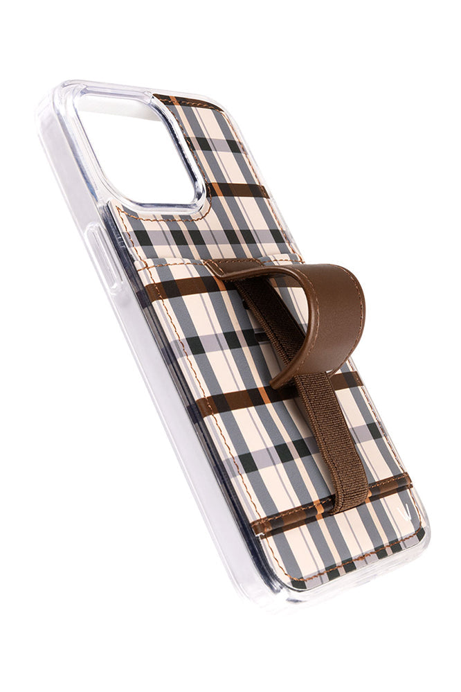 Case Design: Navy and brown plaid on a cream background