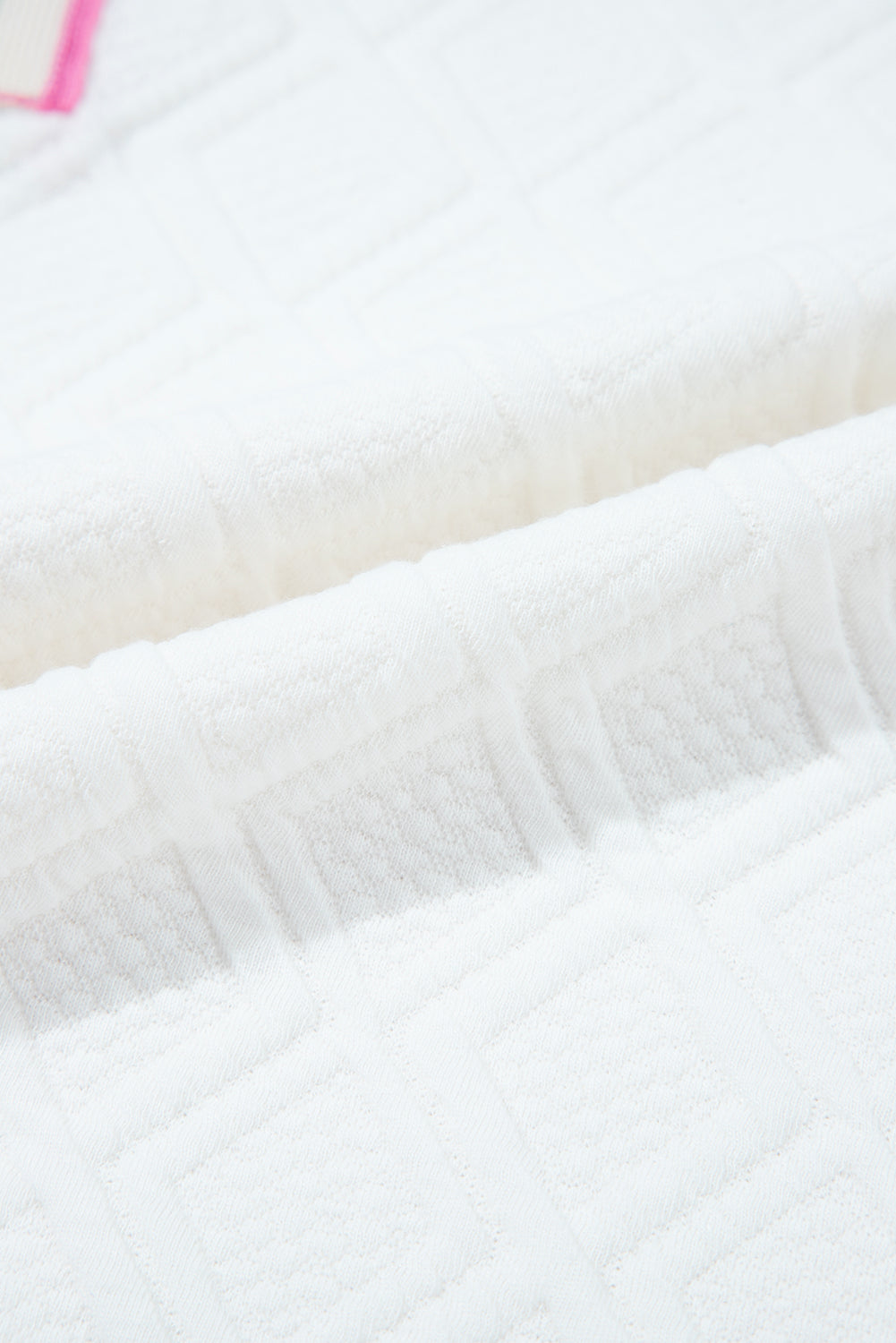This top is made from a one-of-a-kind fabric with a textured feel. The striped collar adds a touch of elegance and charm to this summer blouse. With half puff sleeves, it creates a graceful silhouette that pairs perfectly with skirts or pants. Plus, the zipper detail adds an extra sleek touch.