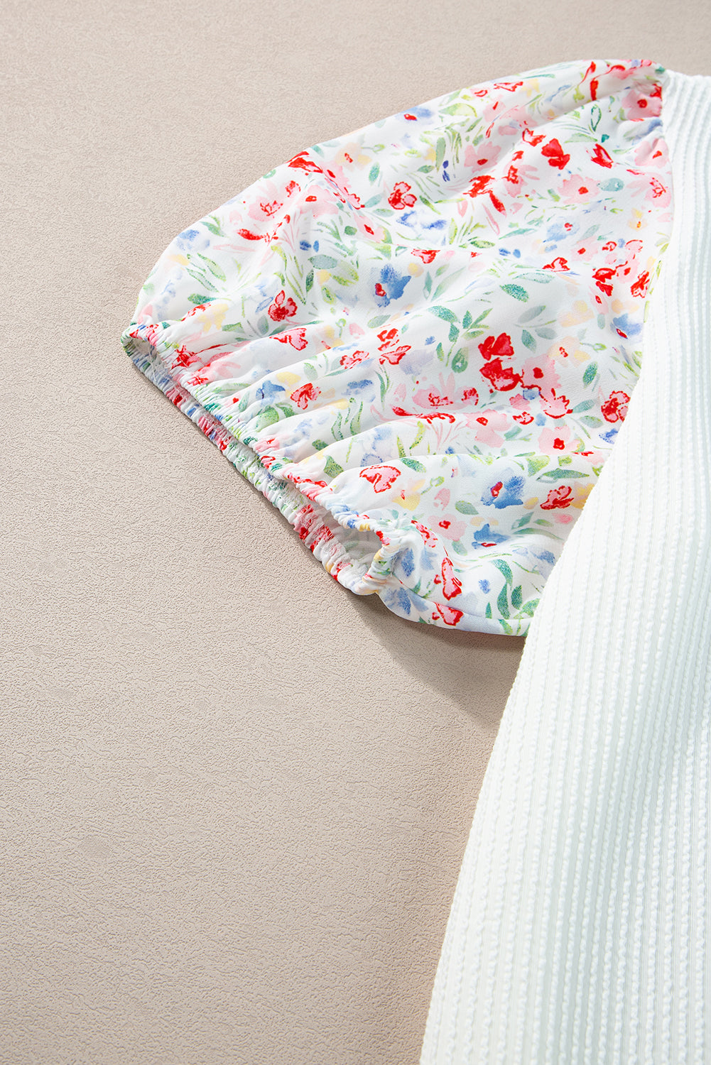 Kinslee Contrast Floral Puff Sleeve Ribbed Knit Plus Size Blouse