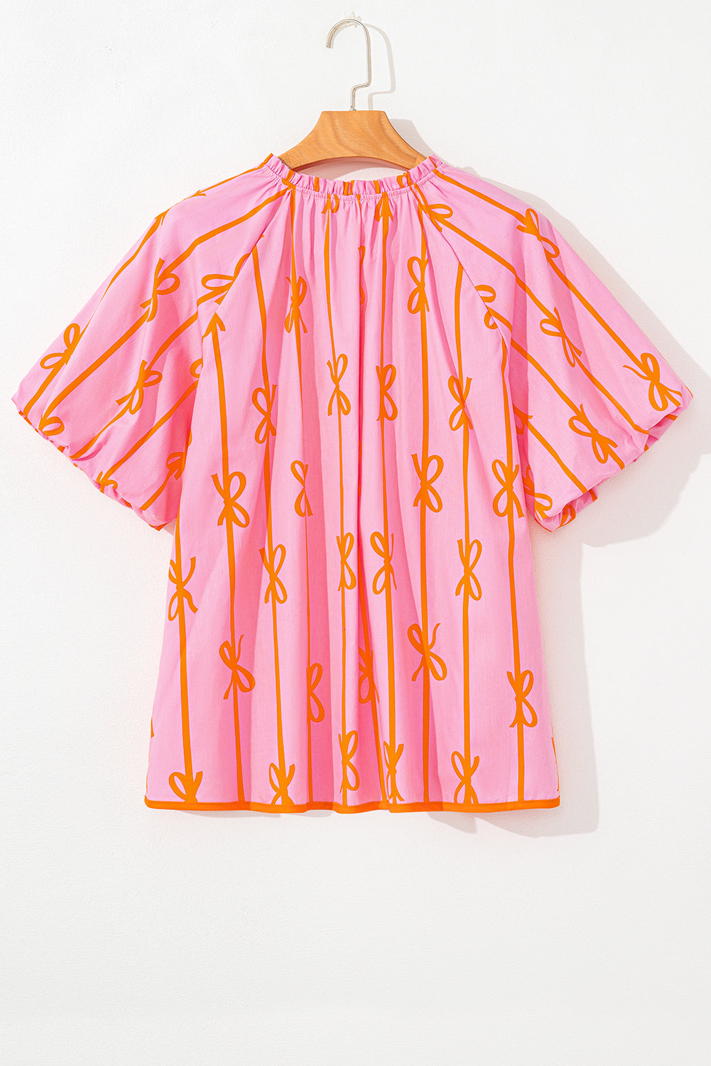This plus size blouse features a charming bowknot print that elevates its style with a dash of sophistication. The shirred detailing adds a trendy flair, while the puff sleeves keep it fun and fashionable. With a flattering V-neck, this top effortlessly blends elegance with a flirty vibe.