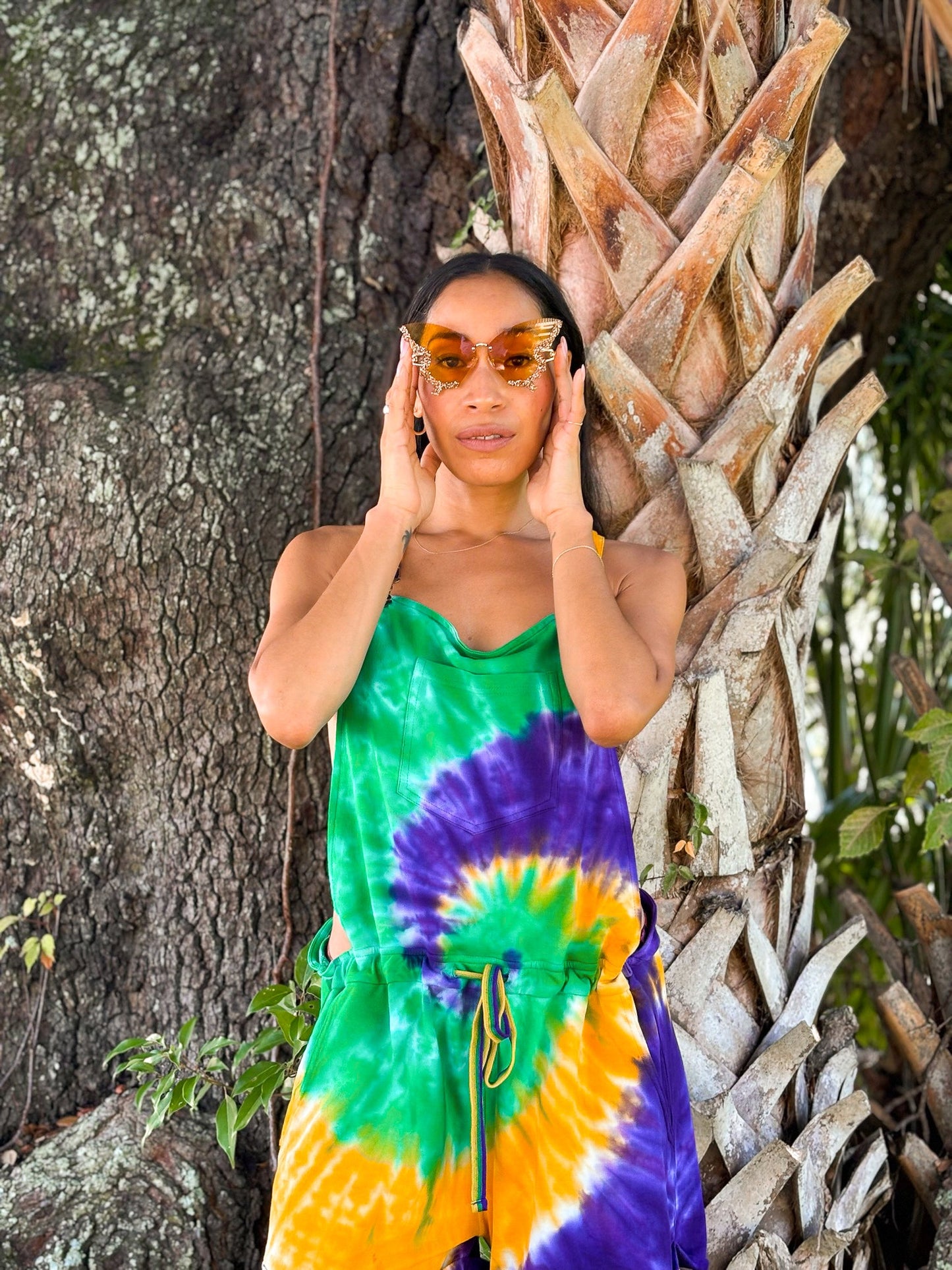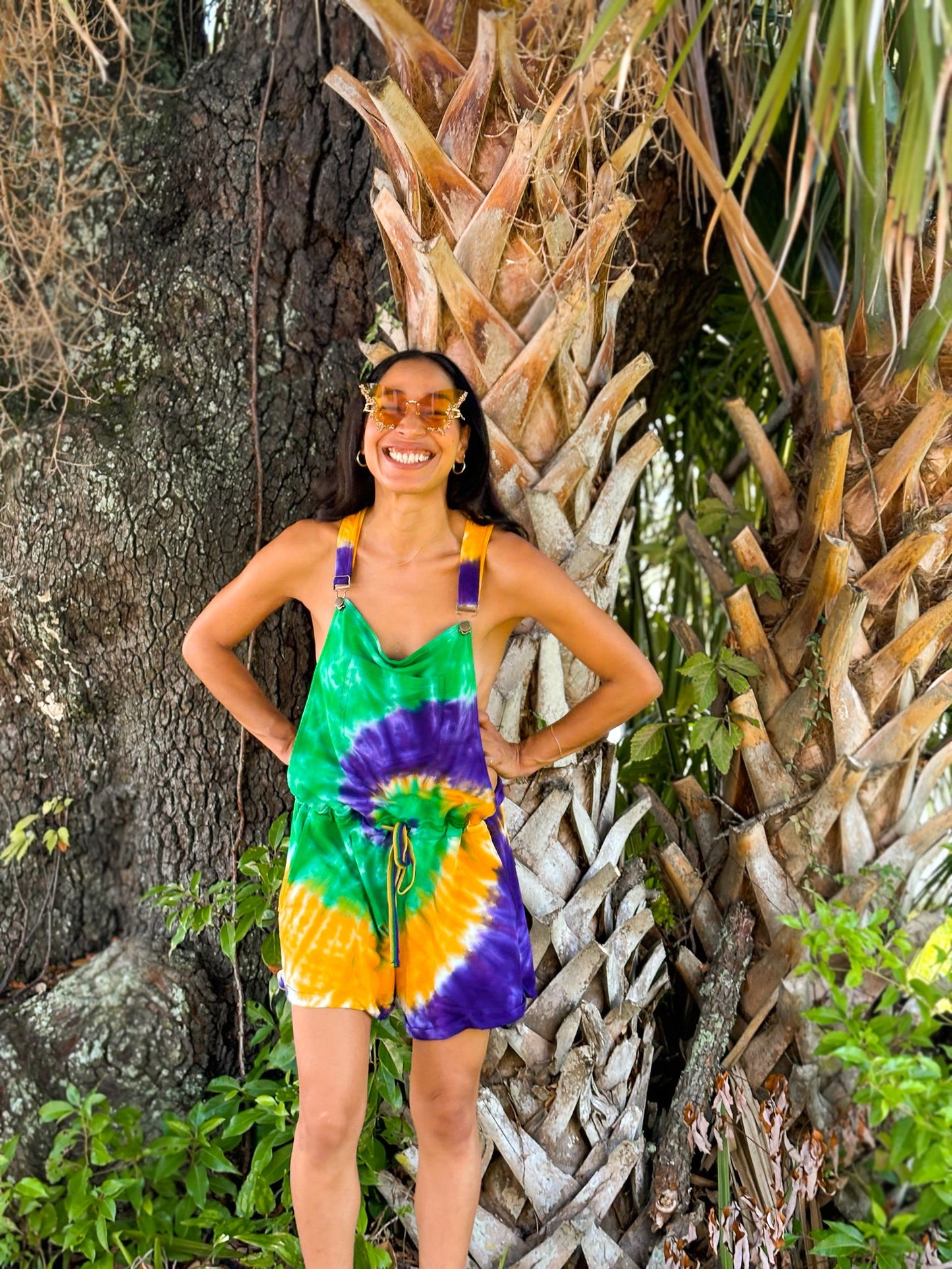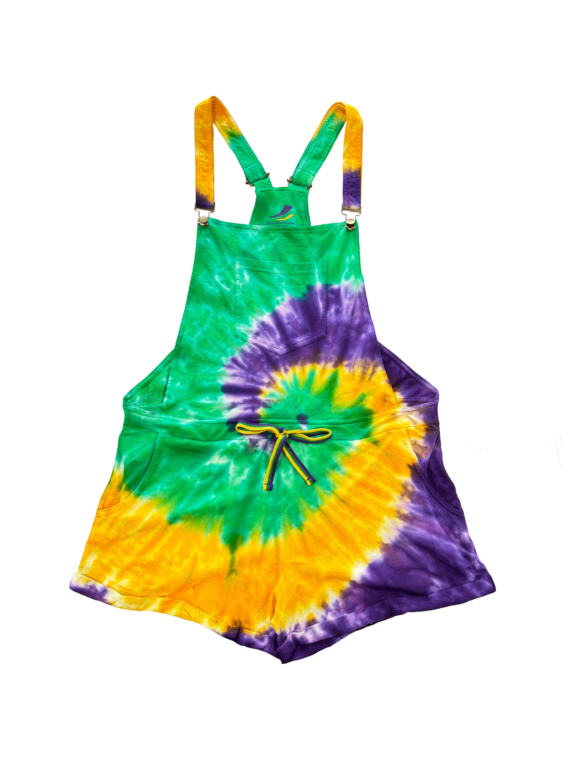 Get ready to party in style with our Adult Tie Dye Swirl Short Overalls! Made with Cotton French Terry fabric, these overalls are comfy and stand out with a vibrant purple, green, and gold Mardi Gras tie dye swirl. Let the good times roll!
