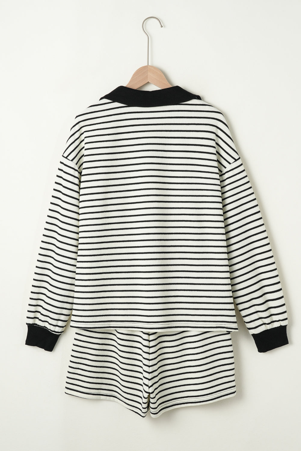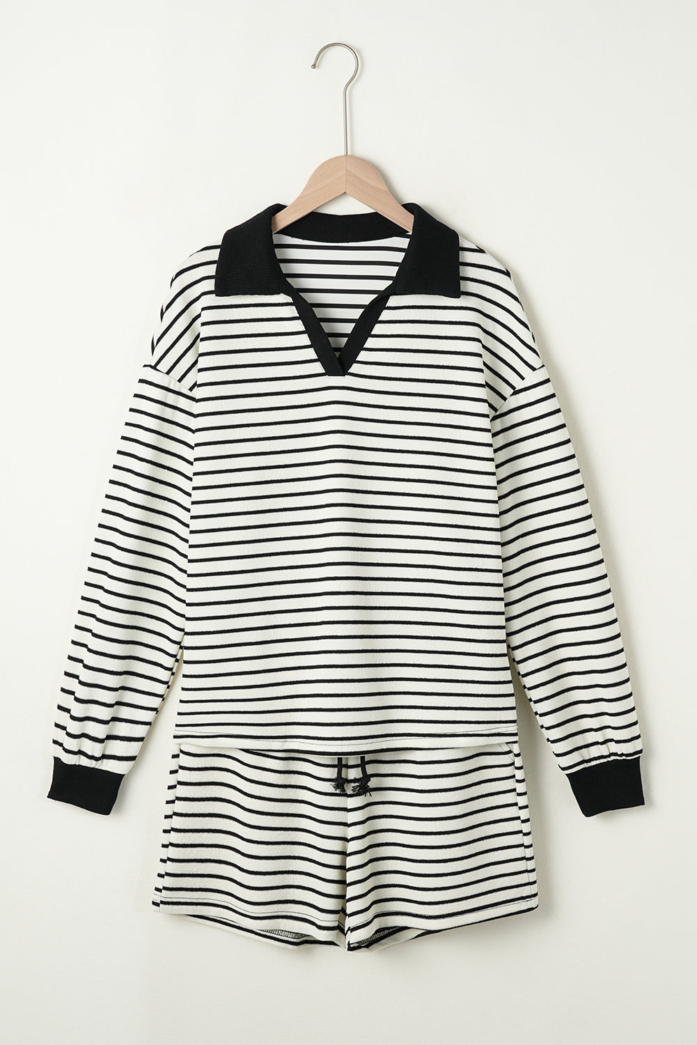 Get ready to level up your style game with this striped duo! The drawstring waist on the shorts lets you adjust the fit for ultimate comfort, while the long sleeve top keeps you warm and covered. And don't forget the collared detailing - it adds a touch of class and charm to this chic set.