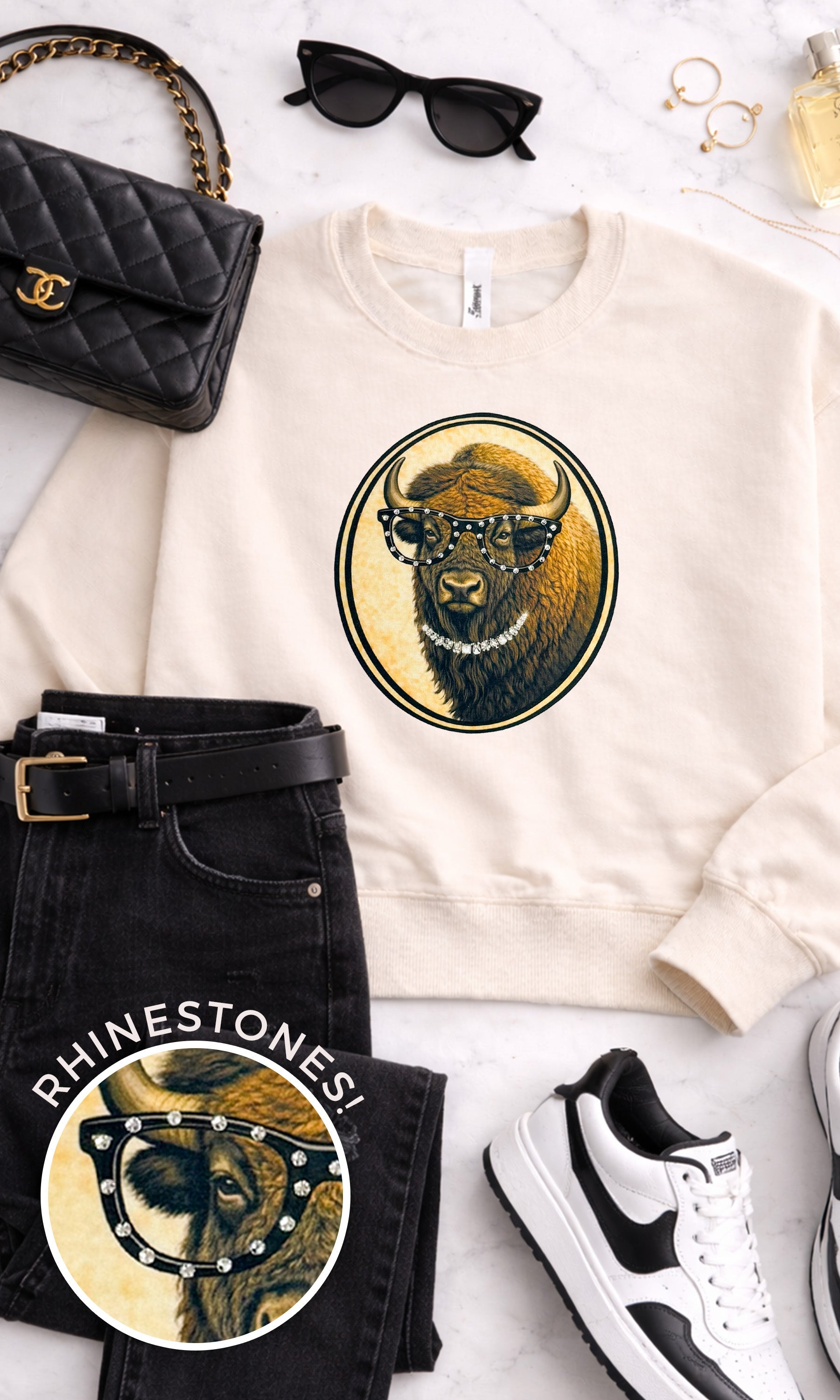Bold, playful, and ready to wear a little sparkle—this Bison with Rhinestone Specs Graphic Sweatshirt is designed for fans of wildlife-inspired graphics who love a casual, statement piece.