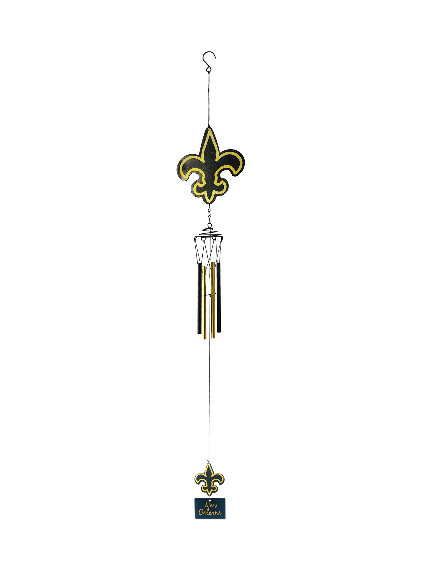 Make a statement with this beautiful and unique black and gold Fleur de Lis wind chime! Hang it up and watch it sway in the wind, adding a festive touch to any outdoor space.