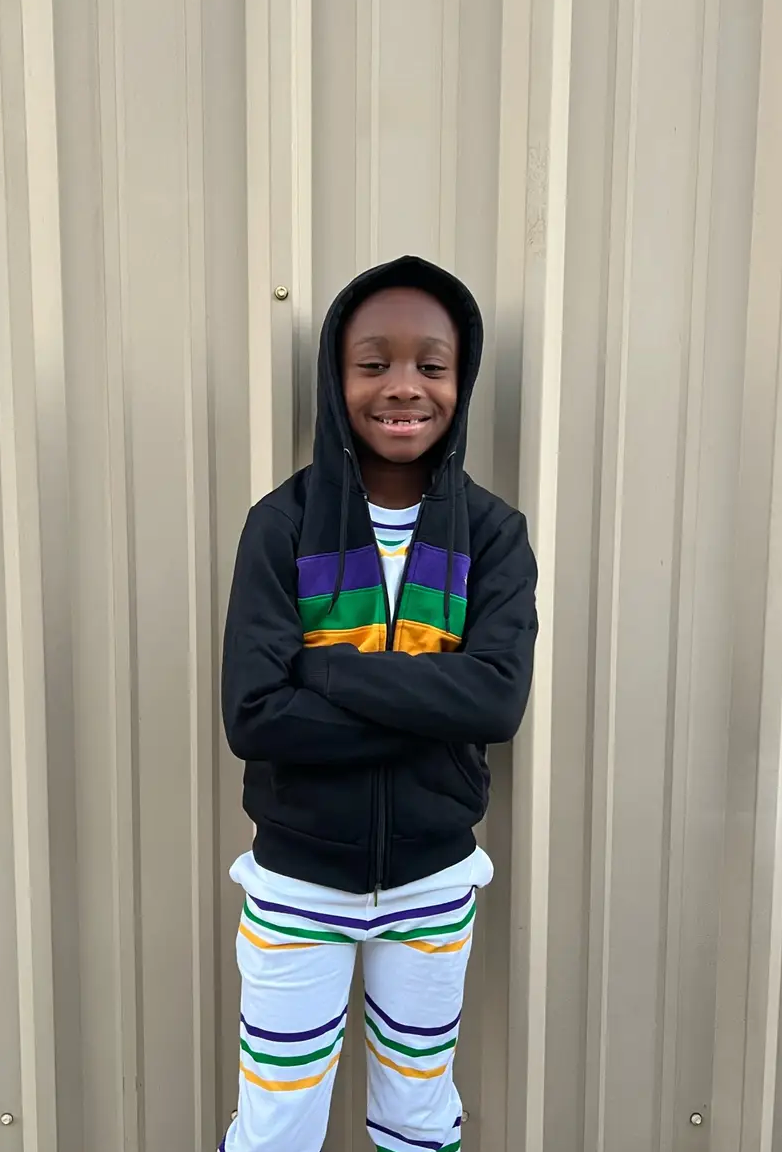Celebrate Mardi Gras with this stylish black long sleeved Mardi Gras kids zip up hoodie. This hoodie features purple, green and gold solid stripes across the chest and is unisex.