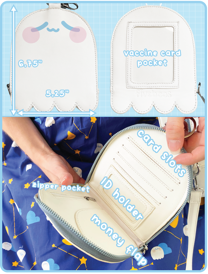 The wallets include a silver keychain at the top, and the final will also include a removable wrist strap (not pictured here). It feature multiple card slots, a zipper pocket and a money flap inside as well as a protected vaccine card pocket on the back