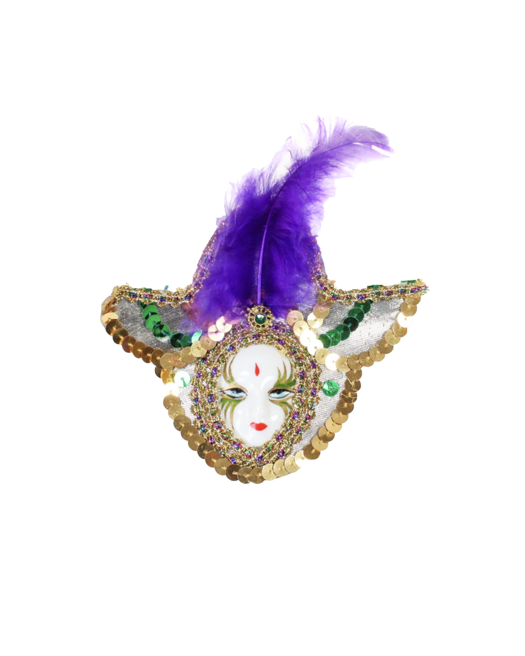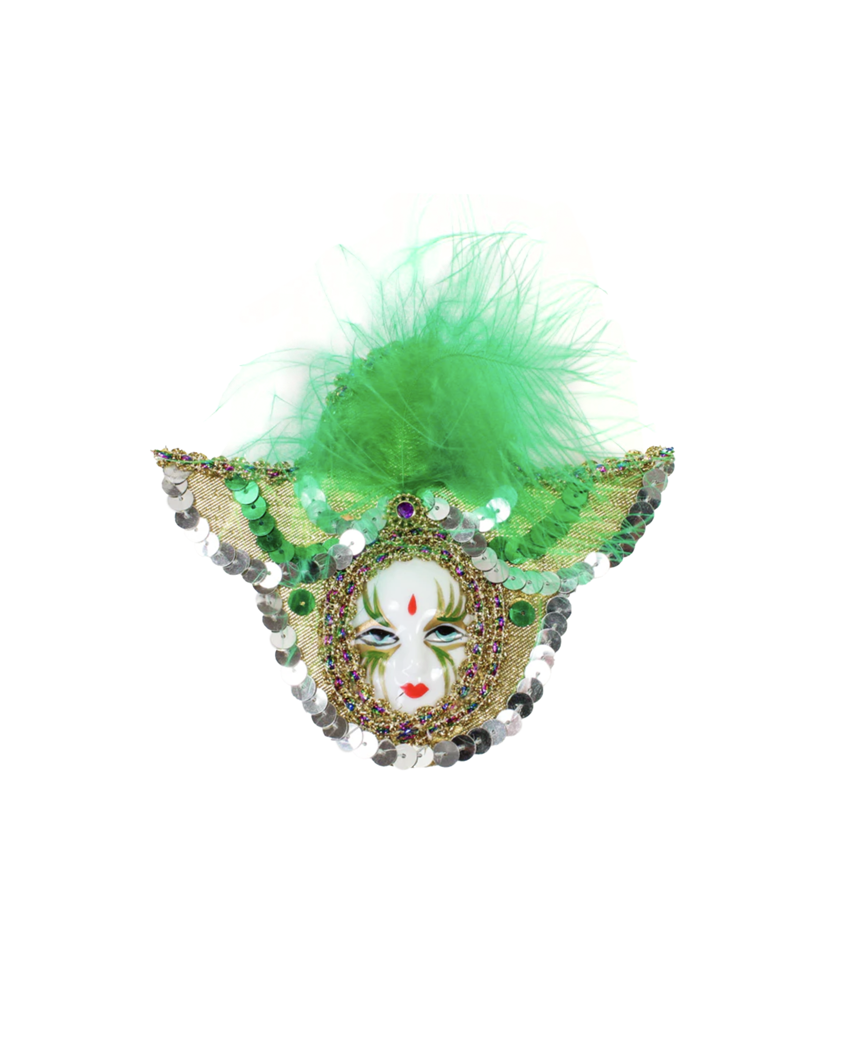 This stunning face mask magnet is beautiful with delicate face glitter accents, sequin wraparound details and head feathers.