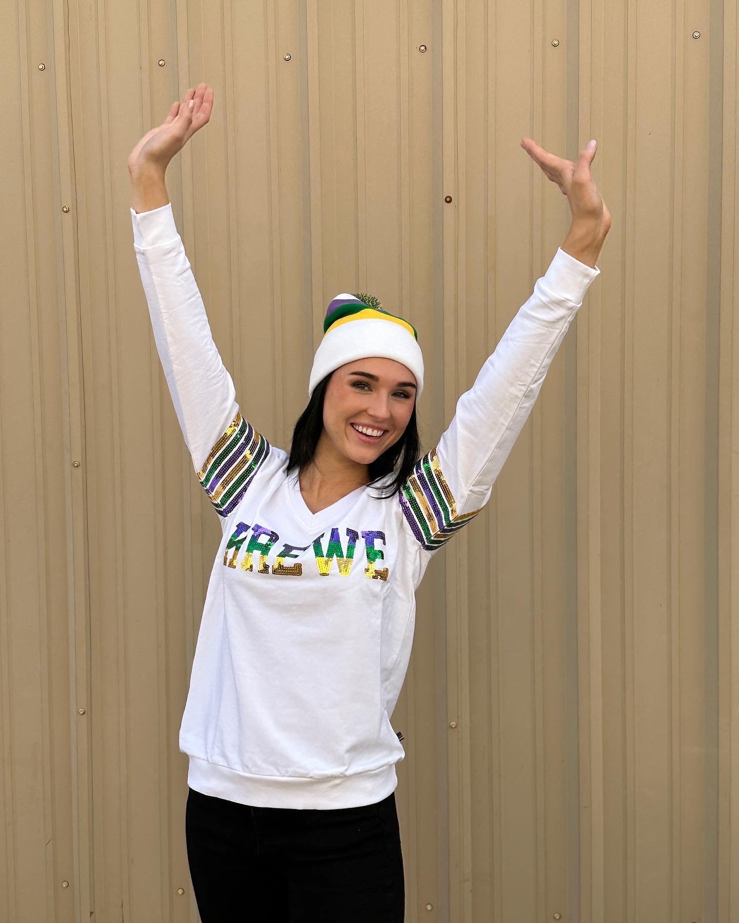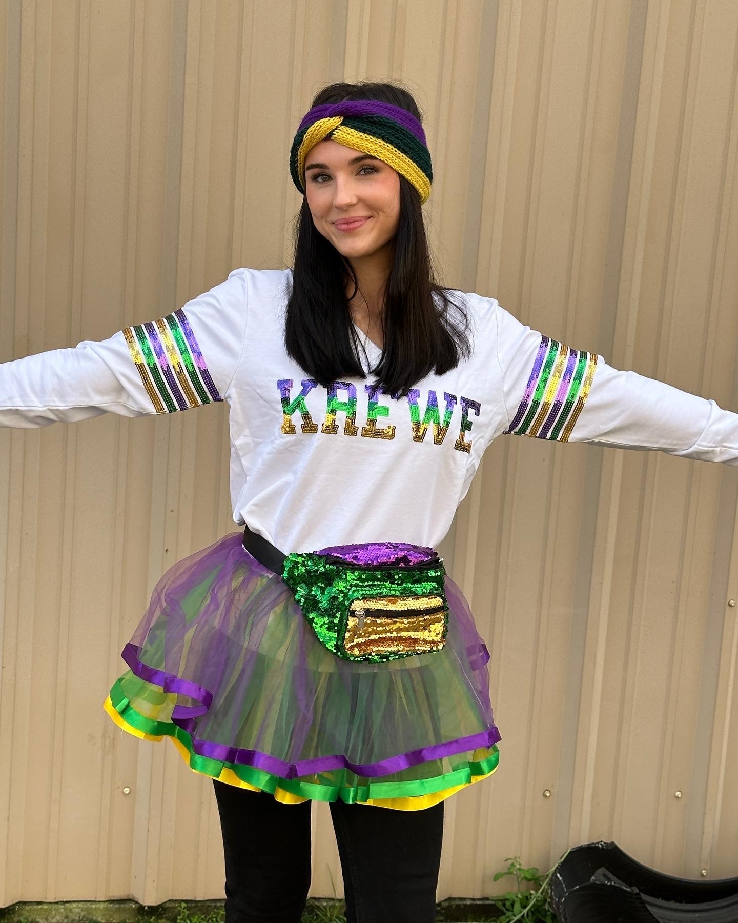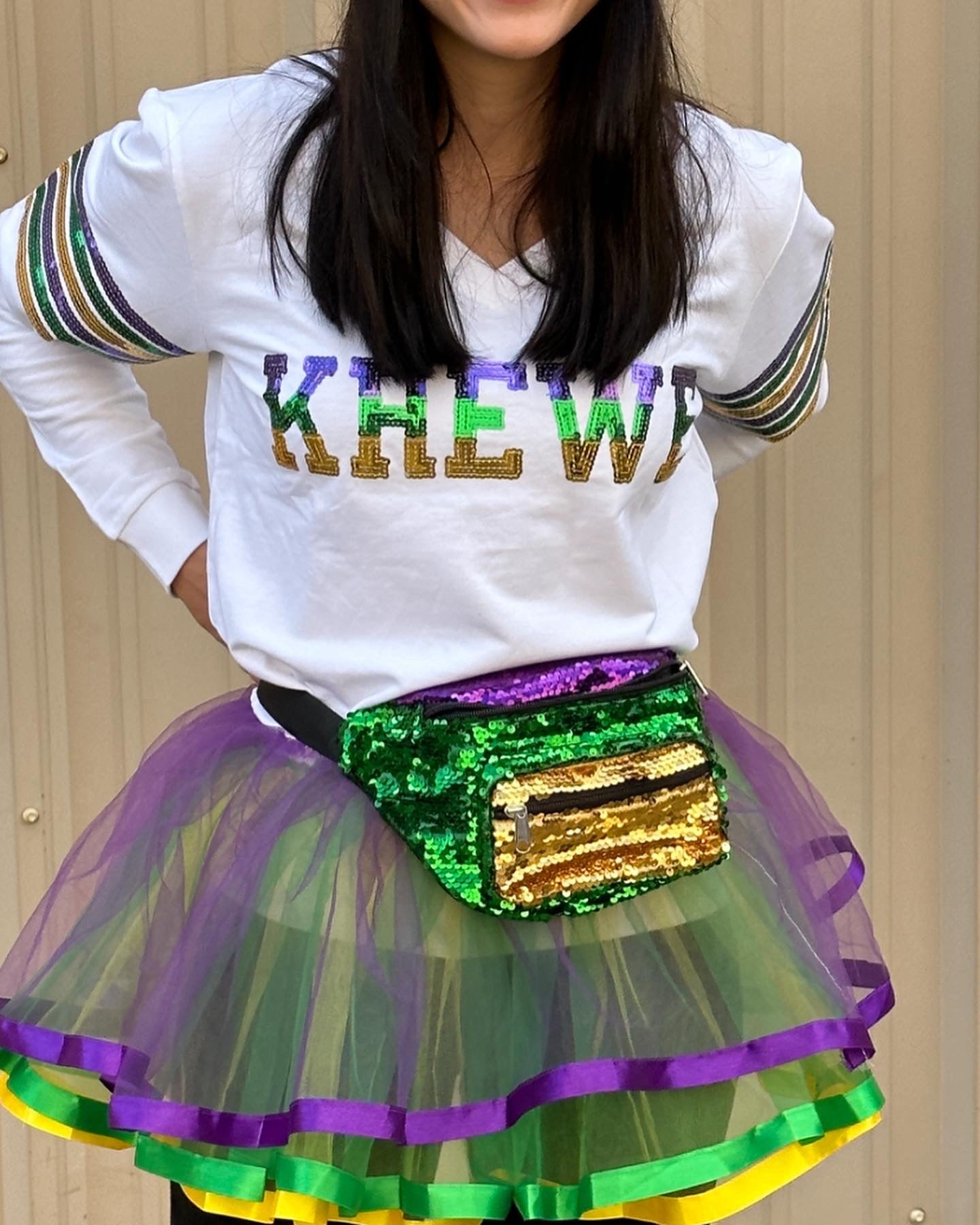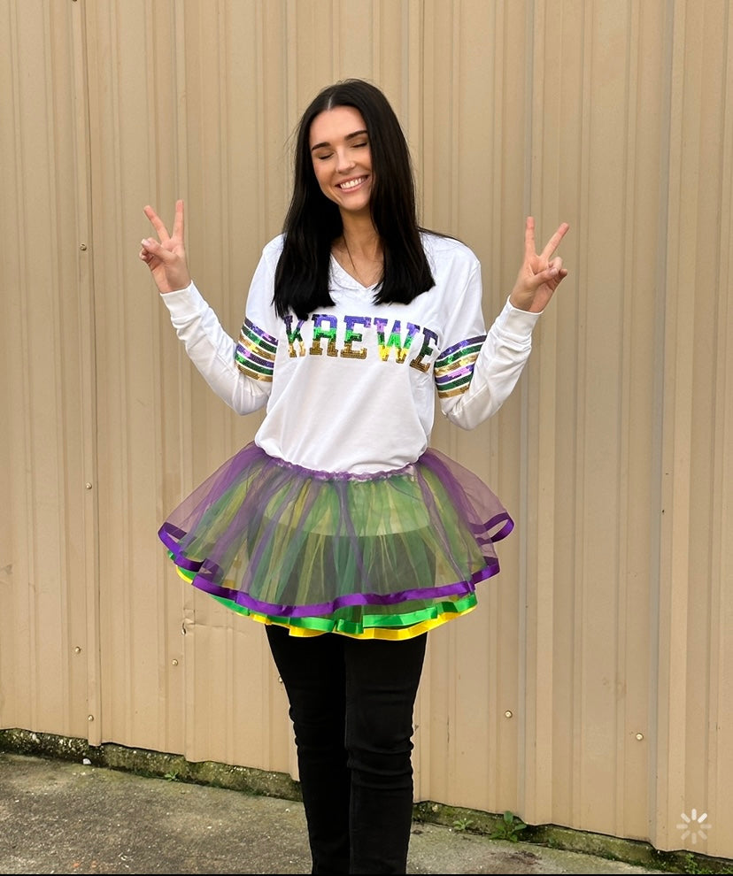Cannot get enough of our sequin French Terry pullovers!! Celebrate Mardi Gras with this fabulous long sleeved top! This is french terry material with purple green & gold sequins that read "KREWE’ V-Neck with purple, green, gold sequin stripes around the arms it’s sure to be a show stopper at any party or on the route!