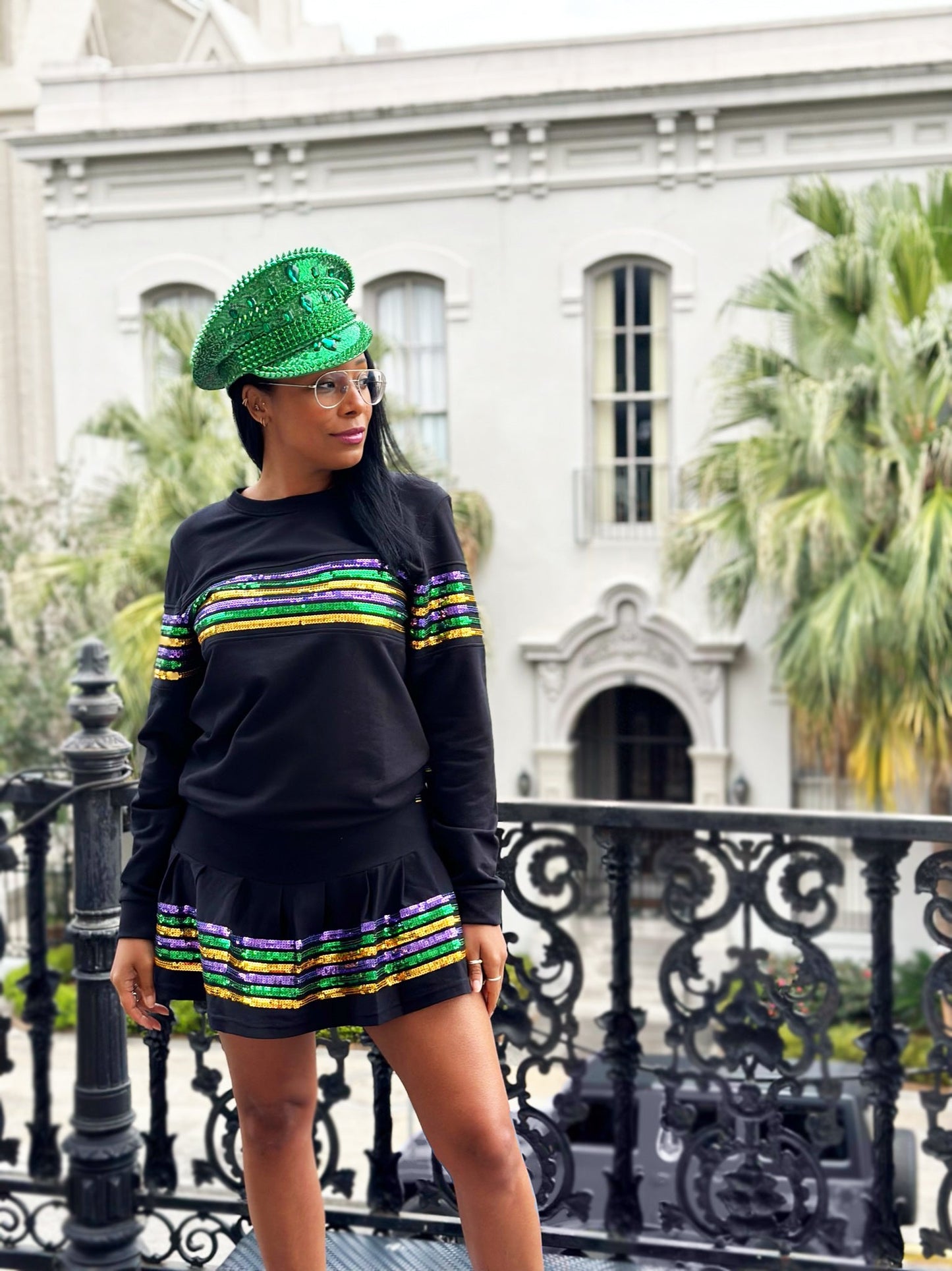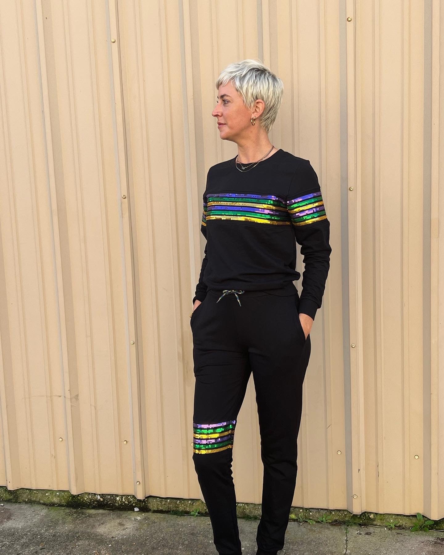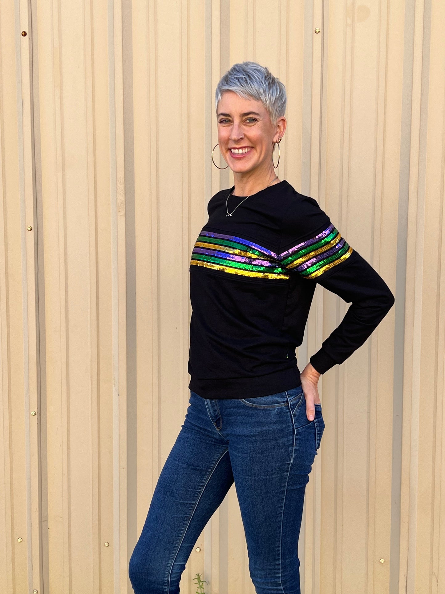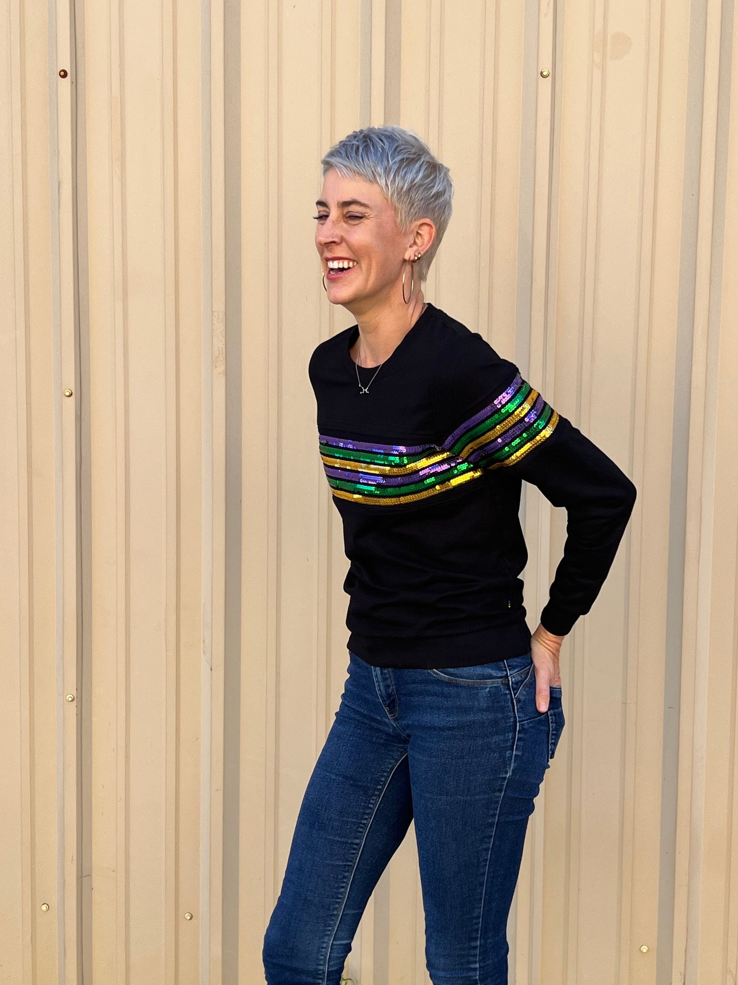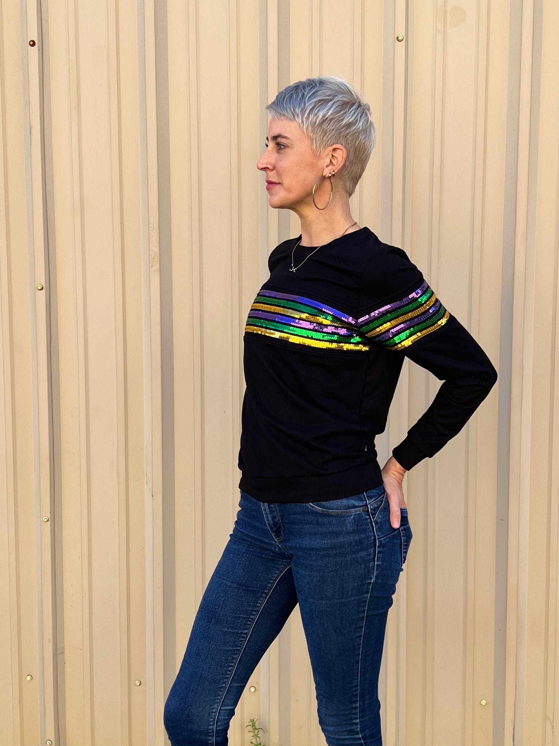 Crew neck with purple, green, gold sequin stripes across the arms. This one is sure grab attention wherever you go!