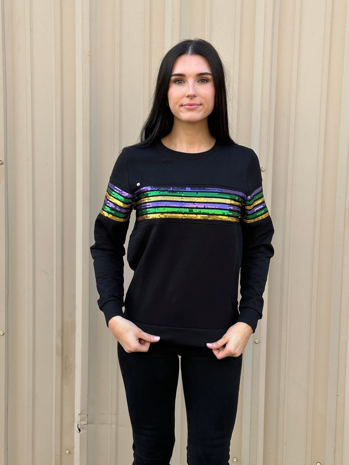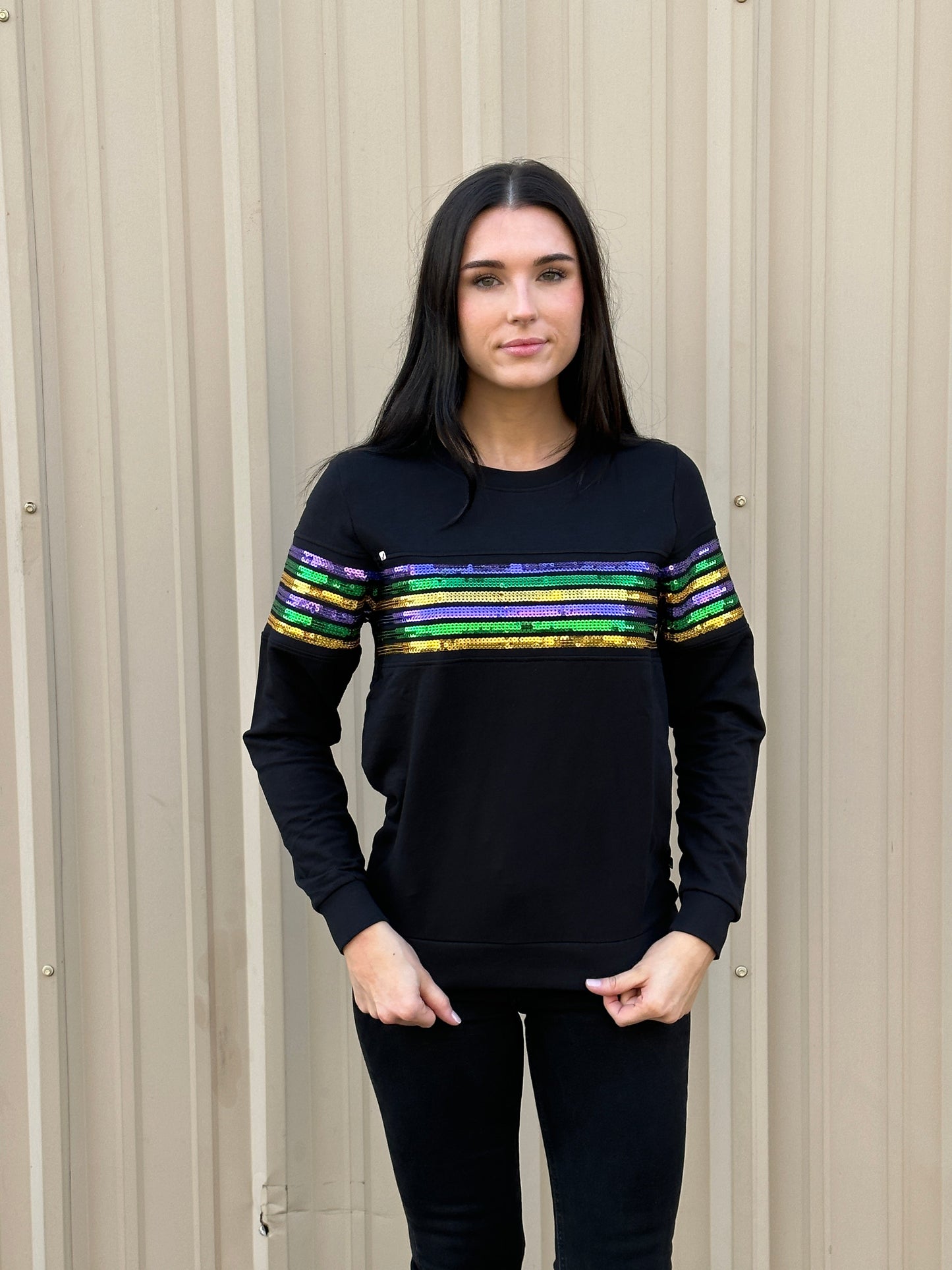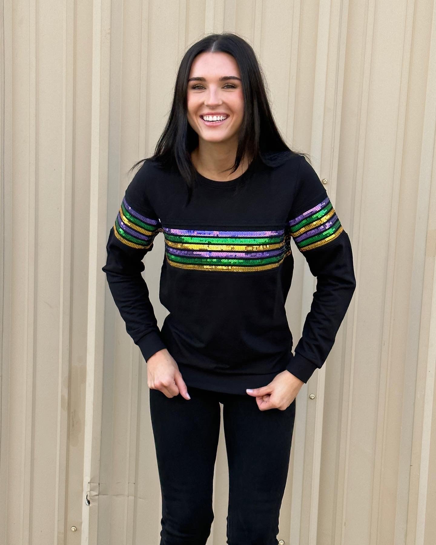 Cannot get enough of our sequin French Terry pullovers!! Celebrate Mardi Gras with this fabulous long sleeved top! This is french terry material with classic purple green & gold sequin stripes across the chest.