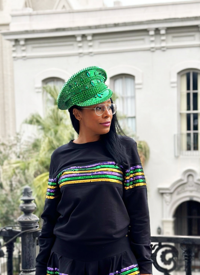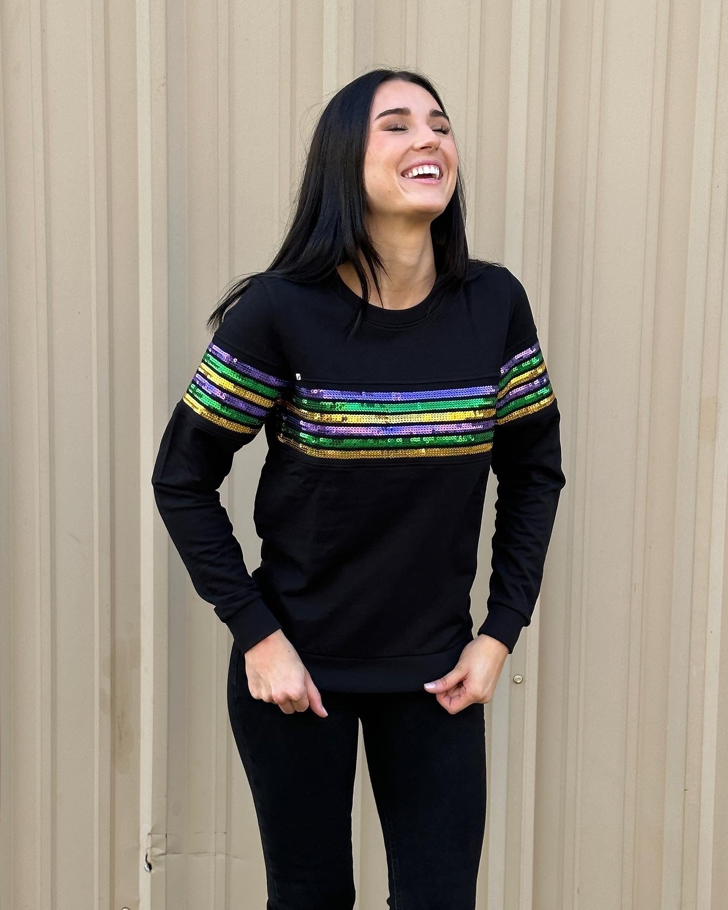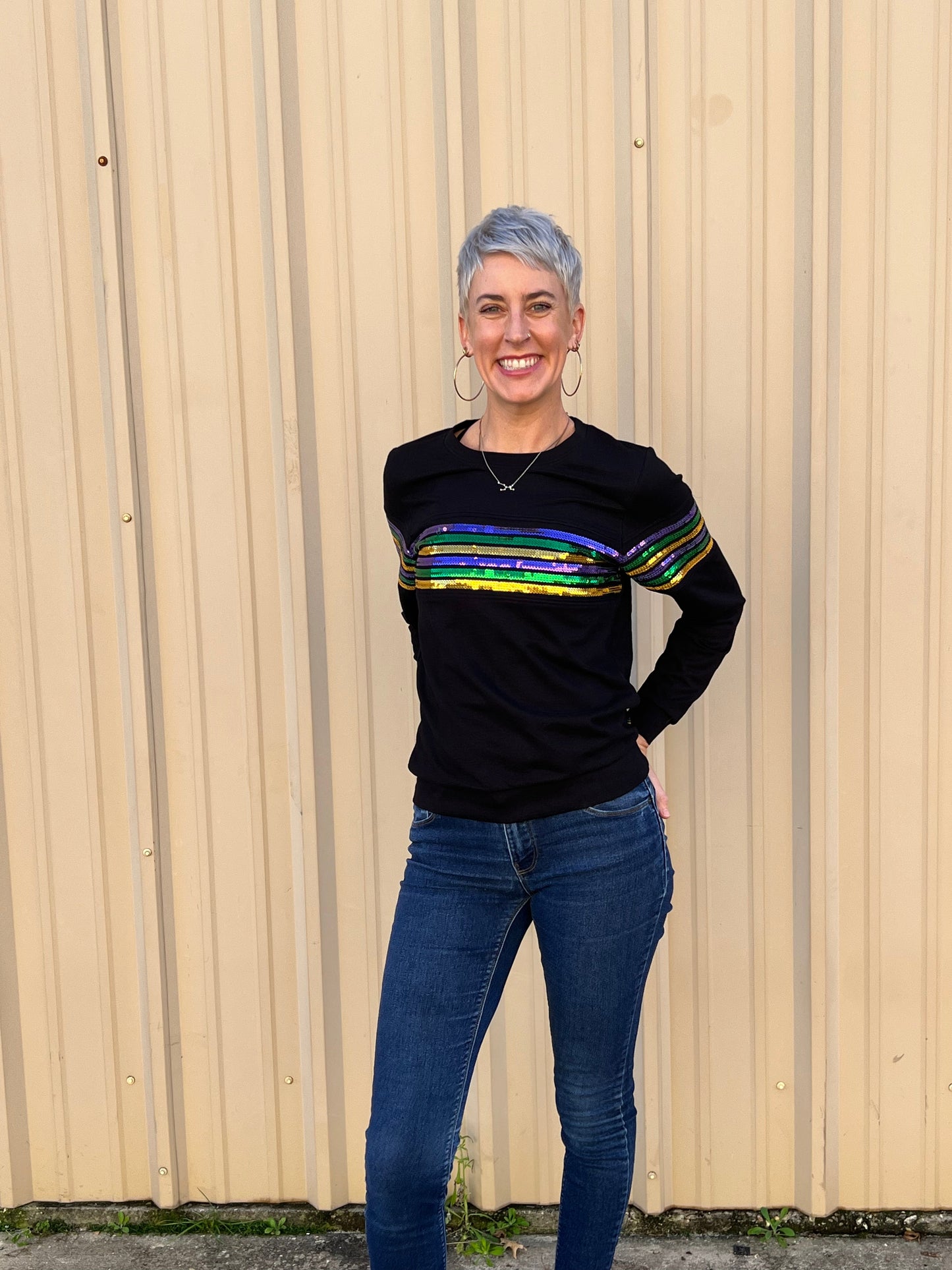 Cannot get enough of our sequin French Terry pullovers!! Celebrate Mardi Gras with this fabulous long sleeved top! This is french terry material with classic purple green & gold sequin stripes across the chest.