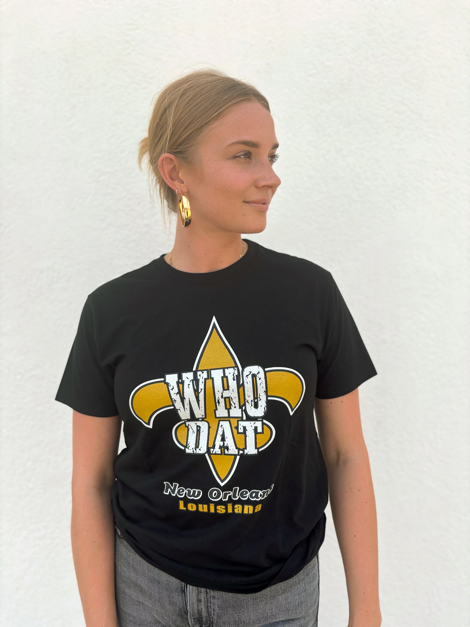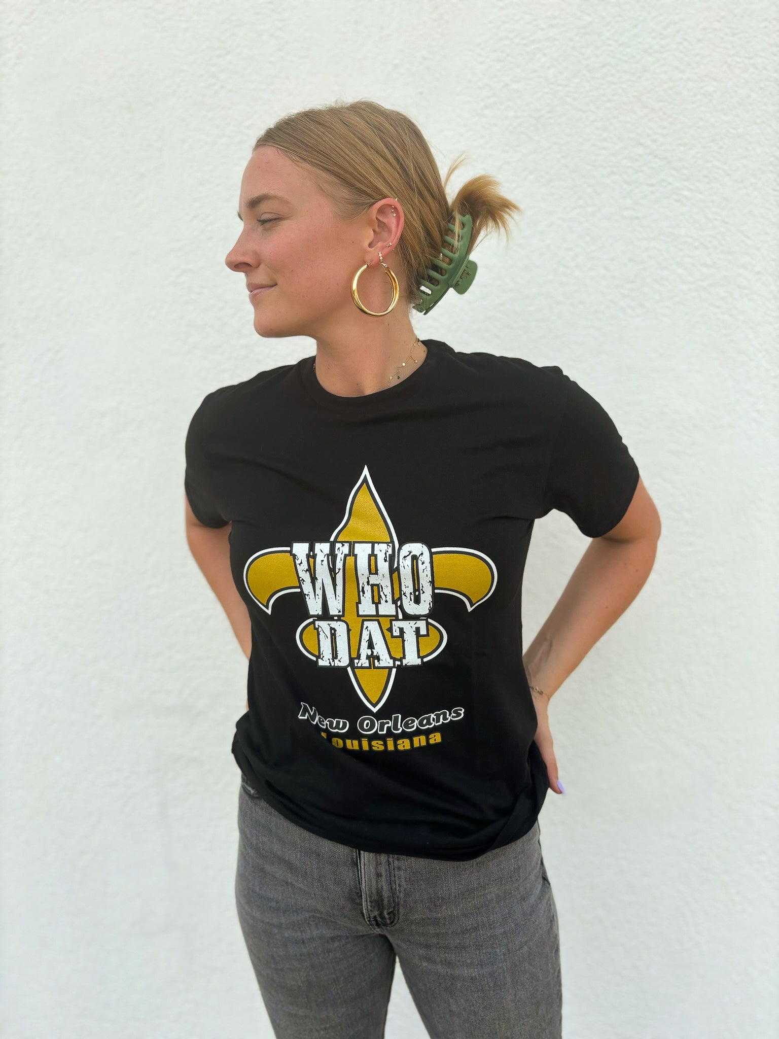 Who Dat in distressed white writing on top of Gold Fleur De Lis with New Orleans
