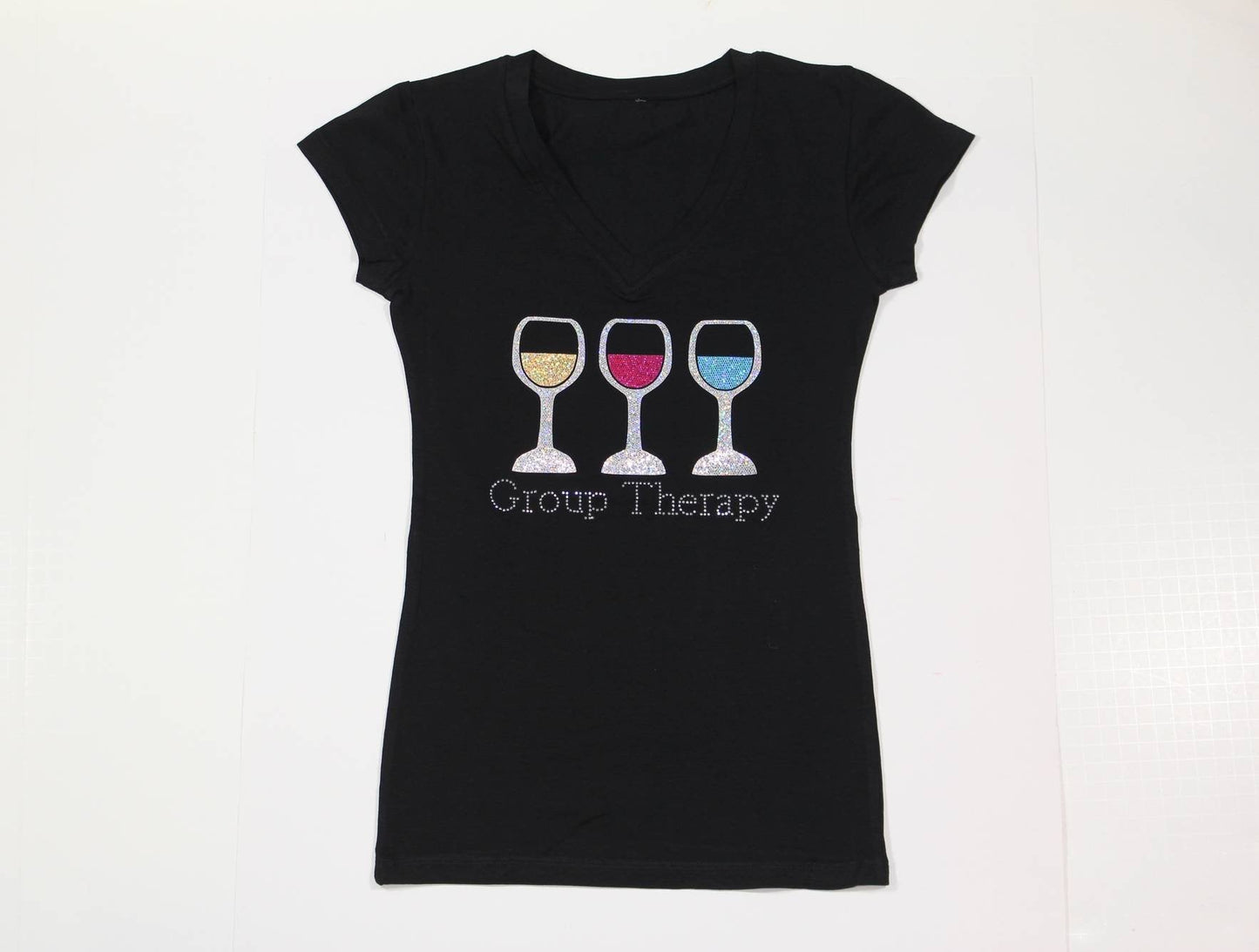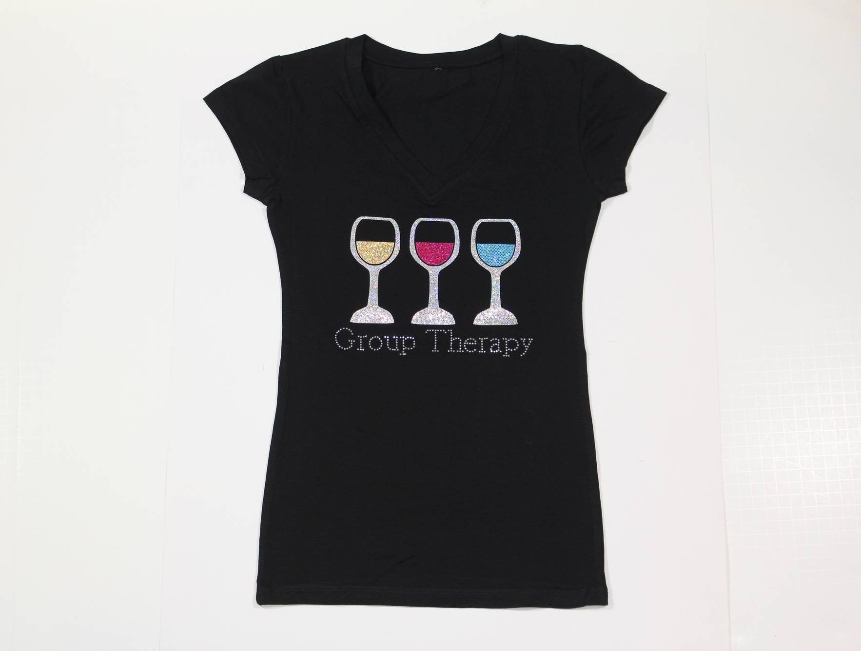 Group therapy is so helpful. This rhinestone shirt features 3 wine glasses with yellow, red and light blue liquid with the words "Group Therapy" beneath.