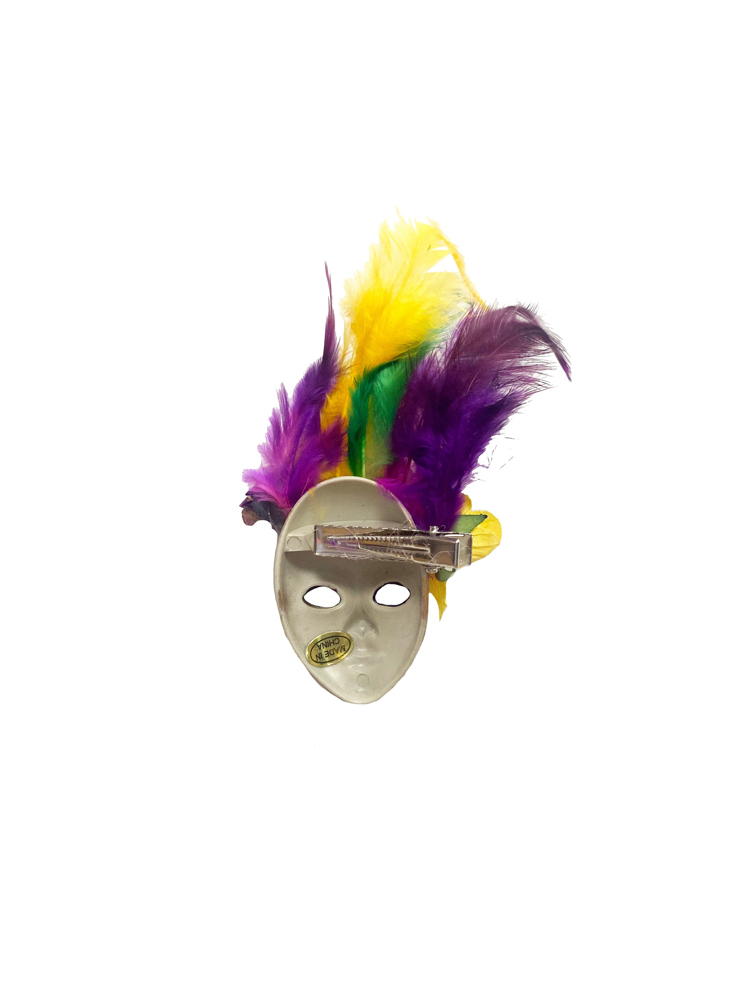 Unleash your inner party animal with the Hair Flair Pin Mask with Feathers and Flowers in festive purple, green, and gold. Clip it on and let the feathers do the talking. Perfect for Mardi Gras celebrations and adding a touch of mischief to any outfit. Let the fun begin!