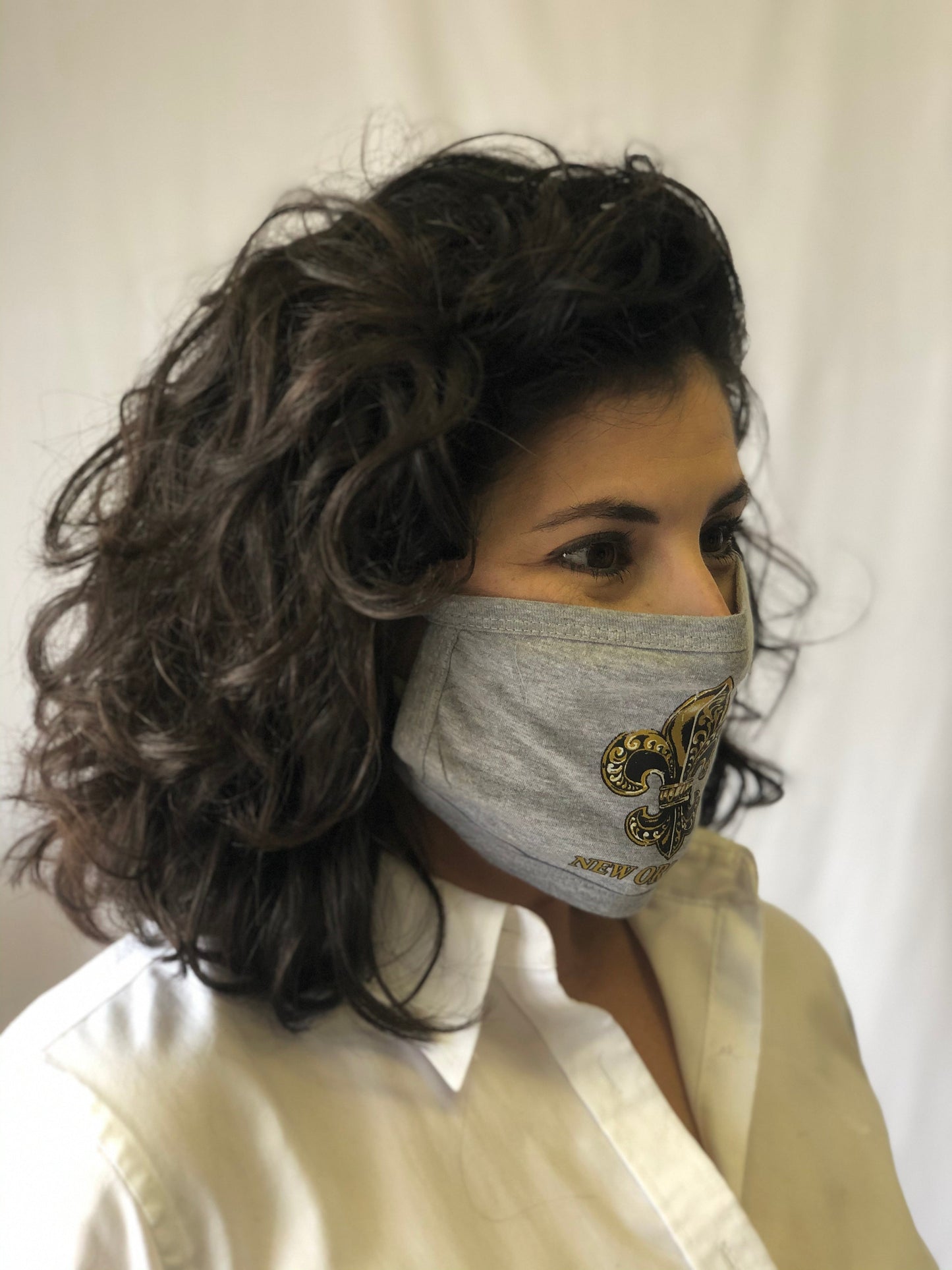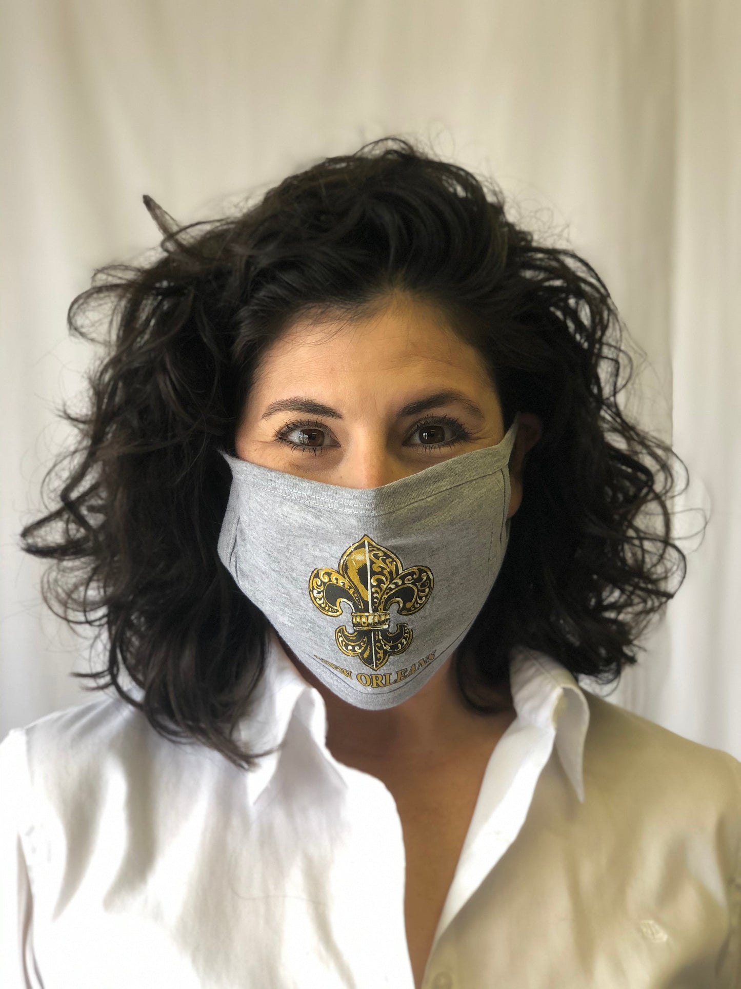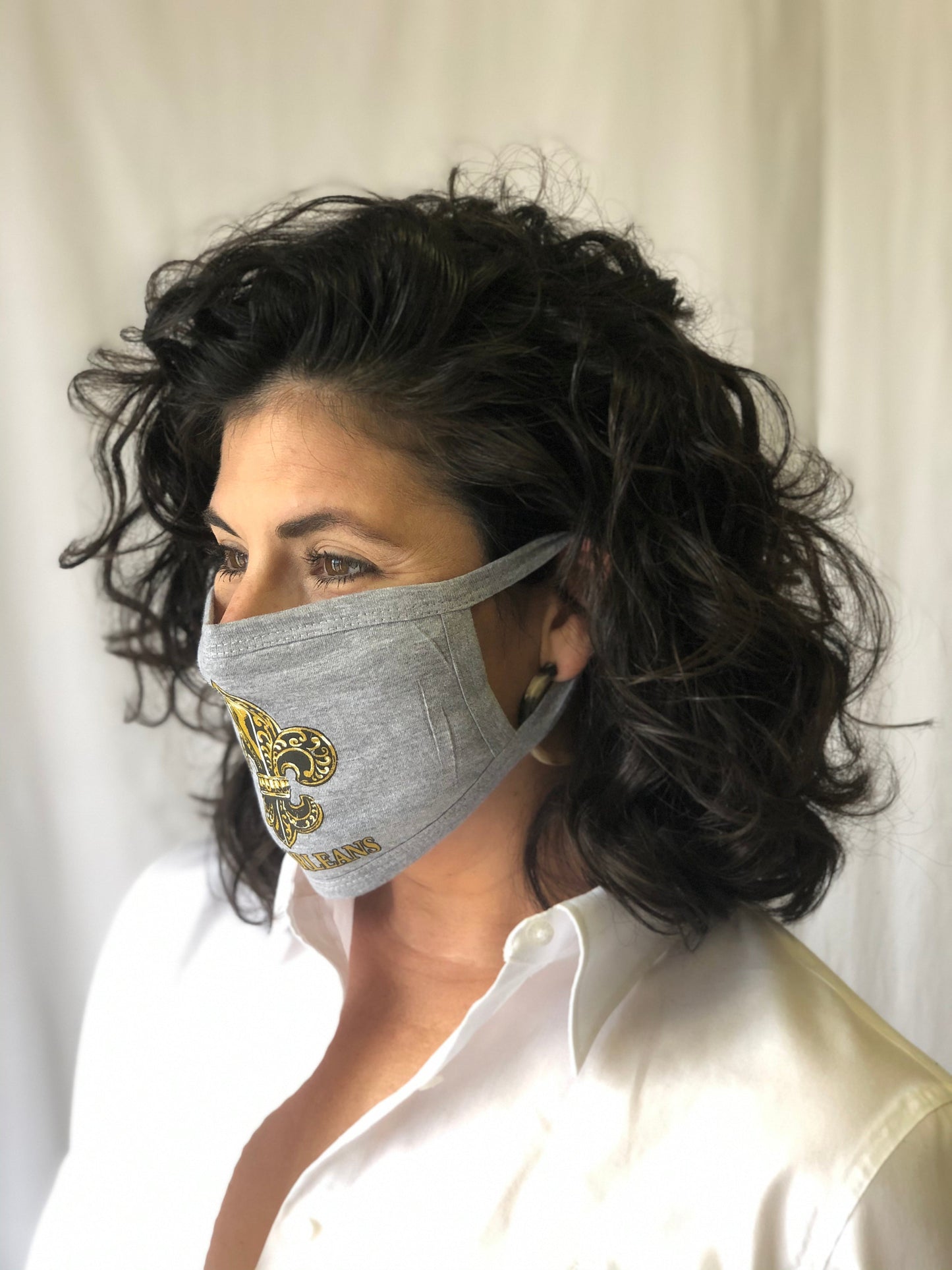 Mask Up in style! This grey reusable face mask features an intricate gold fleur de lis in the center and ear loops. One size fits most.