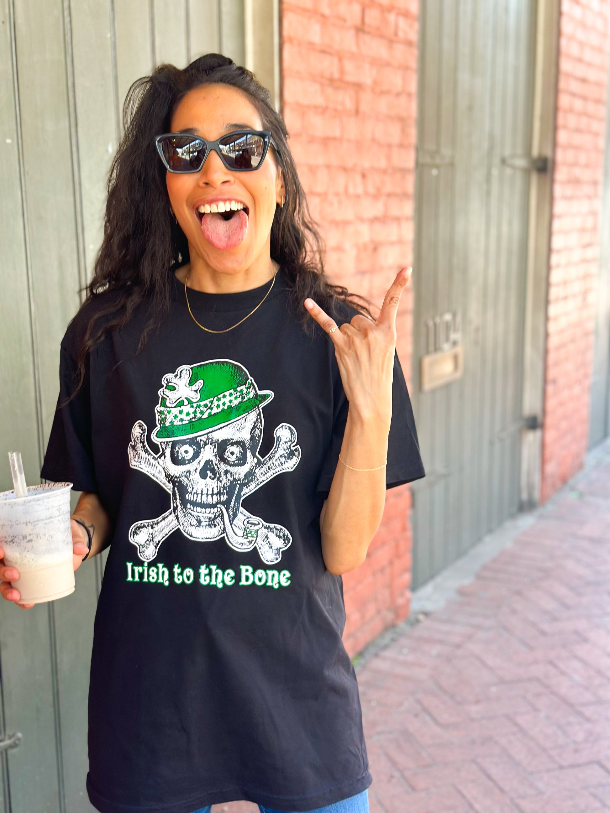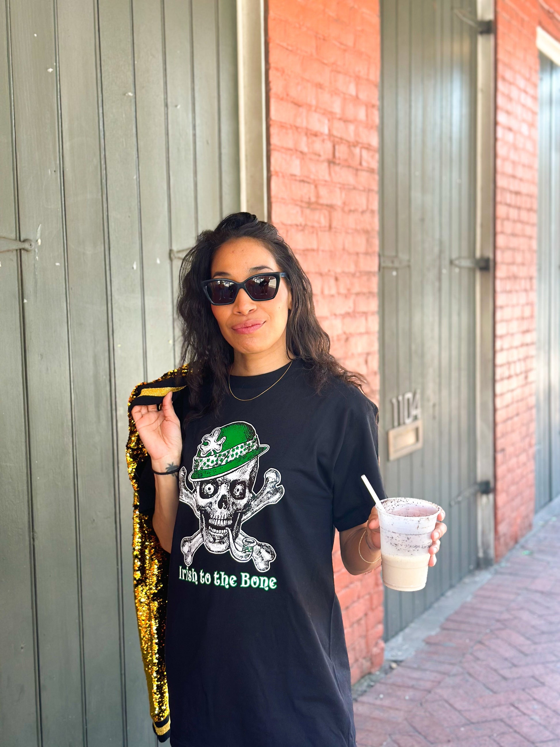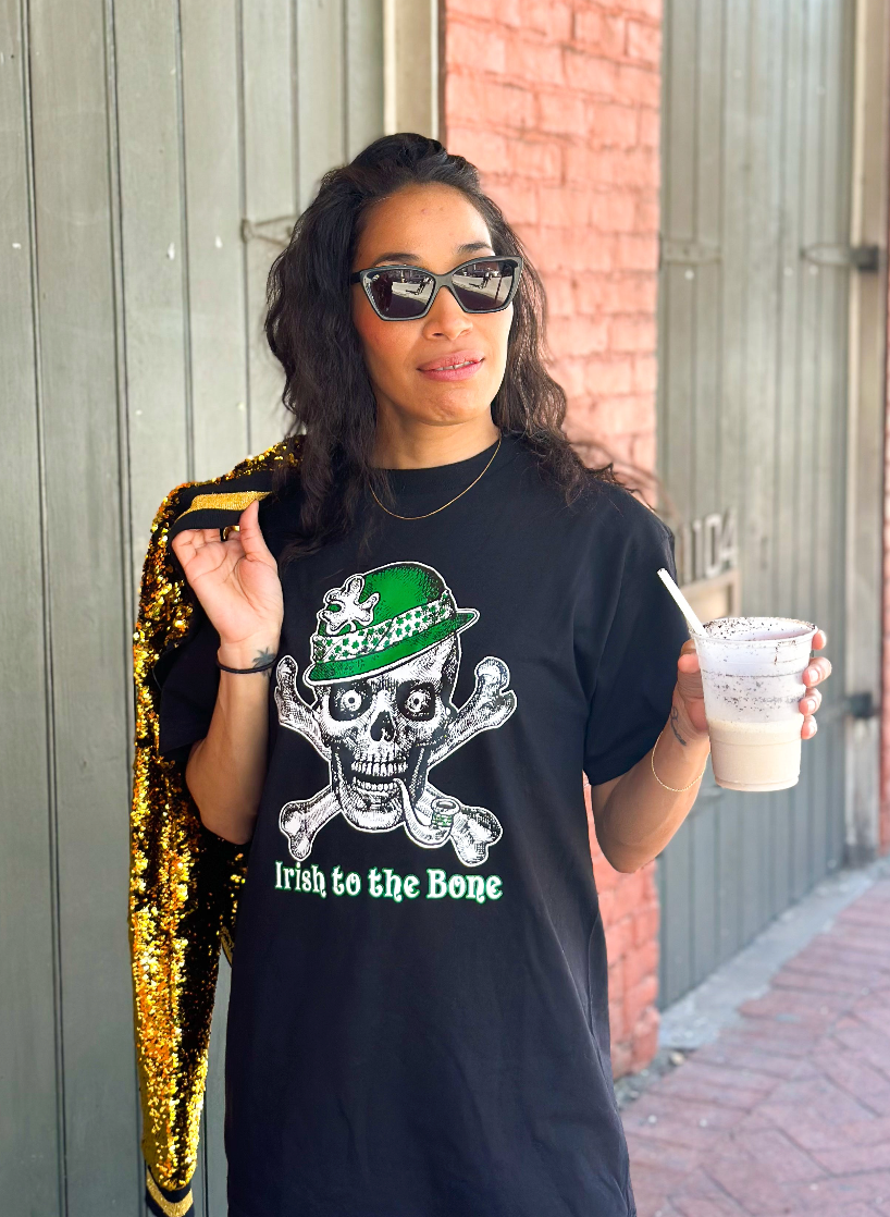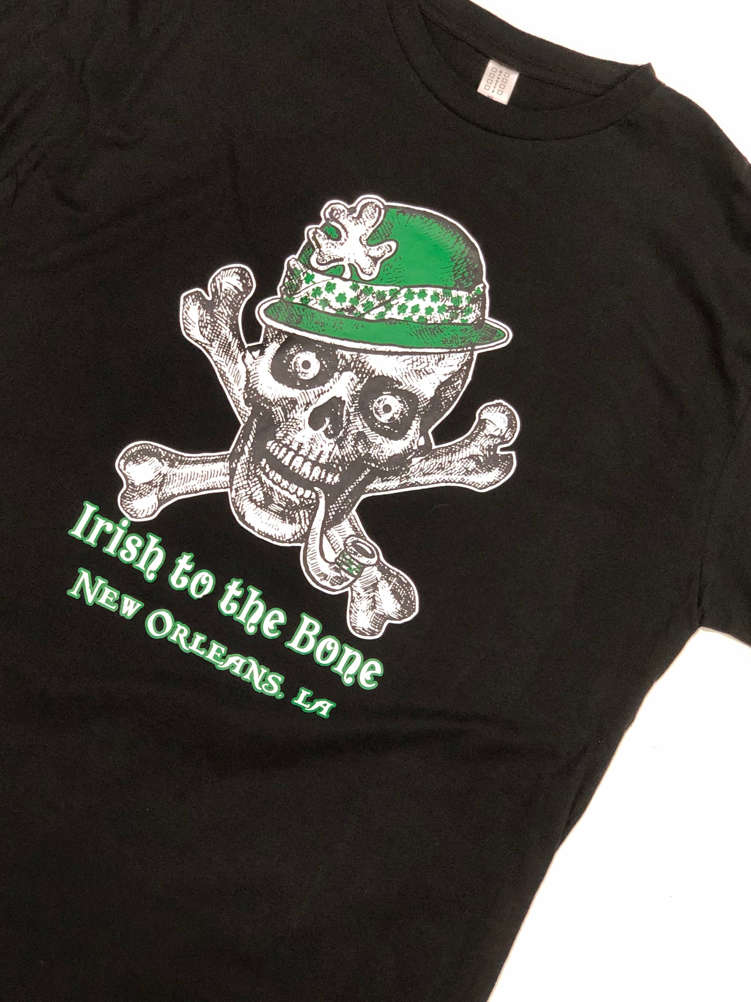 Get ready for St. Patty's Day! This t-shirt features a skull and crossbones wearing a festive St. Patrick's Day hat. The t-shirt reads "Irish to the Bone".