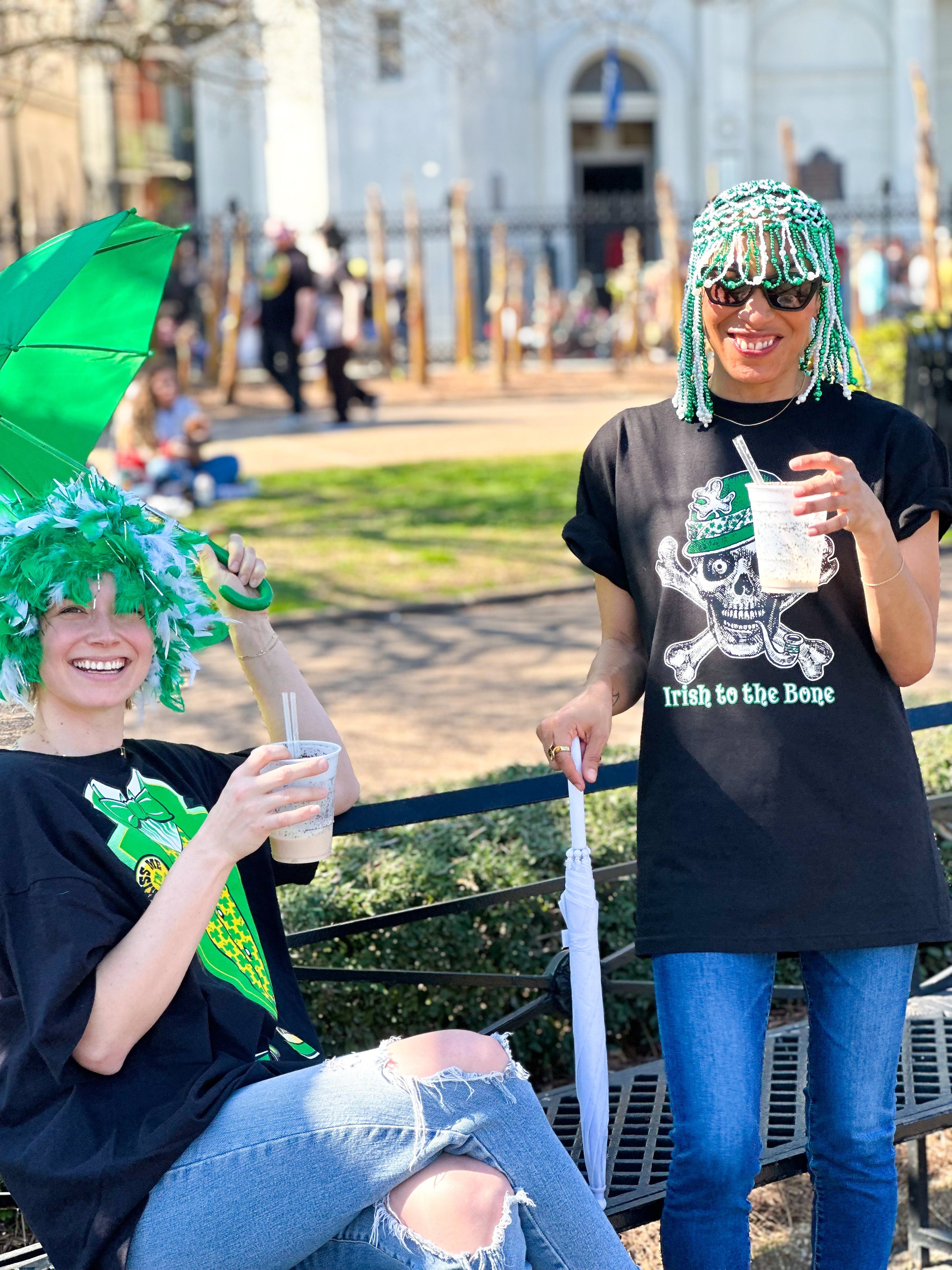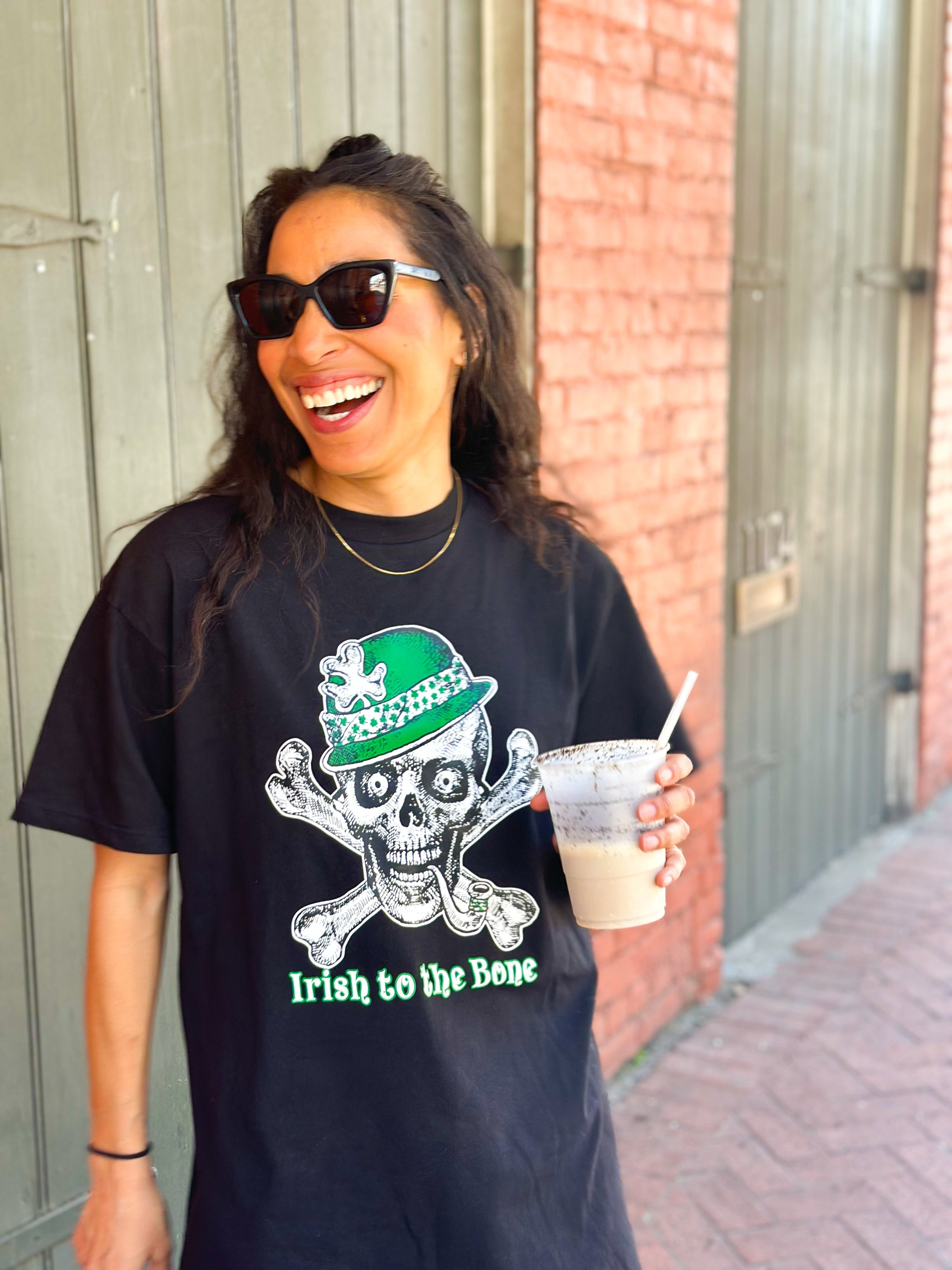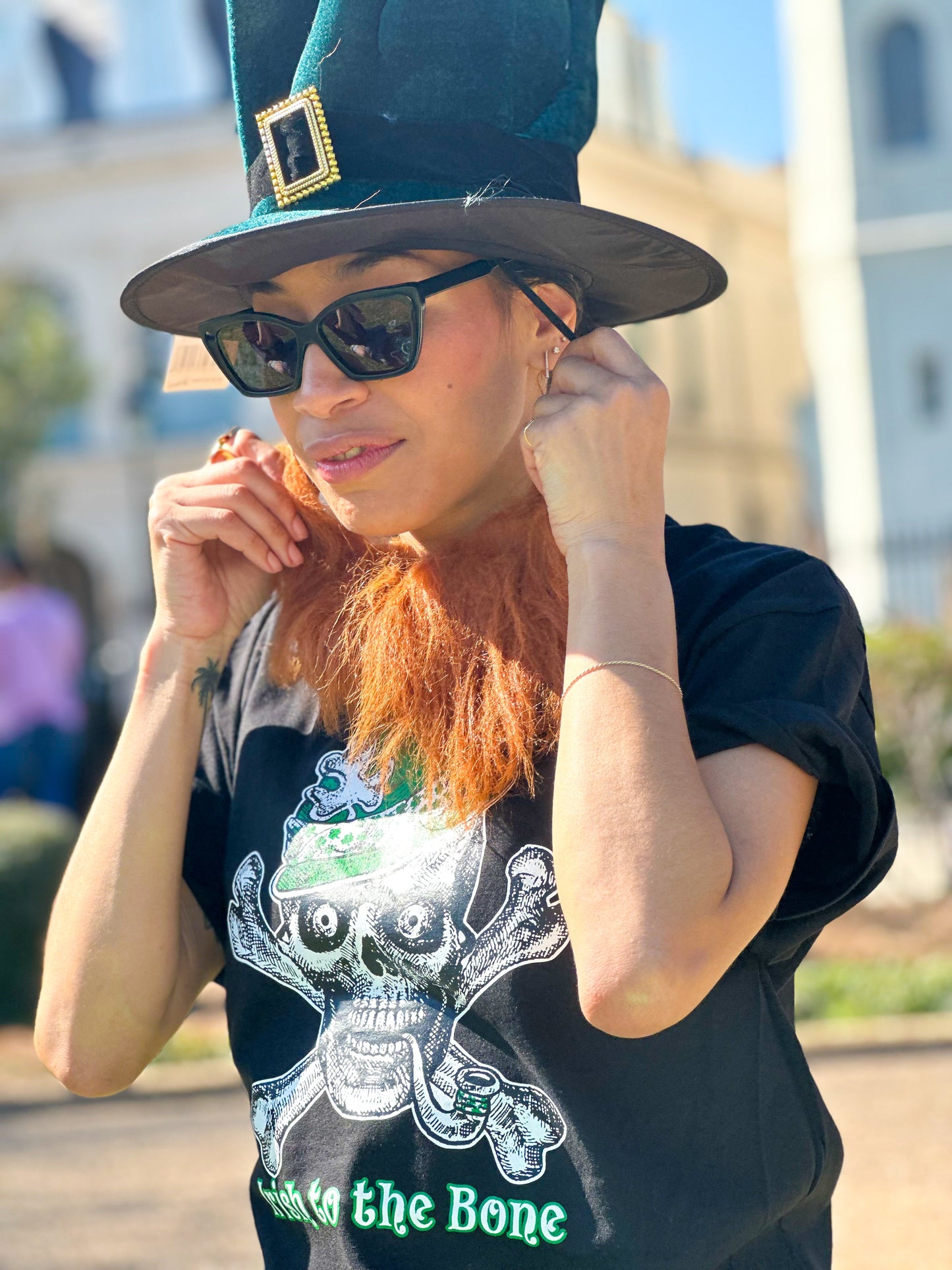 Get ready for St. Patty's Day! This t-shirt features a skull and crossbones wearing a festive St. Patrick's Day hat. The t-shirt reads "Irish to the Bone".