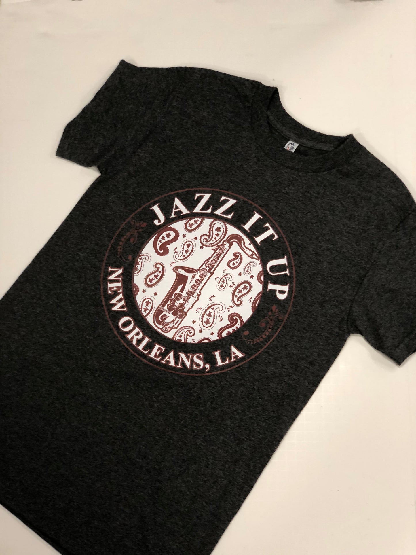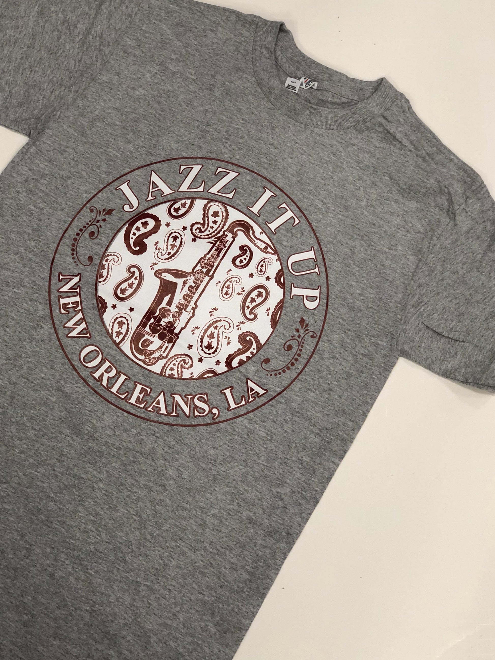 New Orleans is a city of music! This T-shirt features a saxophone in the center and reads "Jazz It Up"