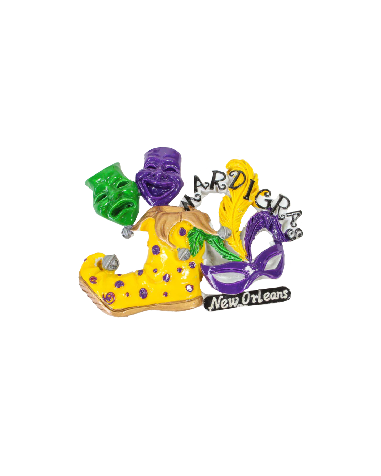 This magnet screams Mardi Gras! It features colorful jester boot with a mask and comedy and tragedy symbol and Mardi Gras New Orleans. Magnet is approximately 3" x 3".