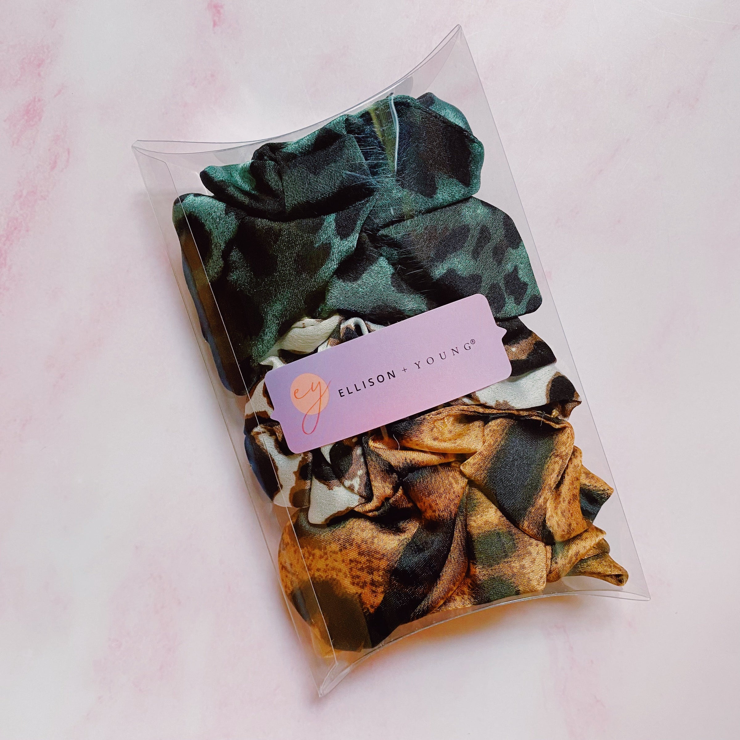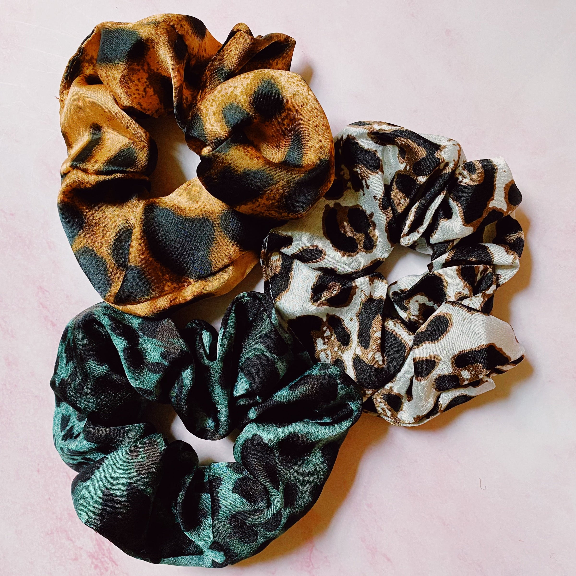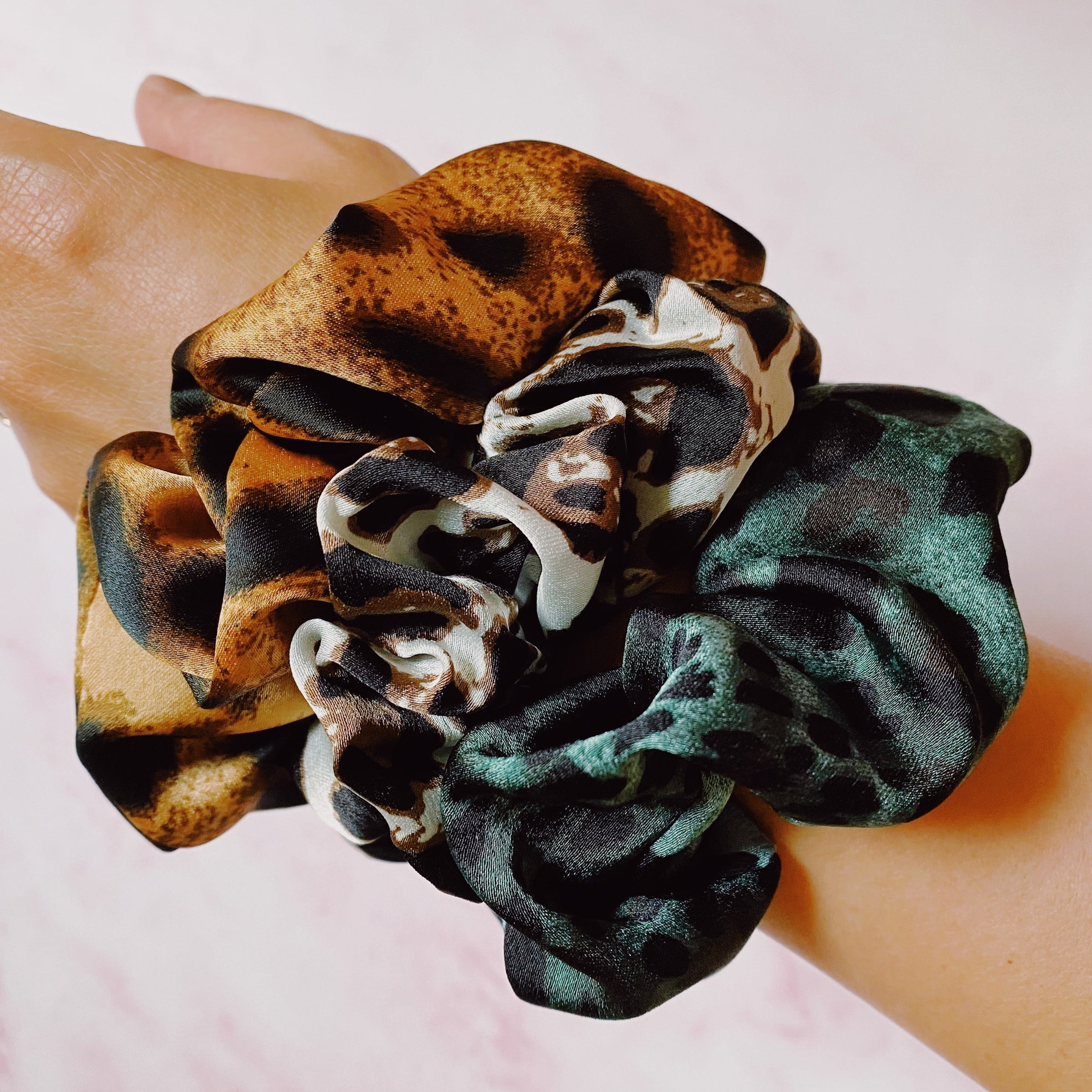 This Leopard Satin Scrunch Set of 3 is perfect for dressing up any hairstyle. The set includes 3 full-sized scrunches made of a luxuriously soft satin material, each in a trendy leopard pattern. These scrunches will add a touch of glamour to any look.