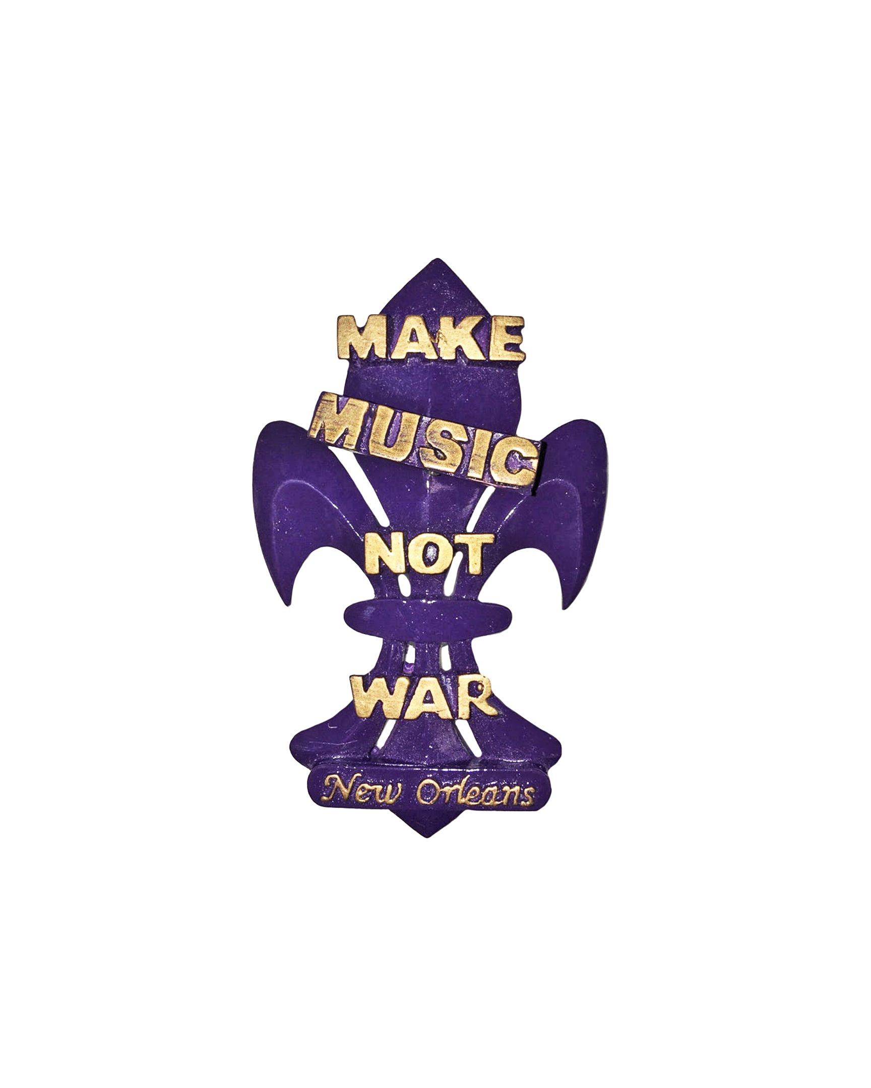 This Fleur de Lis magnet puts the music in the message. The fleur de lis is purple with raised gold writing that says "Make Music Not War" with New Orleans written at the bottom. Magnet is approximately 2 1/4" wide x 3 1/4" high