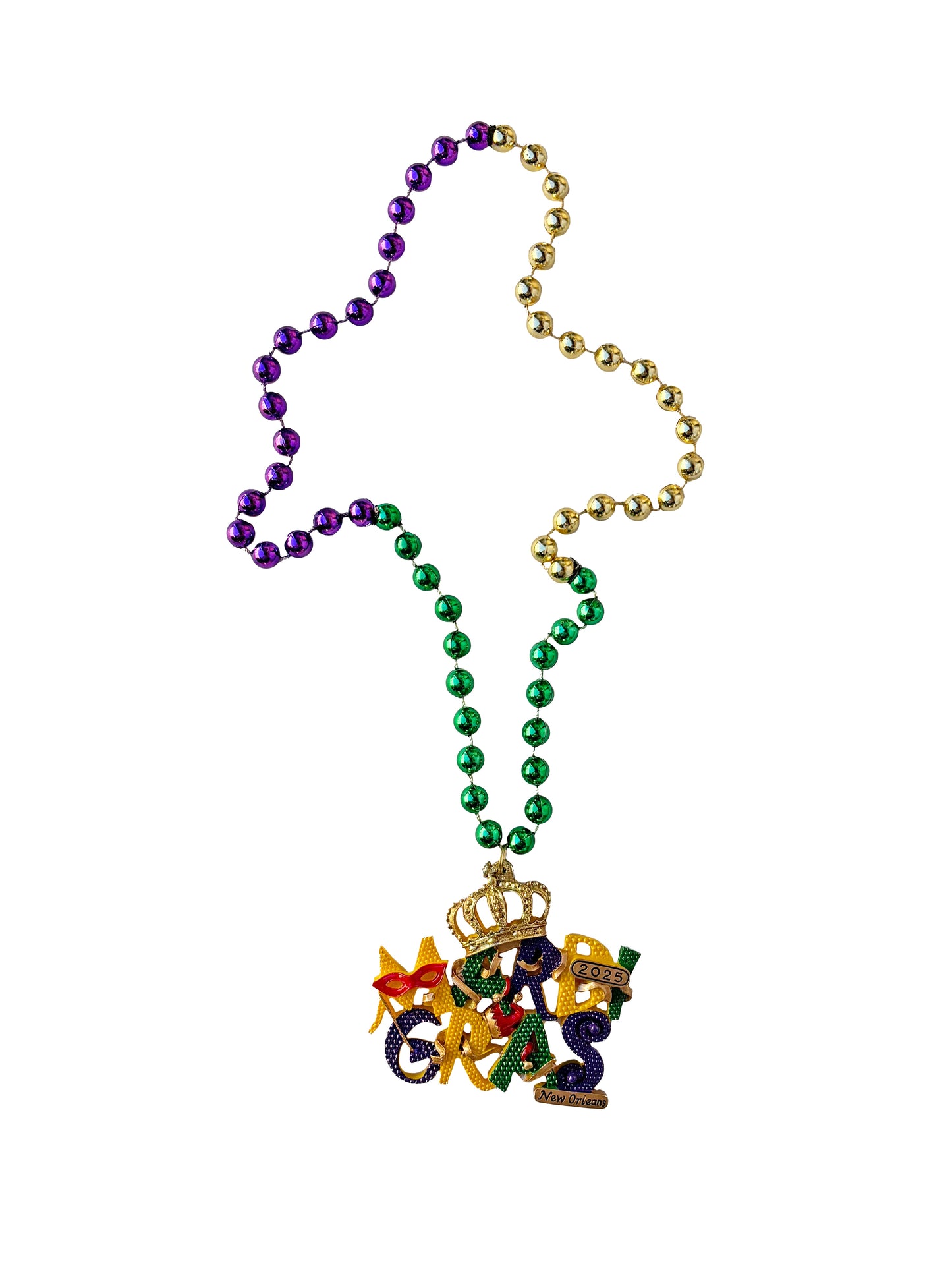 State your love of Mardi Gras with this limited addition bead with a fun colorful cut out. Mardi Gras is written out with Purple, Green and Gold lettering featuring fun accents of makes, crown, ribbons with New Orleans written out across the bottom. Medallion is approximately 3 1/2" wide x 3" high hung on a 42" long purple, green, and gold 12 mm strand of beads.