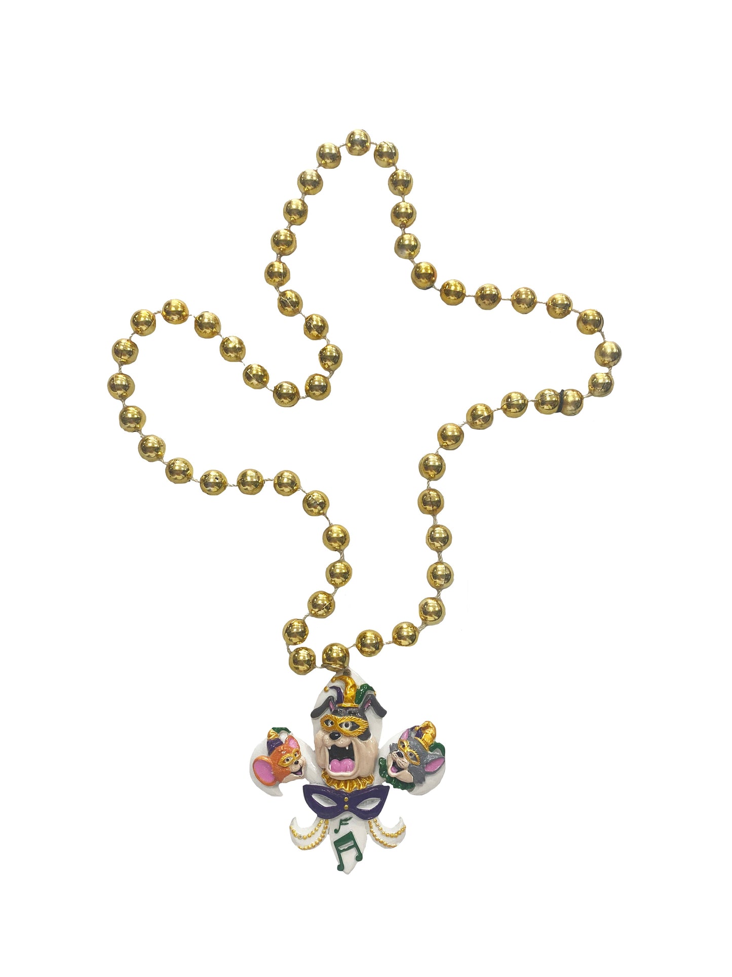 Make a grand entrance with this sure-fire showstopper! Our exclusive Mardi Gras Cartoon Cat and Mouse on Gold Specialty Bead is the purr-fect accessory for your festivities. Featuring a cartoon cat and mouse on a fleur de lis, you'll be the cat's meow of the party! Meow-za!