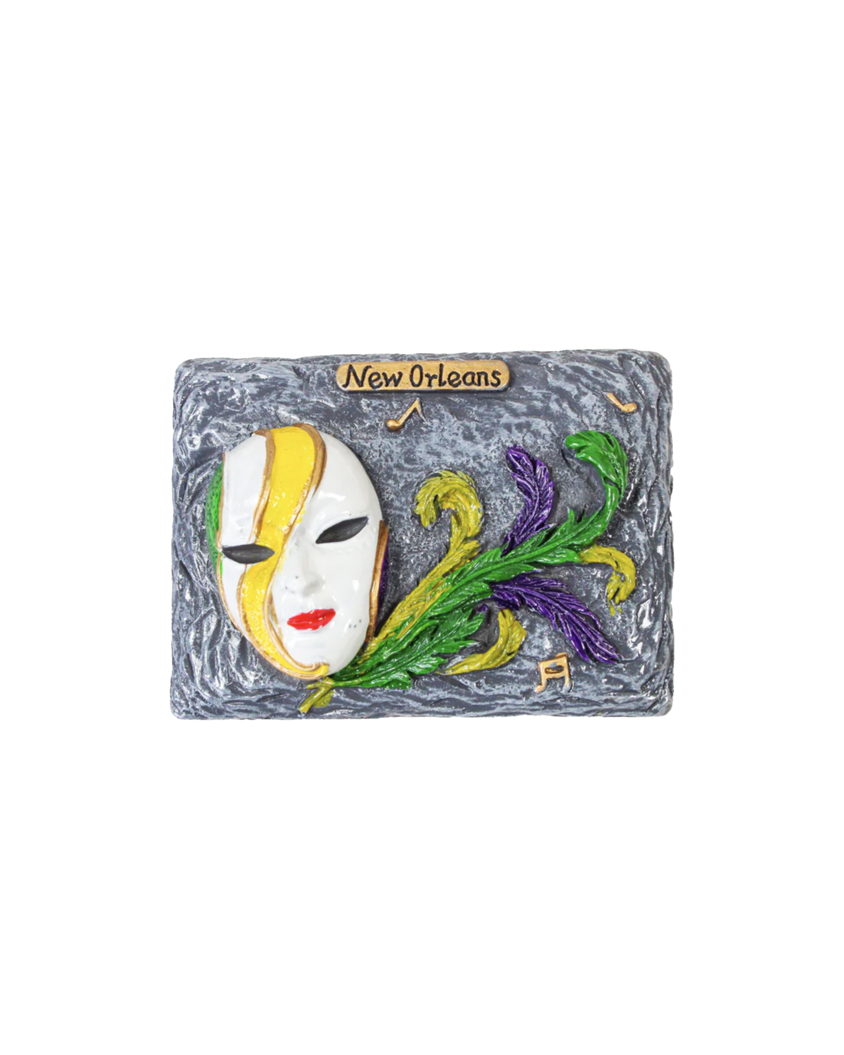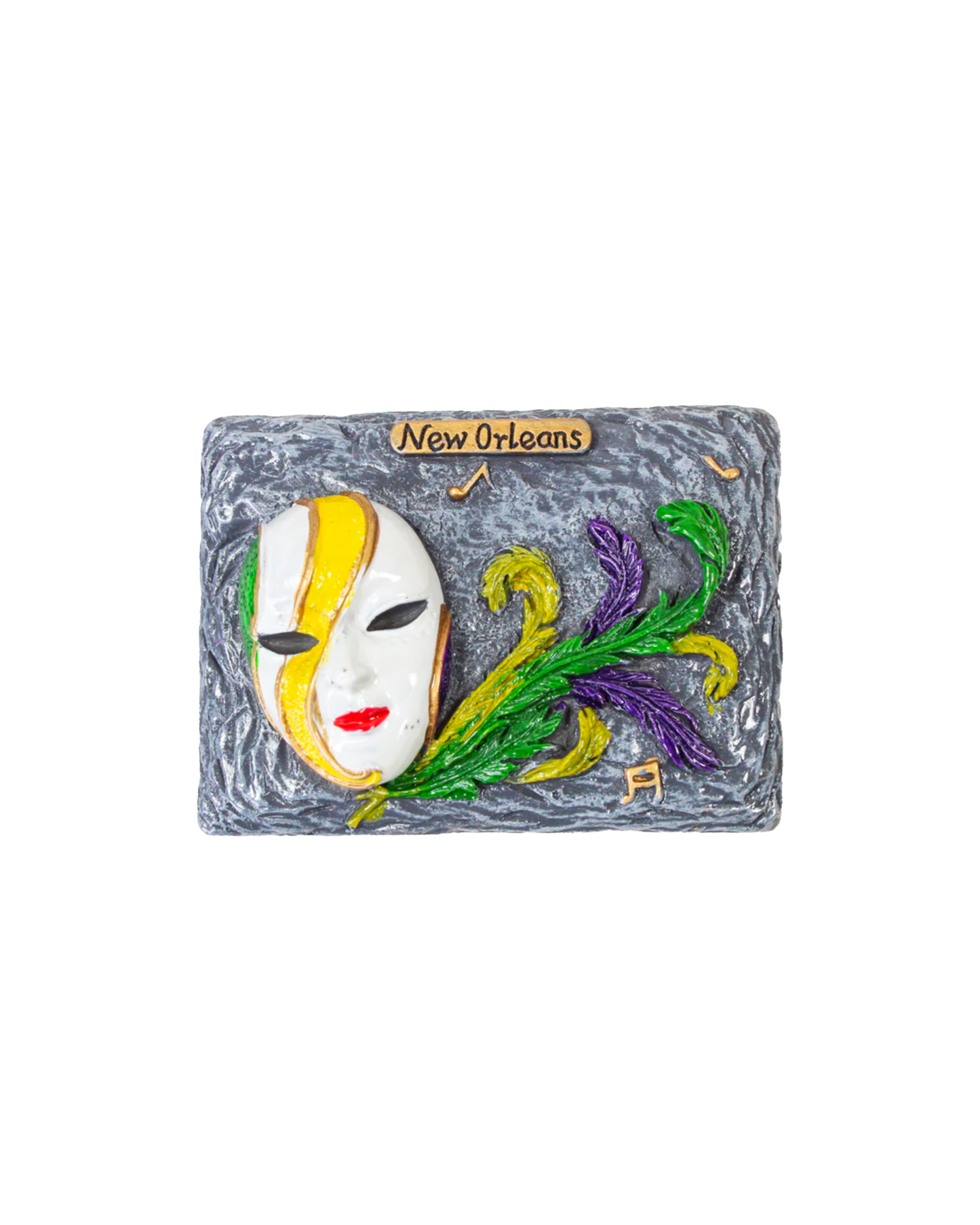 A slate background magnet with a mask and purple, green and gold feathers with New Orleans. Makes a great New Orleans themed gift!